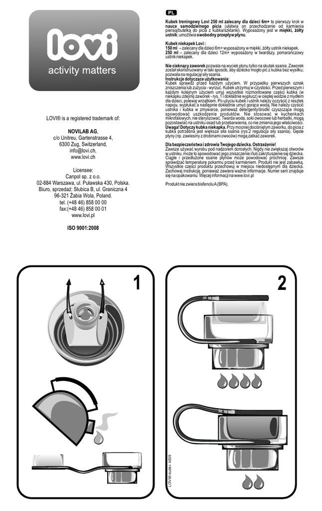 Kubek treningowy Lovi 250 ml zalecany dla dzieci 6m+ to pierwszy krok w nauce samodzielnego picia (u³atwia on przechodzenie od karmienia piersi¹/butelk¹ do picia z kubka/szklanki). Wyposa¿ony jest w miêkki, ¿ó³ty ustnik; umo¿liwia swobodny przep³yw p³ynu. Kubek niekapek Lovi : 150 ml – zalecany dla dzieci 6m+ wyposa¿ony w miêkki, ¿ó³ty ustnik niekapek, 250 ml – zalecany dla dzieci 12m+ wyposa¿ony w twardszy, pomarañczowy ustnik niekapek. Nie ciekn¹cy zaworek pozwala na wyciek p³ynu tylko na skutek ssania. Zaworek zosta³ skonstruowany w taki sposób, aby dziecko mog³o piæ z kubka bez wysi³ku; pozwala na regulacjê si³y ssania. Instrukcje dotycz¹ce u¿ytkowania: Kubek sprawdŸ przed ka¿dym u¿yciem. W przypadku pierwszych oznak zniszczenia lub zu¿ycia - wyrzuæ. Kubek utrzymuj w czystoœci. Przed pierwszym i ka¿dym kolejnym u¿yciem umyj wszystkie rozmontowane czêœci kubka (w niekapku zdejmij zaworek - rys. 1 i dok³adnie wyp³ucz) w ciep³ej wodzie z myd³em dla dzieci, polewaj wrz¹tkiem. Po u¿yciu kubek i ustnik nale¿y oczyœciæ z resztek napoju, wyp³ukaæ a nastêpnie dok³adnie umyæ gor¹ca wod¹. Nie nale¿y czyœciæ ustnika i kubka w zmywarce, poniewa¿ detergenty/œrodki czyszcz¹ce mog¹ spowodowaæ uszkodzenie produktów. Nie stosowaæ w kuchenkach mikrofalowych, nie sterylizowaæ. Twarda woda, soki owocowe lub herbatki, mog¹ pozostawiaæ na ustniku osad lub przebarwienia, co nie zmienia jego w³aœciwoœci. Uwaga! Dotyczy kubka niekapka. Przy mocniej dociœniêtym zaworku, do picia z kubka potrzebna jest wiêksza si³a ssania (rys.2 regulacja si³y ssania). Gêste p³yny (np. zawiesiny z drobinami owoców) mog¹ zatkaæ zaworek. LOVI® is a registered trademark of: NOVILAB AG, c/o Unitreu, Gartenstrasse 4, 6300 Zug, Switzerland, [email protected], www.lovi.ch Dla bezpieczeñstwa i zdrowia Twojego dziecka. Ostrze¿enie! Zawsze u¿ywaæ wyrobu pod nadzorem doros³ych. Nigdy nie zwiêkszaj otworów w ustniku, mo¿e to spowodowaæ jego zniszczenie i/lub zakrztuszenie siê dziecka. Ci¹g³e i przed³u¿one ssanie p³ynów mo¿e powodowaæ próchnicê. Zawsze sprawdzaæ temperaturê pokarmu przed karmieniem. Produkt nie jest zabawk¹. Wszystkie czêœci produktu przechowuj w miejscu niedostêpnym dla dziecka. Zachowaj instrukcjê, poniewa¿ zawiera wa¿ne informacje. Numer serii znajduje siê na opakowaniu. Wiêcej informacji na www.lovi.pl Licensee: Canpol sp. z o.o. 02-884 Warszawa, ul. Pu³awska 430, Polska. Biuro, sprzeda¿: S³ubica B, ul. Graniczna 4 96-321 ¯abia Wola, Poland. tel. (+48 46) 858 00 00 fax:(+48 46) 858 00 01 www.lovi.pl Produkt nie zwiera bisfenolu A (BPA). ISO 9001:2008 1 LOVI®-kubki- k009 2