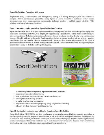 SportDefinition Creation 485 gram Suplement diety - uniwersalny stak kreatynowy oparty o 4 formy kreatyny plus beta alanina i tauryna. Jeżeli poszukujesz produktu, który łączy w sobie wszystkie najlepsze cechy stacka kreatynowego przy jednoczesnym zachowaniu dobrego smaku – trafiłeś wręcz idealnie! Taki właśnie jest SportDefinition Creation. Opis i charakterystyka produktu SportDefinition Creation Sport Definition CREATION jest suplementem diety najwyższej jakości. Zawiera tylko i wyłącznie skuteczne substancje aktywne, bez zbędnych wypełniaczy i dodatków! Jest to stack kreatynowy, w którym znajdziesz 4 skuteczne i silnie anaboliczne formy kreatyny, solidną dawkę beta alaniny oraz tauryny. Dzięki takiemu połączeniu Twój organizm będzie w stanie wznieść się na wyżyny swoich możliwości już po krótkim okresie suplementacji. Kreatyna jest znana od przeszło 20 lat i jest z powodzeniem stosowana w niemal każdym rodzaju sportu. Aktualnie należy ona do najsilniejszych anabolików, który w dodatku jest w pełni legalny. • • • • • • Zalety odżywki kreatynowej SportDefinition Creation: zaawansowany stack kreatynowy zawiera jedynie najlepsze formy chemiczne kreatyny niezwykle anaboliczny produkt w pełni legalny oraz bezpieczny zapewnia niespodziewane przyrosty masy mięśniowej oraz siły idealny produkt na udany cykl kreatynowy Sposób działania i zastosowanie odżywki Creation SportDefinition Sport Definition CREATION nie jest produktem o przypadkowym składzie, powstał specjalnie z myślą o profesjonalnym wsparciu sportowców w ich walce o jak najlepsze rezultaty. Znajdująca się w składzie beta alanina jest bardzo ciekawym dodatkiem do kreatyny, dzięki któremu cykl będzie skutkował znacznie lepszymi efektami niż w standardowych warunkach. Została ona wielokrotnie przebadana zarówno pod kątem skuteczności jak i bezpieczeństwa. Nawet długa suplementacja tym związkiem nie stanowi zagrożenia dla zdrowia. Udowodniono natomiast, że ma ona niesamowity wpływ na wydolność mięśni. Zbadano to między innymi na podstawie osiąganych przez sprinterów czasy – udało się skrócić je nawet o 5-6 sekund! Oczywiście przy zastosowaniu grup placebo dla zachowania należytych warunków eksperymentu. Jej działanie polega na podniesieniu poziomu karnozyny w mięśniach, która odpowiada za utrzymanie równowagi kwasowo-zasadowej, jest swoistym buforem. Każdy skurcz mięśni przyczynia się do zachwiania wspomnianej równowagi, którą utrzymuje właśnie karnozyna – jednak jej zapasy są relatywnie niewielkie i po niedługim czasie dochodzi do ich wyczerpania co skutkuje osłabieniem skurczu mięśni, a to uniemożliwia ich sprawną pracę i kontynuację treningu na 100%. Tak spektakularne wyniki sprawiły, że beta alanina jest idealnym dodatkiem do suplementacji i znakomicie nadaje się do stosowania jednocześnie z kreatyną – i ich połączenie pozwala na osiągnięcie znacznie lepszych efektów! Stosując Sport Definition CREATION zapewnisz sobie nie tylko większą wydolność treningową ale także znacznie lepsze treningi co będzie skutkowało szybszymi przyrostami tkanki mięśniowej oraz siły! Wykorzystaj tą możliwość i dołącz do najlepszych! Przemyślany skład sprawi, że będziesz notował lepsze efekty treningu niż w przypadku innych produktów. Skład SportDefinition Creation: Informacja żywieniowa Azotan kreatyny Jabłczan kreatyny Chlorowodorek kreatyny Monohydrat kreatyny Beta-alanina Tauryna 1 porcja (4,8 gram) 750 mg 750 mg 750 mg 750 mg 750 mg 250 mg 2 porcje (9,7 gram) 1500 mg 1500 mg 1500 mg 1500 mg 1500 mg 500 mg Skład: Azotan kreatyny, chlorowodorek kreatyny, jabłczan kreatyny, monohydrat kreatyny, aromaty, beta-alanina, tauryna, substancja przeciwzbrylająca (dwutlenek krzemu), substancja słodząca (sukraloza), barwniki (beta-karoten, koszenila). Opis i charakterystyka preparatu sportowego Creation: • 1 porcja = 4,8 gram odżywki typu matrix kreatyn • Ilość porcji w opakowaniu: 50 • Zawartość opakowania: 485 gram uniwersalnej kreatyny Dawkowanie formuły kreatynowej Creation od SportDefinition. Zalecane spożycie: wymieszać 1 miarkę (4,8 gram) odżywki z 150 ml zimnej wody. Spożywać przed i po treningu. Dawkowanie Creation od SportDefinition w dni treningowe i nietreningowe: • Dni treningowe: 1 porcja przed treningiem, 1 porcja po treningu. • Dni nietreningowe: 1 porcja rano, 1 porcja po południu. Tutaj kupisz produkt: http://www.kulturystyka.sklep.pl/p/1140858657/SPORT-DEFINITION-Creation-485g/