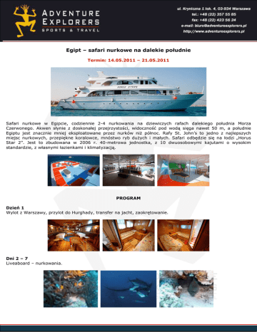 Egipt – safari nurkowe na dalekie południe Termin: 14.05.2011 – 21.05.2011 Safari nurkowe w Egipcie, codziennie 2-4 nurkowania na dziewiczych rafach dalekiego południa Morza Czerwonego. Akwen słynie z doskonałej przejrzystości, widoczność pod wodą sięga nawet 50 m, a południe Egiptu jest znacznie mniej eksploatowane przez nurków niż północ. Rafy St. John’s to jedno z najlepszych miejsc nurkowych, przepiękne koralowce, mnóstwo ryb dużych i małych. Safari odbędzie się na łodzi „Horus Star 2”. Jest to zbudowana w 2006 r. 40-metrowa jednostka, z 10 dwuosobowymi kajutami o wysokim standardzie, z własnymi łazienkami i klimatyzacją. PROGRAM Dzień 1 Wylot z Warszawy, przylot do Hurghady, transfer na jacht, zaokrętowanie. Dni 2 – 7 Liveaboard – nurkowania. 1 Dzień 8 Wyokrętowanie, transfer na lotnisko w Hurghadzie, wylot do Warszawy. W razie potrzeby punkty programu mogą być zmienione, a cena ponownie skalkulowana. Program może także być zmodyfikowany w zależności od opcji przelotu międzynarodowego. CENA WYNOSI: 730 EUR / osobę + przelot (ok. 1500,- zł) CENA • • • • • • • • • • ZAWIERA: transport z lotniska do portu i z powrotem; safari na łodzi 6 dni / 7 nocy; nurkowanie 6 dni (zazwyczaj 2 – 4 nurkowania dziennie); butle 12l, balast; zakwaterowanie w kajutach dwuosobowych; pełne wyżywienie; napoje bezalkoholowe (woda, kawa, herbata, Cola, Sprite); ubezpieczenie biura podróży – KL, NNW, bagaż; opiekę przedstawiciela biura podróży; opiekę instruktorów i przewodników pod wodą. CENA • • • • • • • • NIE ZAWIERA: biletu lotniczego na trasie Warszawa – Hurghada – Warszawa; wizy egipskiej płatnej po przylocie do Egiptu – 15 USD; napojów alkoholowych; wypożyczenia sprzętu nurkowego; dodatkowego ubezpieczenia nurkowego – komora (ok. 55 zł); zwyczajowych napiwków dla załogi – (ok. 25 EUR / 40 USD na osobę); opłaty reef protection fee (12 EUR); ew. opłat za nurkowanie w parkach. Informacje dodatkowe: EGIPT (Arabska Republika Egiptu) Stolica: Kair Waluta: funt egipski (EGP), 1 EGP = 100 piastrów; Język urzędowy: arabski WIZA, PRZEPISY WJAZDOWE. Między Polską a Egiptem obowiązuje ruch wizowy. Obywatel RP może przed przyjazdem do Egiptu ubiegać się o wizę w egipskim przedstawicielstwie dyplomatycznym lub otrzymać ją na lotnisku w Egipcie po opłaceniu 15 USD. Wizy turystyczne wystawiane są na pobyt 30-dniowy. Dopiero po wjeździe do Egiptu z wizą turystyczną można występować o wizę uprawniająca do pracy lub nauki. Paszport powinien być ważny przynajmniej o 6 miesięcy dłużej niż wiza. W razie uszkodzenia lub utraty paszportu należy zwrócić się do Wydziału Konsularnego Ambasady RP w Kairze o wydanie paszportu tymczasowego, a następnie wystąpić do lokalnego urzędu paszportowego o potwierdzenie wjazdu oraz wizę wyjazdową. Wiza taka jest wtedy ważna przez 7 dni. Bez takiej wizy nie można wyjechać z Egiptu. PRZEPISY CELNE. Egipskie przepisy celne nie odbiegają od przepisów ogólnie przyjętych w Europie. Podróżny wwożący do Egiptu rzeczy osobiste znacznej wartości (kamera, aparat fotograficzny) powinien starannie wypełnić deklarację celną i zadbać o to, aby została podstemplowana przez celnika. Wywóz z Egiptu bez zgody władz celnych większych ilości towarów, np. subsydiowanych leków, grozić może ich konfiskatą, a także grzywną. Wwiezienie do Egiptu walut obcych nie wymaga wypełnienia deklaracji celnej – pod warunkiem, że nie przekraczają one równowartości 10 tys. USD. Wywieźć można bez zgłaszania także najwyżej 10 tys. USD (lub równowartość w innych walutach) lub co najwyżej 5 tys. LE. Ograniczenia zastosowano również w odniesieniu do waluty miejscowej: opuszczając Egipt, turysta może wywieźć najwyżej 5 tys. EGP. Podróżnym indywidualnym, nie objętym specjalnymi umowami, nie przysługuje zwrot podatku VAT od zakupionych towarów. 2 PRZEPISY PRAWNE. Przemyt wszelkiego rodzaju narkotyków (w tym również marihuany), obrót nimi bądź ich zażywanie karane są nawet śmiercią. Za środek halucynogenny uważany jest również mak. MELDUNEK. Cudzoziemiec nie ma obowiązku zameldowania się, ale za to obowiązek zameldowania cudzoziemca spoczywa na właścicielu obiektu, w którym turysta się zatrzymuje. W hotelach zajmują się tym pracownicy recepcji, którzy dane z paszportu przekazują policji. W przypadku prywatnego wynajmu, podpisuje się stosowną umowę na wynajem z właścicielem budynku mieszkalnego, który zgłasza policji zamieszkanie cudzoziemca. Jeśli wynajem dotyczy krótkiego okresu czasu, np. tylko kilku dni, umowa nie musi być spisywana, choć właściciel zatrzymuje paszport, aby na policji zgłosić przebywanie cudzoziemca. Przy krótkich wynajmach paszport zatrzymywany jest przez właściciela przez cały czas wynajmu. Ważne jest więc aby dysponować jego kserokopią, zwłaszcza podczas wycieczek. UBEZPIECZENIE. Obowiązkowe jest ubezpieczenie zdrowotne. Należy mieć na uwadze, iż polskie firmy ubezpieczeniowe czasami kwestionują zasadność kosztów leczenia. Dlatego przed udaniem się do lekarza czy szpitala należy koniecznie skontaktować się telefonicznie z ubezpieczycielem (bez względu na porę) i skonsultować z nim plany leczenia. W sytuacji gdy tego nie zrobimy, a koszt leczenia zostanie zakwestionowany przez ubezpieczyciela, może się zdarzyć, że różnicę będziemy musieli zapłacić sami. SZCZEPIENIA, SŁUŻBA ZDROWIA. Nie ma też obowiązku szczepień ochronnych. Przebywając w Egipcie należy jednak przestrzegać zasad podwyższonej higieny: często myć ręce, pić wodę przegotowaną lub oryginalnie butelkowaną oraz dokładnie myć owoce i warzywa. Należy być szczególnie ostrożnym z jedzeniem i napojami zwłaszcza w pierwszych dniach pobytu, gdyż narażeni możemy być na zaburzenia żołądkowo-jelitowe potocznie określane mianem „zemsty faraona”
