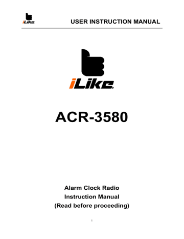 USER INSTRUCTION MANUAL ACR-3580 Alarm Clock Radio Instruction Manual (Read before proceeding) 1 USER INSTRUCTION MANUAL 1. ON/OFF: To turn unit on/off or switch AM/FM mode 2. TIME: Setting the clock PRESET: Memorization 3. P-: PRESET4. P+: PRESET+ 5. SLEEP: To fall asleep with the radio SNOOZE: Interval alarm repetition DIMMER: To set the display brightness HIGH/LOW 6.— Volume down ALARM I 7.+ Volume up ALARM 2 8. HR.: Hour setting ∨Tuning down 9. MIN.: Minute setting ∧Tuning up 10. AM radio indicator 11. ALARM I wake to buzzer indicator 12. ALARM I wake to radio indicator 13. ALARM 2 wake to buzzer indicator 14. ALARM 2 wake to radio indicator 2 USER INSTRUCTION MANUAL TURNING ON/OFF THE UNIT In standby mode, press “ON” button once to turn the FM radio on or switch to AM band. In radio mode, long press “OFF” button for 1-2 seconds to turn the radio off. SETTING THE TIME 1. In standby mode, press and hold “TIME” button, the display will flash. Set the time with “HR” hours and/or “MIN” minutes 2. Press “TIME” button again to confirm NOTE: - If during the adjustment time no key is activated in around 4 seconds, the current display will be automatically stored. LISTENING TO THE RADIO When the unit is ON, the corresponding Indicator lights up Manual search 1. Adjust the volume by “—” Volume down or “+” Volume up to the desired level. 2. Choose your radio station with -Tuning down or + Tuning up. Automatic search Press and hold “∨” Tuning down or “∧” Tuning up for 2 seconds. The automatic search locates strong stations. A station with a weak signal can be set manually by repeatedly pressing -Tuning down or + Tuning up. To enhance radio reception ability: FM: Extend the wire antenna or move another proper position. AM: Rotate the unit horizontally for optimum reception or move to another proper place. Preset stations This unit can store 10 FM and 10 AM stations. Long press and hold the “PRESET” button for around 4 seconds to start AUTO SCAN of radio station Manual storage: 1. Select a radio station manually or in automatic search. 2. Press and hold the “PRESET” button for around 1 second. 'P 01' blinks on the screen. 3. Press “P-“ or “P+” to select a channel. 4. Press the “PRESET” button to save it 5. Repeat steps 1-4 to store other stations Listen to station presets Press the “PRESET” button “P 01” blinks on the screen Press “PRESET” repeatedly to select your desired channel You can also press “P-“ or “P+” to select your desired channel SETTING THE ALARM AND THE ALARM MODE 3 USER INSTRUCTION MANUAL 1. In standby mode, press “ALARM 1” button to select the source of wake up to buzzer or radio, the corresponding indicator lights up. and the display blinks. 2. Press “HR” and/or “MIN” to set the time of wake up. 3. Press “ALARM 1” button to confirm Note: Same procedure applies for “Alarm 2” with “ALARM 2” button. STOPPING THE ALARM 1-Alarm repetition Press “SNOOZE” The alarm stops and will sound again 9 minutes later. 2-Alarm stop Press “OFF” or “ALARM I” button. The alarm will sound again the next day at the same time 3-Alarm Cancellation In standby mode, press “ALARM 1” button repeatedly to cancel the alarm permanently. The alarm indicator lights off Note: Same procedure applies for “Alarm 2” with “ALARM 2” button. SLEEP FUNCTION To fall asleep with the radio, press “ON” button once to turn the unit on, then press “SLEEP” button to select 90-80-70-60-50-40-30-20-10-OFF minutes of listening. The unit will automatically turn off after the specified time To cancel the sleep function, press the “SLEEP” time to OFF TECHNICAL SPECIFICATIONS POWER SUPPLY: AC DC 230V~50Hz 3V VDE plug 2x1.5V, battery type AAA size (not provided) for back up. RADIO FREQUENCY : FM 87.5-108MHz AM 522-1620kHz DIMENSION: 148(L) x 63(W) x 82(H) mm MORE INFORMATION CAUTION: To reduce the risk of electric shock, do not open the device, there is no party inside for the user. Refer all servicing to qualified personnel. The lightning with the arrow symbol in the triangle is a warning sign alerting the user to "dangerous voltage" inside the unit. The exclamation point in the triangle is a warning sign alerting the user of important instructions accompanying the product. 4 USER INSTRUCTION MANUAL IMPORTANT - The use of apparatus in moderate climates. -The Marking plate is located at the bottom of the device. - Make sure to have a minimum distance of 5 cm around the unit for sufficient ventilation. - Ensure that the ventilation openings is not covered with items such as newspapers, tablecloths, curtains, etc. - Do not place naked flame sources, such as lighted candles on the apparatus. - Do not expose this appliance to dripping or splashing water. - Do not place objects filled with liquids, such as glass, vase on the device. - Do not throw batteries into fire! Respect the environment when disposing of used batteries. - Batteries should not be exposed to excessive heat such as sunshine, fire or other similar heat source. - The power plug is used as a disconnect device and must be easily accessible. To be completely disconnected from the power, the plug of the appliance should be disconnected completely. The socket must not be obstructed and should be easily accessible during intended use. - Under the influence of fast transient and / or electrostatic electric phenomenon, the product may malfunction and the user must perform a power reset of the device If in the future, you need to get rid of this product, please note that Waste electrical products should not be disposed of with household waste. Recycling facilities exist. Check with your municipality or ask your dealer for advice. (Directive for Waste Electrical and Electronic Equipment) 5 Felhasználói kézikönyv ACR-3580 Rádiós ébresztőóra (Olvassa el használat előtt) Letölthető PDF formátum: http://hu.akai-atd.com/haszna