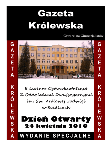 Gazeta Królewska Otwarci na Gimnazjalistów G A Z E T A G A Z E T A K II Liceum Ogólnokształcące R Z Oddziałami Dwujęzycznymi Ó im. Św. Królowej Jadwigi L w Siedlcach E W Dzień Otwarty S 24 kwietnia 2010 K A WYDANIE SPECJALNE K R Ó L E W S K A GAZETA KRÓLEWSKA REKRUTACJA 2010/2011 II LICEUM OGÓLNOKSZTAŁCĄCE Z ODDZIAŁAMI DWUJĘZYCZNYMI IM. ŚW. KRÓLOWEJ JADWIGI W SIEDLCACH Oferta dla absolwentów gimnazjum Planowana liczba klas pierwszych w roku szkolnym 2010/2011 Klasa Kierunek kształcenia Przedmioty rozszerzone Języki obce ** Liczba uczniów matematyka angielski fizyka niemiecki/francuski/rosyjski/włoski j. angielski/j. niemiecki* Ia Klasa matematyczno - fizyczna 30 Ib Klasa matematyczno - informatyczna matematyka fizyka informatyka angielski niemiecki/francuski/rosyjski/włoski 30 Ic Klasa medyczna biologia chemia fizyka angielski niemiecki/francuski/rosyjski/włoski 30 Id Klasa dziennikarska język polski historia WOS angielski niemiecki/francuski/rosyjski/włoski 30 matematyka angielski geografia niemiecki/francuski/rosyjski/włoski j. angielski/j. niemiecki* 30 Ie Klasa ekonomiczna If Klasa geograficzno - społeczna dwujęzyczna język angielski geografia matematyka angielski niemiecki/francuski/rosyjski/włoski 30 Ig Klasa akademicka matematyka biologia chemia angielski niemiecki/francuski/rosyjski/włoski 30 j. angielski/j. niemiecki* angielski historia niemiecki/francuski/rosyjski/włoski język polski 30 Ih Klasa dyplomatyczno - konsularna * Język obowiązkowy jest kontynuacją języka z gimnazjum. **Język dodatkowy do wyboru deklarowany przy składaniu oryginalnych dokumentów. O wprowadzeniu dodatkowego języka obcego w każdym oddziale decyduje min. 10 uczniów chętnych. Uczeń deklaruje dwa języki obce dodatkowe jako pierwszy i drugi wybór. Regulamin rekrutacji znajdziecie na naszej stronie internetowej http://lo2.ap.siedlce.pl WYDANIE SPECJALNE Strona 2 GAZETA KRÓLEWSKA KRÓLEWSKA OFERTA KRÓLEWSKA OFERTA KRÓLEWSKA OFERTA . Klasa matematyczno - fizyczna Klasa dla kandydatów o zainteresowaniach przedmiotami ścisłymi, którzy w przyszłości zamierzają podjąć studia na kierunkach ścisłych i technicznych. Klasa matematyczno - informatyczna Klasa dla kandydatów o zainteresowaniach przedmiotami ścisłymi, którzy w przyszłości zamierzają podjąć studia na kierunkach ścisłych i technicznych z informatyką. Na zajęciach z informatyki przewidziane jest nauczanie wybranych metod programowania. Klasa medyczna Klasa dla kandydatów o zainteresowaniach naukami medycznymi. Przygotowuje m. in. do studiów na kierunkach: medycyna, farmacja oraz niektórych kierunkach na Akademii Wychowania Fizycznego. Dodatkowym przedmiotem jest promocja zdrowia. Klasa dziennikarska Klasa dla kandydatów o zainteresowaniach humanistycznych i dziennikarskich. Przedmioty realizowane w zakresie rozszerzonym: j. polski, WOS, historia. Dodatkowym przedmiotem jest edukacja medialna. Przygotowuje m. in. do studiów uniwersyteckich i pedagogicznych na kierunkach: filologia polska, socjologia, dziennikarstwo, itp. Klasa ekonomiczna Klasa głównie dla kandydatów, którzy zamierzają w przyszłości podjąć studia na kierunkach ekonomicznych (np. Akademia Ekonomiczna) oraz wybranych kierunkach uniwersyteckich, np.: przedsiębiorczość i zarządzanie, bankowość i finanse. Klasa geograficzno - społeczna dwujęzyczna Klasa głównie dla kandydatów o ponadprzeciętnych ambicjach i motywacjach. Proponujemy objęcie nauczaniem dwujęzycznym 5 przedmiotów, w różnych okresach cyklu nauczania grupowanych po dwa (poza językiem obcym): geografię (poszerzenie: 4 godziny zajęć dydaktycznych) biologię (poszerzenie: 3 godziny zajęć dydaktycznych) matematykę (poszerzenie: 5 godzin zajęć dydaktycznych) technologię informacyjną (poszerzenie: 1 godzina) fakultatywnie elementy psychologii społecznej w ramach podstaw przedsiębiorczości (poszerzenie: 1 godzina) Przedmioty wskazane nauczane byłyby w sposób zróżnicowany tak, aby w cyklu trzyletniego kształcenia uczeń w każdym roku nauki miał co najmniej dwa przedmioty nauczane dwujęzycznie. Na przykład: w klasie pierwszej dwujęzycznie nauczane byłyby biologia i matematyka, w klasie drugiej geografia i technologia informacyjna, w klasie trzeciej matematyka/geografia/biologia (do wyboru przez ucznia wg zainteresowań i planów maturalnych oraz dalszego kształcenia) i rozszerzenie w ramach podstaw przedsiębiorczości - elementy psychologii społecznej, język na wszystkich poziomach zawierałby - zróżnicowane tylko stopniem trudności - elementy społeczne, literatury, kultury, historii, języka handlowego/biznesu krajów danego obszaru językowego. Poszerzenie zajęć edukacyjnych realizowanych dwujęzycznie daje młodzieży możliwość podejmowania studiów na wielu kierunkach w kraju i zagranicą, m.in.: kierunki studiów menedżerskich i ekonomicznych, socjologia, psychologia, politologia, stosunki międzynarodowe, geografia, turystyka i hotelarstwo, europeistyka, zarządzanie (w tym public relations, zarządzanie zasobami ludzkimi, kultura organizacji i in.), kierunkach filologicznych, takich jak: filologia angielska, lingwistyka stosowana. Absolwenci klasy dwujęzycznej mogą przystąpić do egzaminu maturalnego z języka angielskiego na poziomie dla klas dwujęzycznych oraz do egzaminu z przedmiotu nauczanego w języku angielskim również na poziomie dla klas dwujęzycznych. Prócz tego, opanowanie języka obcego na poziomie biegłości daje możliwość przygotowania do certyfikatów potwierdzających znajomość języka angielskiego. Klasa akademicka Klasa dla kandydatów o zainteresowaniach przyrodniczych. Przygotowuje m. in. do studiów na kierunkach: biologia, chemia, ochrona środowiska, biotechnologia, itp. Akademia Podlaska w Siedlcach sprawuje opiekę naukową: prowadzenie zajęć dydaktycznych (ćwiczeń, wykładów) w zakresie różnych dziedzin biologii (mikrobiologii, ekologii, fizjolog