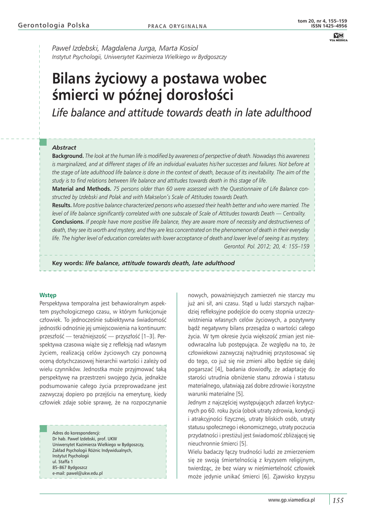 Gerontologia Polska PRACA ORYGINALNA tom 20, nr 4, 155–159 ISSN 1425–4956 Paweł Izdebski, Magdalena Jurga, Marta Kosiol Instytut Psychologii, Uniwersytet Kazimierza Wielkiego w Bydgoszczy Bilans życiowy a postawa wobec śmierci w późnej dorosłości Life balance and attitude towards death in late adulthood Abstract Background. The look at the human life is modified by awareness of perspective of death. Nowadays this awareness is marginalized, and at different stages of life an individual evaluates his/her successes and failures. Not before at the stage of late adulthood life balance is done in the context of death, because of its inevitability. The aim of the study is to find relations between life balance and attitudes towards death in this stage of life. Material and Methods. 75 persons older than 60 were assessed with the Questionnaire of Life Balance constructed by Izdebski and Polak and with Makselon’s Scale of Attitudes towards Death. Results. More positive balance characterized persons who assessed their health better and who were married. The level of life balance significantly correlated with one subscale of Scale of Attitudes towards Death — Centrality. Conclusions. If people have more positive life balance, they are aware more of necessity and destructiveness of death, they see its worth and mystery, and they are less concentrated on the phenomenon of death in their everyday life. The higher level of education correlates with lower acceptance of death and lower level of seeing it as mystery. Gerontol. Pol. 2012; 20, 4: 155–159 Key words: life balance, attitude towards death, late adulthood Wstęp Perspektywa temporalna jest behawioralnym aspektem psychologicznego czasu, w którym funkcjonuje człowiek. To jednocześnie subiektywna świadomość jednostki odnośnie jej umiejscowienia na kontinuum: przeszłość — teraźniejszość — przyszłość [1–3]. Perspektywa czasowa wiąże się z refleksją nad własnym życiem, realizacją celów życiowych czy ponowną oceną dotychczasowej hierarchii wartości i zależy od wielu czynników. Jednostka może przyjmować taką perspektywę na przestrzeni swojego życia, jednakże podsumowanie całego życia przeprowadzane jest zazwyczaj dopiero po przejściu na emeryturę, kiedy człowiek zdaje sobie sprawę, że na rozpoczynanie Adres do korespondencji: Dr hab. Paweł Izdebski, prof. UKW Uniwersytet Kazimierza Wielkiego w Bydgoszczy, Zakład Psychologii Różnic Indywidualnych, Instytut Psychologii ul. Staffa 1 85–867 Bydgoszcz e-mail: [email protected] nowych, poważniejszych zamierzeń nie starczy mu już ani sił, ani czasu. Stąd u ludzi starszych najbardziej refleksyjne podejście do oceny stopnia urzeczywistnienia własnych celów życiowych, a pozytywny bądź negatywny bilans przesądza o wartości całego życia. W tym okresie życia większość zmian jest nieodwracalna lub postępująca. Ze względu na to, że człowiekowi zazwyczaj najtrudniej przystosować się do tego, co już się nie zmieni albo będzie się dalej pogarszać [4], badania dowiodły, że adaptację do starości utrudnia obniżenie stanu zdrowia i statusu materialnego, ułatwiają zaś dobre zdrowie i korzystne warunki materialne [5]. Jednym z najczęściej występujących zdarzeń krytycznych po 60. roku życia (obok utraty zdrowia, kondycji i atrakcyjności fizycznej, utraty bliskich osób, utraty statusu społecznego i ekonomicznego, utraty poczucia przydatności i prestiżu) jest świadomość zbliżającej się nieuchronnie śmierci [5]. Wielu badaczy łączy trudności ludzi ze zmierzeniem się ze swoją śmiertelnością z kryzysem religijnym, twierdząc, że bez wiary w nieśmiertelność człowiek może jedynie unikać śmierci [6]. Zjawisko kryzysu www.gp.viamedica.pl 155 Gerontologia Polska 2012, tom 20, nr 3 religii współgra z nieadekwatną wiarą w postęp i przezwyciężanie chorób. Jednakże często dzieje się tak, że nawet personel medyczny czuje się nieswojo w konfrontacji z tym tematem i nie lubi towarzyszyć umierającym pacjentom [7]. Zdarza się, że nie rozmawia się ze śmiertelnie chorymi o ich sytuacji, a nawet czynione są starania, by chorzy nie dowiedzieli się o stanie swojego zdrowia. Również bliscy próbują ukryć fakt zbliżającej się śmierci przed osobą, której on dotyczy, przez co pozbawiają się szansy pożegnania się z bliską osobą, jak również pozbawiają ją szansy przygotowania się do śmierci [7]. Według większości badaczy tego zagadnienia, uznanie prawdy o śmiertelności jest warunkiem poznania pełnej, całościowej prawdy o człowieku i sensie jego życia. Mówienie o śmierci jest jednocześnie najwłaściwszym mówieniem o sensie życia, a prawdziwe odkrycie śmierci prowadzi do duchowej dojrzałości pojedynczych ludzi, a także całych narodów [8]. Pomimo odrzucania tego tematu przez naszą kulturę, powraca on w niezdrowym zaabsorbowaniu przemocą, zabijaniem i wojną [7]. Stosunek człowieka do śmierci jest uwarunkowany co najmniej siedmioma czynnikami [9]. Są to: kontekst kulturowy, różne doświadczenia rozwojowe, światopogląd, odporność na stresory, aktualna sytuacja życiowa, styl życia, preferowane wartości oraz prawdopodobieństwo zgonu osoby bliskiej lub własnego. Zdaniem Próchniaka natomiast, w kształtowaniu stosunku do śmierci biorą udział procesy uwagi, pamięci, przetwarzania informacji oraz kształtowania pojęć i sądów. Zwraca on uwagę, że stosunek człowieka do śmierci jest uzależniony od podmiotowych właściwości jego funkcjonowania [10]. Autorzy różnych badań jako postawę wobec śmierci rozumieją lęk przed śmiercią, intensywność myślenia o śmierci i umieraniu, działanie mechanizmów obronnych w tej postawie oraz akceptację lub obojętność dotyczącą zjawiska umierania [6]. Makselon na podstawie swoich badań wyróżnił osiem wymiarów postawy wobec śmierci: Konieczność, Centralność, Tajemniczość, 