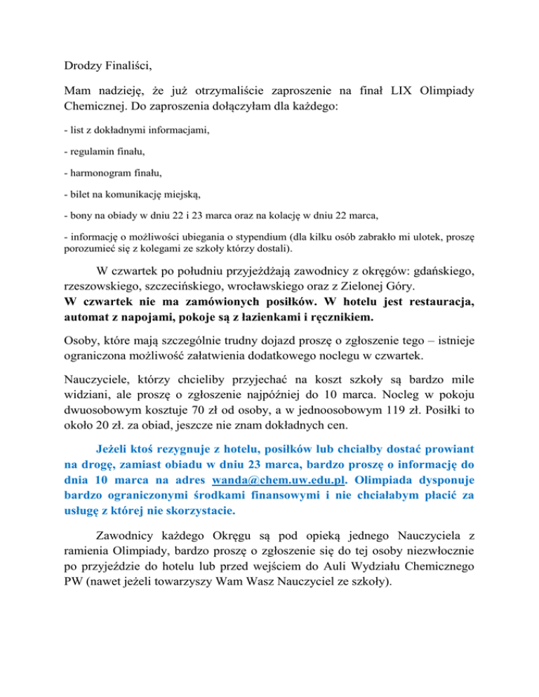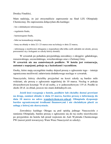 Drodzy Finaliści, Mam nadzieję, że już otrzymaliście zaproszenie na finał LIX Olimpiady Chemicznej. Do zaproszenia dołączyłam dla każdego: - list z dokładnymi informacjami, - regulamin finału, - harmonogram finału, - bilet na komunikację miejską, - bony na obiady w dniu 22 i 23 marca oraz na kolację w dniu 22 marca, - informację o możliwości ubiegania o stypendium (dla kilku osób zabrakło mi ulotek, proszę porozumieć się z kolegami ze szkoły którzy dostali). W czwartek po południu przyjeżdżają zawodnicy z okręgów: gdańskiego, rzeszowskiego, szczecińskiego, wrocławskiego oraz z Zielonej Góry. W czwartek nie ma zamówionych posiłków. W hotelu jest restauracja, automat z napojami, pokoje są z łazienkami i ręcznikiem. Osoby, które mają szczególnie trudny dojazd proszę o zgłoszenie tego – istnieje ograniczona możliwość załatwienia dodatkowego noclegu w czwartek. Nauczyciele, którzy chcieliby przyjechać na koszt szkoły są bardzo mile widziani, ale proszę o zgłoszenie najpóźniej do 10 marca. Nocleg w pokoju dwuosobowym kosztuje 70 zł od osoby, a w jednoosobowym 119 zł. Posiłki to około 20 zł. za obiad, jeszcze nie znam dokładnych cen. Jeżeli ktoś rezygnuje z hotelu, posiłków lub chciałby dostać prowiant na drogę, zamiast obiadu w dniu 23 marca, bardzo proszę o informację do dnia 10 marca na adres [email protected]. Olimpiada dysponuje bardzo ograniczonymi środkami finansowymi i nie chciałabym płacić za usługę z której nie skorzystacie. Zawodnicy każdego Okręgu są pod opieką jednego Nauczyciela z ramienia Olimpiady, bardzo proszę o zgłoszenie się do tej osoby niezwłocznie po przyjeździe do hotelu lub przed wejściem do Auli Wydziału Chemicznego PW (nawet jeżeli towarzyszy Wam Wasz Nauczyciel ze szkoły). Zawodnicy z Okręgu Warszawskiego proszeni są o zgłoszenie się do p. Katarzyny Kobierskiej najpóźniej o godz. 1245 przed wejściem do Auli Wydziału Chemicznego PW. W tym roku, podczas finału wszyscy zawodnicy spoza Warszawy mieszkają w nowym hotelu IBIS BUDGED Warszawa Reduta, przy ul. Bitwy Warszawskiej 6A. Hotel ten jest zbudowany przy zbiegu ulic Bitwy Warszawskiej i Szczęśliwickiej, w pobliżu dworca PKP i PKS Warszawa Zachodnia. Najprościej jest z Dworca Zachodniego przejść pieszo. Od wyjścia z tunelu (strona Ochoty) należy kierować się ukośną ścieżką w prawą stronę. Do hotelu jest 5 minut spacerkiem. Obiad w dniu 22 marca zamówiłam w stołówce Politechniki Warszawskiej w Gmachu Głównym (tu jest bliżej z Dworca Warszawa Centralna), tam również tego dnia będzie kolacja, a w dniu 23 marca w bufecie Wydziału Chemii UW. Obie stołówki nie mogą równocześnie wydać ponad 100 posiłków i dlatego dołączam bony na posiłki z zaznaczoną godziną, bardzo proszę o dostosowanie się do zaznaczonych godzin. Najłatwiejszy dojazd zarówno na Politechnikę (14 i 15 – 7 przystanków) jak i Uniwersytet (1,7,9,14,15,25 – 2 przystanki) tramwajem z przystanku przy ulicy Grójeckiej róg Banacha – proponuję z hotelu spacerek, bo oczekiwanie na autobus jest dłuższe. Ze stołówki na Wydział Chemiczny Politechniki Warszawskiej jest 50 metrów pieszo.