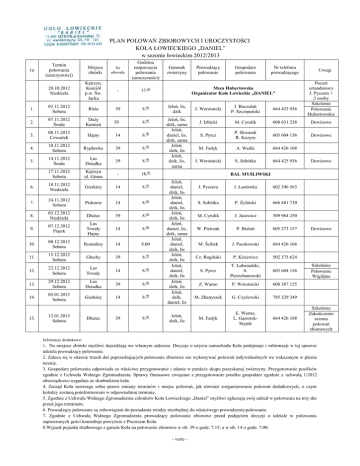 PLAN POLOWAŃ ZBIOROWYCH I UROCZYSTOŚCI KOŁA ŁOWIECKIEGO „DANIEL” w sezonie łowieckim 2012/2013 Lp Termin polowania (uroczystości) Miejsce zbiórki Nr obwodu Godzina rozpoczęcia polowania (uroczystości) 28.10.2012 Niedziela Kętrzyn, Kościół p.w. Św. Jacka - 17.00 1. 03.11.2012 Sobota Róża 39 8.00 2. 07.11.2012 Środa Duży Kamień 39 8.00 3. 08.11.2012 Czwartek Hajny 14 8.00 4. 10.11.2012 Sobota Rypławka 39 8.00 5. 14.11.2012 Środa Las Dziadka 39 8.00 17.11.2012 Sobota Kętrzyn ul. Górna - 18.00 6. 18.11.2012 Niedziela Gierkiny 14 8.00 7. 24.11.2012 Sobota Piskorze 14 8.00 8. 03.12.2012 Niedziela Dłużec 39 8.00 9. 07.12.2012 Piątek Las Trwały Hajny 14 8.00 10. 08.12.2012 Sobota Romaliny 14 8.00 11. 15.12.2012 Sobota Głuchy 39 8.00 12. 22.12.2012 Sobota Las Trwały 14 8.00 13. 29.12.2012 Sobota Las Dziadka 39 8.00 14. 05.01.2013 Sobota Gierkiny 14 8.00 15. 12.01.2013 Sobota Dłużec 39 8.00 Gatunek zwierzyny Prowadzący polowanie Gospodarz polowania Nr telefonu prowadzącego Msza Hubertowska Organizator Koło Łowieckie „DANIEL” Jeleń, lis, dzik Jeleń, lis, dzik, sarna Jeleń, daniel, lis, dzik, sarna Jeleń, dzik, lis Jeleń, dzik, lis, sarna Uwagi Poczet sztandarowy J. Pyszora + 2 osoby Szkolenie Polowanie Hubertowskie J. Worotnicki J. Boczulak P. Szczepański 664 425 936 J. Izbicki M. Cyrulik 608 631 238 Dewizowe S. Pyrcz P. Skwarek R. Kozyra 603 604 136 Dewizowe M. Fedyk A. Wedle 664 426 168 J. Worotnicki S. Sobótka 664 425 936 Dewizowe BAL MYŚLIWSKI Jeleń, daniel, dzik, lis Jeleń, daniel, dzik, lis Jeleń, dzik, lis Jeleń, daniel, lis, dzik, sarna Jeleń, daniel, dzik, lis Jeleń, dzik, lis Jeleń, daniel, dzik, lis Jeleń, dzik, lis Jeleń, dzik, daniel, lis Jeleń, dzik, lis J. Pyszora J. Łastówka 602 396 563 S. Sobótka P. Żyliński 666 481 710 M. Cyrulik J. Jasowicz 509 964 250 W. Pietrzak P. Bieluń 605 273 157 M. Ścibek J. Paszkowski 664 426 166 Cz. Rogiński P. Kiziewicz 502 375 624 S. Pyrcz T. Luberadzki, S. Pierzchanowski 603 604 136 Z. Warno P. Worotnicki 608 387 125 M. Zbanyszek G. Czyżewski 785 329 349 M. Fedyk E. Warno, L. GąsiorekStypik 664 426 168 Dewizowe Szkolenie Polowanie Wigilijne Szkolenie Zakończenie sezonu polowań zbiorowych Informacje dodatkowe: 1. Na miejsce zbiórki myśliwi dojeżdżają we własnym zakresie. Decyzje o użyciu samochodu Koła podejmuje i informacji w tej sprawie udziela prowadzący polowanie. 2. Zaleca się w okresie trzech dni poprzedzających polowanie zbiorowe nie wykonywać polowań indywidualnych we wskazanym w planie terenie. 3. Gospodarz polowania odpowiada za właściwe przygotowanie i zdanie w punkcie skupu pozyskanej zwierzyny. Przygotowanie posiłków zgodnie z Uchwała Walnego Zgromadzenia. Sprawy finansowe związane z przygotowanie posiłku gospodarz zgodnie z uchwałą 1/2012 obowiązkowo uzgadnia ze skarbnikiem koła. 4. Zarząd Koła zastrzega sobie prawo zmiany terminów i miejsc polowań, jak również zorganizowanie polowań dodatkowych, o czym koledzy zostaną poinformowani w odpowiednim terminie. 5. Zgodnie z Uchwała Walnego Zgromadzenia członków Koła Łowieckiego „Daniel” myśliwi zgłaszają swój udział w polowaniu na trzy dni przed jego terminem. 6. Prowadzący polowanie są zobowiązani do posiadania wiedzy niezbędnej do właściwego prowadzenia polowania. 7. Zgodnie z Uchwalą Walnego Zgromadzenia prowadzący polowanie zbiorowe przed podjęciem decyzji o udziale w polowaniu zaproszonych gości konsultuje powyższe z Prezesem Koła. 8.Wyjazd pojazdu służbowego z garażu Koła na polowanie zbiorowe w ob. 39 o godz. 7.15, a w ob. 14 o godz. 7.00. - verte - Podział myśliwych przydzielonych do obsługi polowań dewizowych w roku 2012 Polowanie dewizowe w dniu 07.11.2012 1. Wojciech Brzeziński 2. Krzysztof Cackowski 3. Marcin Jasowicz 4. Jacek Jasowicz 5. Sławomir Pierzchanowski 6. Tomasz Gasperowicz 7. Adam Wedle 8. Piotr Żyliński 9. Tadeusz Luberadzki 10. Wojciech Potyński 11. Wiesław Szczepański 12. Krzysztof Tuliński Polowanie dewizowe w dniu 08.11.2012 1. Roman Cyrulik 2. Janusz Kowalczyk 3. Grzegorz Czyżewski 4. Piotr Kiziewicz 5. Ryszard Kozyra 6. Sławomir Korol 7. Mirosław Zielonka 8. Dariusz Sonnefeld 9. Marek Ścibek 10. Tadeusz Sztachelski 11. Hubert Zieliński 12. Mariusz Puchalski Polowanie dewizowe w dniu 14.11.2012 1. Zygmunt Warno 2. Jerzy Łozowski 3. Józef Łastówka 4. Paweł Worotnicki 5. Jarosław Boczulak 6. Elżbieta Sukiennik 7. Cezary Sukiennik 8. Jan Pyszora 9. Lucyna Gąsiorek-Stypik 10. Ryszard Przewódzki 11. Maciej Zbanyszek 12. Kamil Duński 13. Marcin Fedyk Polowanie dewizowe w dniu 07.12.2012 1. Czesław Rogiński 2. Marian Rogiński 3 Maurycy Stanulewicz 4. Bogdan Sroka 5. Józef Sroka 6. Emilian Pyrcz 7. Piotr Szczepański 8. Grzegorz Gaj 9. Rafał Węglarczyk 10. Jacek Paszkowski 11. Marek Kazuła 1. Uwaga ! W przypadku jeżeli wyznaczony myśliwy, z różnych względów nie może wziąć udziału w polowaniu, jest zobowiązany załatwić zastępstwo. Wskazane jest aby jako zastępujący występował myśliwy z naszego koła. O dokonanej zmianie koniecznie powiadomić prowadzącego polowanie dewizowe. Udział myśliwych w wyznaczonych polowaniach ze względu na ważny interes Koła jest obowiązkowy. 2. Kierownikiem naganki na ww. polowaniach jest kolega J. Kowalski. W przypadku jego nieobecności, inna osoba wyznaczona przez prowadzącego polowanie. Konkurs !!! Z dniem 01.11.2012 roku z inicjatywy zarządu koła rozpoczynamy konkurs na najlepszego lisiarza sezonu 2012/2013. Konkurs powiązany jest z planowanym w przyszłości zasiedleniem obwodów zającami. Nagrodzonych zostanie pierwszych sześć miejsc. Kolejność miejsc w konkursie uwarunkowana jest ilością pozyskanych lisów. Koniec konkursu 31.03.2012. Warunkiem uznania strzelonego lisa jest okazanie go członkowi zarządu koła. Z up. zarządu