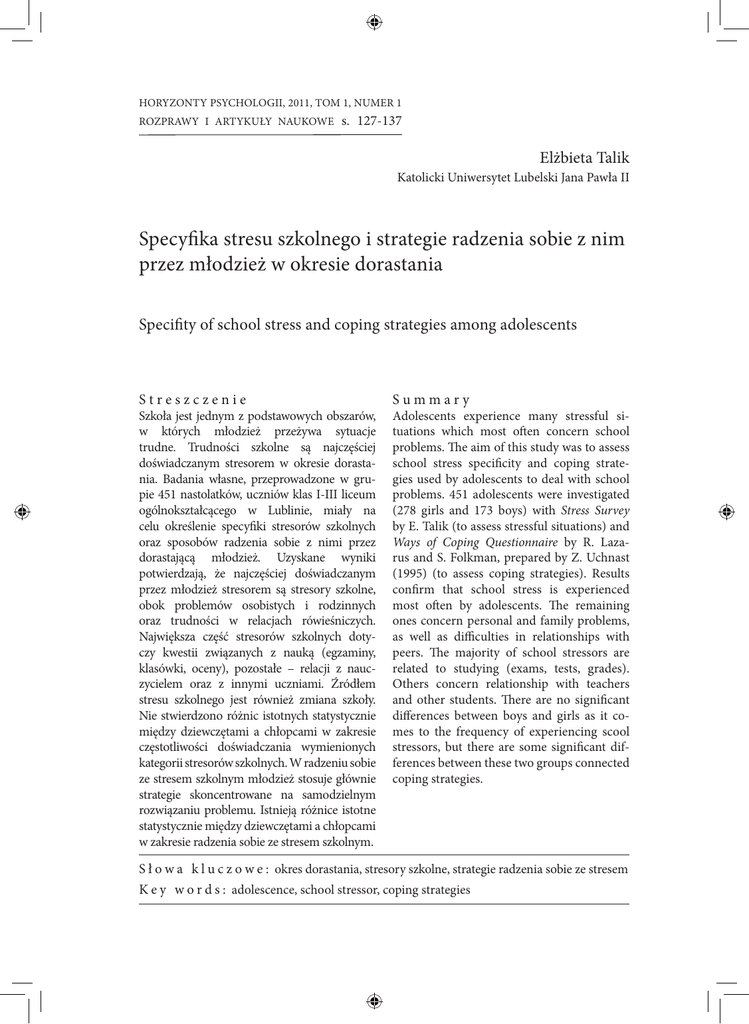 HORYZONTY PSYCHOLOGII, 2011, TOM 1, NUMER 1 ROZPRAWY I ARTYKUŁY NAUKOWE s. 127-137 Elżbieta Talik Katolicki Uniwersytet Lubelski Jana Pawła II Specyfika stresu szkolnego i strategie radzenia sobie z nim przez młodzież w okresie dorastania Specifity of school stress and coping strategies among adolescents S t r e s z c z e n i e Szkoła jest jednym z podstawowych obszarów, w których młodzież przeżywa sytuacje trudne. Trudności szkolne są najczęściej doświadczanym stresorem w okresie dorastania. Badania własne, przeprowadzone w grupie 451 nastolatków, uczniów klas I-III liceum ogólnokształcącego w Lublinie, miały na celu określenie specyfiki stresorów szkolnych oraz sposobów radzenia sobie z nimi przez dorastającą młodzież. Uzyskane wyniki potwierdzają, że najczęściej doświadczanym przez młodzież stresorem są stresory szkolne, obok problemów osobistych i rodzinnych oraz trudności w relacjach rówieśniczych. Największa część stresorów szkolnych dotyczy kwestii związanych z nauką (egzaminy, klasówki, oceny), pozostałe – relacji z nauczycielem oraz z innymi uczniami. Źródłem stresu szkolnego jest również zmiana szkoły. Nie stwierdzono różnic istotnych statystycznie między dziewczętami a chłopcami w zakresie częstotliwości doświadczania wymienionych kategorii stresorów szkolnych. W radzeniu sobie ze stresem szkolnym młodzież stosuje głównie strategie skoncentrowane na samodzielnym rozwiązaniu problemu. Istnieją różnice istotne statystycznie między dziewczętami a chłopcami w zakresie radzenia sobie ze stresem szkolnym. Summary Adolescents experience many stressful situations which most often concern school problems. The aim of this study was to assess school stress specificity and coping strategies used by adolescents to deal with school problems. 451 adolescents were investigated (278 girls and 173 boys) with Stress Survey by E. Talik (to assess stressful situations) and Ways of Coping Questionnaire by R. Lazarus and S. Folkman, prepared by Z. Uchnast (1995) (to assess coping strategies). Results confirm that school stress is experienced most often by adolescents. The remaining ones concern personal and family problems, as well as difficulties in relationships with peers. The majority of school stressors are related to studying (exams, tests, grades). Others concern relationship with teachers and other students. There are no significant differences between boys and girls as it comes to the frequency of experiencing scool stressors, but there are some significant differences between these two groups connected coping strategies. S ł o w a k l u c z o w e : okres dorastania, stresory szkolne, strategie radzenia sobie ze stresem K e y w o r d s : adolescence, school stressor, coping strategies 128 E. Talik, Specyfika stresu szkolnego i strategie radzenie sobie z nim przez młodzież w okresie dorastania HORYZONTY PSYCHOLOGII, 2011, TOM 1, NUMER 1 – ROZPRAWY I ARTYKUŁY NAUKOWE Wprowadzenie Młodzież w okresie dorastania doświadcza licznych sytuacji stresujących, które najczęściej dotyczą rodziny, szkoły, grupy rówieśniczej oraz problemów natury osobistej (Jelonkiewicz, Kosińska-Dec, 2004). Z perspektywy dorosłych wiele z tych sytuacji nie powinno stanowić źródła trudności, ale – zgodnie z najbardziej powszechną koncepcją stresu, zaproponowaną przez R. Lazarusa i S. Folkman (1987) – o tym, czy dana sytuacja jest stresująca decyduje subiektywna ocena osoby, która jej doświadcza. Ocena dotyczy zarówno samej sytuacji trudnej (ocena pierwotna), jak i własnych zasobów, niezbędnych do podjęcia zachowań zaradczych (ocena wtórna). Sytuacja zostaje oceniona przez osobę jako stresująca wówczas, gdy obciąża lub przekracza jej zasoby oraz stanowi zagrożenie (krzywdę lub wyzwanie) dla dobrostanu jednostki (well- being). Szkoła jest wymieniana przez dzieci w różnym wieku jako główne źródło stresu (Jelonkiewicz, Kosińska-Dec, 2004; Mularska, 2001; Pufal-Struzik, 1997; Witkin, 2000). Źródłem stresu szkolnego mogą być zarówno problemy z nauką i organizacją życia szkolnego, jak też trudności w relacjach społecznych – z nauczycielami oraz z innymi uczniami (Elliot, Place, 2000; Jalinik, 1995; Obuchowska, 1996a; Witkin, 2000). Do pierwszej grupy trudności należy zaliczyć specyficzne trudności w uczeniu się, a także brak motywacji i zdolności do nauki i związane z tym niepowodzenia szkolne (Jastrząb, 1997; Maszorek, 2000; Wojda, 2001). Stresujące są zarówno niepowodzenia obiektywne, których wyrazem są oceny niedostateczne, jak i niepowodzenia subiektywne, polegające na uzyskiwaniu ocen poniżej własnych aspiracji ucznia (Obuchowska, 1996a). Źródłem stresu dla młodych ludzi jest także zdemaskowanie ich nieprzygotowania do lekcji oraz spóźnianie się do szkoły (Guszkowska, 2003). Bardzo silnym stresorem jest konieczność repetowania klasy (Guszkowska i in., 2001; Guszkowska, 2003; Grabowska, 2001). W każdej fazie rozwoju niezmiennie źródłem stresu dla uczniów są klasówki, zarówno zapowiedziane, jak i niespodziewane (Guszkowska, 2003, 2005; Heyne, Rollings, 2004; Jalinik, 1995; Mularska, 2001; Witkin, 2000). Źródłem stresu mogą być nadmierne wymagania i oczekiwania, związane z realizacją programu szkolnego – i to zarówno ze strony szkoły, jak i rodziny oraz niewłaściwe reakcje rodziców na szkolne niepowodzenia dzieci (Studenski, 1992), w tym surowe kary (Guszkowska, 2003). Stersogenna może być sama organizacja życia szkolnego, w tym niesprzyjające warunki do nauki – zbyt duża liczba osób w klasie, zbyt późne lub zbyt wczesne godziny rozpoczynania bądź kończenia lekcji (Obuchowska, 1996a; Pufal-Struzik, 1997). Dużym stresem jest również zmiana szkoły (Ribner, 2005). Druga grupa stresorów szkolnych dotyczy m.in. relacji ucznia z nauczycielem, w tym zwłaszcza demonstrowanie przez nauczyciela władzy, ośmieszanie, bez