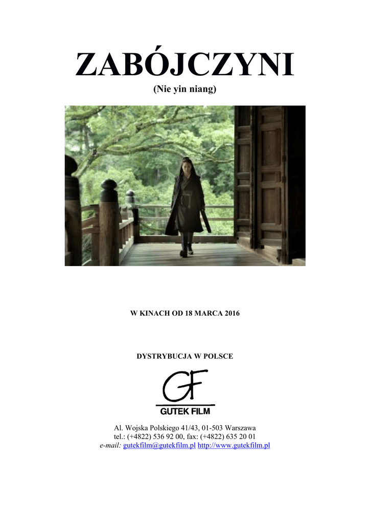 ZABÓJCZYNI (Nie yin niang) W KINACH OD 18 MARCA 2016 DYSTRYBUCJA W POLSCE Al. Wojska Polskiego 41/43, 01-503 Warszawa tel.: (+4822) 536 92 00, fax: (+4822) 635 20 01 e-mail: [email protected] http://www.gutekfilm.pl ZABÓJCZYNI NIE YIN NIANG Reżyseria Hou Hsiao-hsien Scenariusz Hou Hsiao-hsien Chu Tien-wen Hsieh Hai-meng Zhong Acheng Zdjęcia Mark Lee Ping Bing Muzyka Lim Giong Montaż Liao Ching-sung Huang Chih-chia W rolach głównych : Shu Qi Chang Chen Zhou Yun Tsumabuki Satoshi Juan Ching-tian Hsieh Hsin-ying Nie Yinniang Tian Ji’an Pani Tian Szlifiarz luster Xia Jing Huji Producenci Liao Ching-sing Huang Wen-ying Produkcja Central Motion Pictures China Dream Film Culture Industry Media Asia Films Sil-Metropole Organisation SpotFilms Zhejiang Huace Film & TV Tajwan / Chiny / Hong Kong / Francja rok produkcji: 2015 czas trwania: 105 min 1.85 – Dolby Digital Kolor OPIS FILMU Opowieść o pięknej zabójczyni, która otrzymuje zadanie, by zgładzić ukochanego. „Zabójczyni” to najnowsze dzieło Hou Hsiao-hsiena, najbardziej znanego po Angu Lee reżysera z Tajwanu. Ten nagrodzony za reżyserię na tegorocznym festiwalu w Cannes film jest wielkim hołdem dla gatunku wuxia - opowieści o legendarnych wojownikach i mistrzach walk wushu. Historia rozgrywa się w Chinach dynastii Tang. Dziesięcioletnia dziewczynka trafia do klasztoru, w którym zostaje wyszkolona na profesjonalną zabójczynię. Po latach powraca w rodzinne strony, by zrealizować tajną misję. Jej lojalność zostaje wystawiona na ciężką próbę – celem jest miły jej sercu książę. Klasyczną dworską intrygę reżyser opowiada w autorski sposób. Historię o honorze, zdradzie i wierności Hou rozpisuje na detale: spojrzenia zza zasłon, obserwowane z daleka spotkania, chwile milczenia zawieszone pomiędzy słowami. Nie brakuje oczywiście sekwencji walk, fenomenalnie sfotografowanych przez autora zdjęć do „Spragnionych miłości” Wong Kar-waia. GŁOSY PRASY Film roku. Sight & Sound Fascynujące połączenie filmowego rzemiosła, kina gatunkowego i fabuły. Los Angeles Times Hipnotyczny. Ujęcie po ujęciu to najprawdopodobniej najpiękniejszy film, jaki nakręcił Hou Hsiao-hsien. Variety Piękny, zniewalający film. Nie sposób się w nim nie zatracić. Time Out London „Zabójczyni” osiąga szczyty filmowego wyrafinowania, niewielu filmowców jest do tego zdolnych. Boston Globe Strona wizualna spycha wszystko na dalszy plan i sprawia, że „Zabójczyni” jest filmem niezapomnianym. Seattle Times Wyjątkowy, ekstatyczny film. Warto na niego uważnie patrzeć i uważnie się w niego wsłuchiwać. Vue Weekly Oryginalne i piękne podejście do tradycyjnych filmów wuxia. Ozus’ World Movie Reviews WYWIAD Z REŻYSEREM Akcja twojego filmu dzieje się w IX wieku, pod koniec panowania dynastii Tang (618-907). To okres, w którym powstawały krótkie opowiadania, znane jako chuanqi. Czy stanowiły one inspirację podczas prac nad „Zabójczynią”? Znałem i uwielbiałem chuanqi z czasów dynastii Tang jeszcze w liceum i przez długi czas marzyłem o przeniesieniu ich na ekran. „Zabójczyni” inspirowana jest jedną z takich opowieści - „Nie Yinniang”. Można powiedzieć, że z niej zaczerpnąłem dramaturgiczny pomysł. Literatura z tamtych czasów opowiada historie poprzez szczegóły z codziennego życia, pod tym względem jest więc realistyczna. Ale by zrealizować film, potrzebowałem czegoś więcej. Poświęciłem mnóstwo czasu na studiowanie świadectw i opracowań historycznych dotyczących epoki, by dowiedzieć się, jak ludzie wtedy jedli, ubierali się itd. Zwracałem uwagę na najdrobniejsze detale. Na przykład kąpiel brano wtedy na rozmaite sposoby, które zależały od tego, czy było się zamożnym kupcem, wysoko postawionym urzędnikiem, czy chłopem. Interesowało mnie też polityczne tło tamtych czasów. A był to okres chaosu, kiedy wszechwładny dwór Tang zagrożony był przez zarządców prowincji kwestionujących autorytet cesarza. Część prowincji próbowała nawet siłą dokonać secesji. Paradoksalnie te zbuntowane regiony i ich garnizony stworzone zostały przez dynastię Tang, by chronić imperium przed zagrożeniem z zewnątrz. Po serii rebelii na prowincji w ostatnich latach IX wieku dynastia upadła w 907 roku, a jej imperium się rozpadło. Gdybym tylko mógł porozmawiać z przedstawicielami dynastii Tang na Skype, mój film byłby zdecydowanie bliższy historycznej prawdzie. W film wpleciona jest przypowieść o samotnym droździe, który odmawia śpiewu i tańca, dopóki przed jego klatką nie zostaje postawione lustro. Czy ona również pochodzi z literatury epoki Tang? Tak, to w Chinach bardzo znana historia. Ma w literaturze z tamtego okresu wiele wersji. „Zabójczyni” to film wuxia, przerywany scenami walk. Ten gatunek przez długi czas był firmowym znakiem chińskiej kinematografii, ale w twojej karierze to pierwsze spotkanie z wuxia… To rezultat długiej drogi do dorosłości. Kiedy byłem dzieckiem na Tajwanie lat 50. w szkolnej bibliotece pełno było tak zwanych powieści wuxia. Uwielbiałem je i czytałem wszystkie. Połykałem też tłumaczenia światowej fantastyki, szczególnie utkwiły mi w pamięci powieści Julesa Verne’a. Towarzyszyła temu fascynacja filmami wuxia z Hong Kongu, które świat zachodni znał jako kung fu, oraz filmami o pojedynkach na miecze. Odkryłem je, gdy byłem bardzo młody i oszalałem na ich punkcie. Chciałem pewnego dnia również zmierzyć się z gatunkiem, ale w sposób realistyczny, zgodny z moim twórczym temperamentem. Wojownicy latający w powietrzu i robiący piruety pod sufitem to nie w moim stylu, więc nie mogłem zrobić tego w ten sposób. Wolę stać twardo na ziemi. Sceny walk w „Zabójczyni” odnoszą się do tradycji gatunku, ale nie znajdują się w centrum. Poza wszystkim muszę myśleć o swoich aktorach. Nawet przy ochronnych matach i zachowaniu innych względów bezpiec