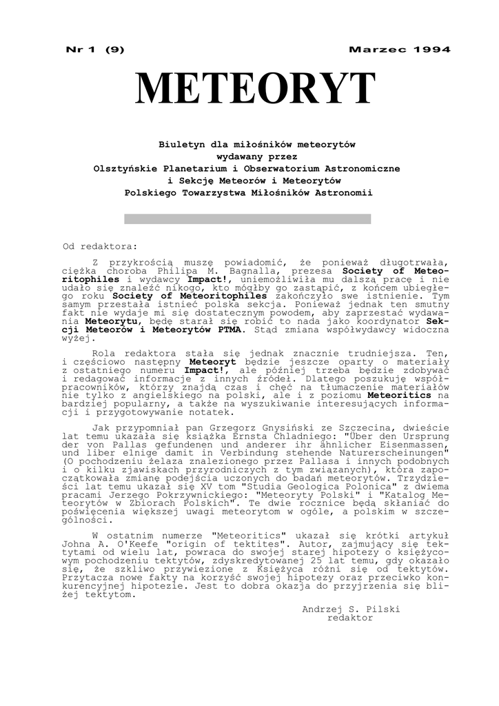 fakt nie wydaje mi się dostatecznym powodem, aby zaprzestać wydawania Meteorytu, będę starał się robić to nada jako koordynator Sekcji Meteorów i Meteorytów PTMA. Stąd zmiana współwydawcy widoczna