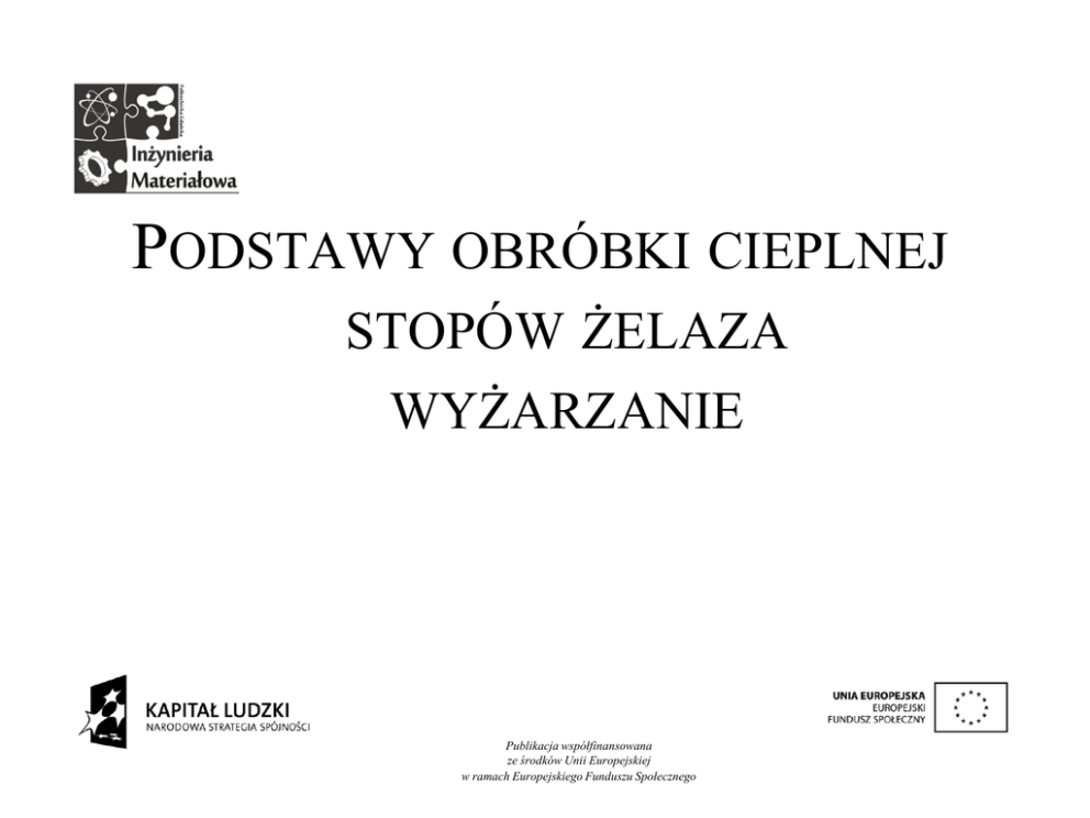 PODSTAWY OBRÓBKI CIEPLNEJ STOPÓW ŻELAZA WYŻARZANIE Publikacja współfinansowana ze środków Unii Europejskiej w ramach Europejskiego Funduszu Społecznego 1. POJĘCIA PODSTAWOWE 2. PRZEMIANY PRZY NAGRZEWANIU I POWOLNYM CHŁODZENIU STALI 3. WYŻARZANIE 2 1. POJĘCIA PODSTAWOWE Definicja obróbki cieplnej Dziedzina technologii obejmująca zespół zabiegów cieplnych powodujących zmiany struktury w stanie stałym, skutkujących poprawą właściwości metali i stopów, w wyniku działania temperatury, czasu i ośrodka. Rodzaje obróbki cieplnej • obróbka cieplna zwykła • obróbka cieplno-chemiczna • obróbka cieplno-mechaniczna • obróbka cieplno-magnetyczna Operacje obróbki cieplnej, np.: hartowanie, odpuszczanie, wyżarzanie, przesycanie, starzenie. 3 Zabiegi obróbki cieplnej, wg.: L.A. Dobrzański, Podstawy nauki o materiałach i metaloznawstwo WNT, Gliwice — Warszawa 2002 4 Definicje zabiegów obróbki cieplnej Nagrzewanie — ciągłe lub stopniowe podwyższanie temperatury wsadu Wygrzewanie — wytrzymywanie wsadu w temperaturze docelowej lub pośredniej Grzanie — nagrzewanie + wygrzewanie Chłodzenie — ciągłe lub stopniowe obniżanie temperatury wsadu do temperatury otoczenia lub innej, określonej warunkami obróbki • studzenie — powolne chłodzenie, np. z piecem lub w spokojnym powietrzu • oziębianie — szybkie chłodzenie, np. w wodzie lub oleju 5 Obróbka cieplna zwykła stopów żelaza wyżarzanie z przemianą fazową: ujednorodniające normalizujące zupełne zmiękczające bez przemiany fazowej: rekrystalizujące odprężające hartowanie i odpuszczanie Hartowanie: odpuszczanie: Martenzytyczne niskie Bainityczne średnie Objętościowe wysokie powierzchniowe 6 2. PRZEMIANY PRZY NAGRZEWANIU I POWOLNYM CHŁODZENIU STALI A3 Acm Fragment wykresu układu równowagi Fe-Fe3C A1 Przykład nagrzewania stali eutektoidalnej (~0,8% C) Po przekroczeniu temperatury A1=727ºC następuje przemiana eutektoidalna dwufazowego perlitu P w austenit (austenityzowanie): P=(+Fe3C) W temperaturze równowagi fazowej A1 przemiana przebiega bardzo wolno; przy rzeczywistych szybkościach nagrzewania (przegrzanie stali) przemiana przebiega w wyższej temperaturze i w krótszym czasie. 7 Przemiana perlitu w austenit przy grzaniu ciągłym stali eutektoidalnej: Ap, Ak — linie początku i końca przemiany perlitu w austenit, P — perlit, W — węgliki, An — austenit niejednorodny, Aj — austenit jednorodny 8 Schemat etapów przemian perlitu w austenit: a) ziarno perlitu = płytki ferrytu + płytki cementytu Fe3C b) utworzenie zarodków austenitu w płytkach ferrytu c-d) rozrost zarodków austenitu i stopniowe rozpuszczanie cementytu w austenicie e) drobne ziarna austenitu 9 Procesy podczas dalszego nagrzewania: • wyrównanie na drodze dyfuzji zawartości węgla w całej objętości • rozpuszczenie węglikoazotków) faz trudniej rozpuszczalnych (azotków, • rozrost ziaren austenitu w wyniku pochłaniania ziaren mniejszych przez większe 10 Stale mogą charakteryzować się: • w przybliżeniu liniowym wzrostem wielkości ziarna austenitu wraz z temperaturą wygrzewania powyżej A1 (1); • małą skłonnością do rozrostu ziarna (2); w stalach odtlenionych aluminium rozrost ziaren hamują dyspersyjne wydzielenia azotków i tlenków usytuowanych na granicach ziaren. Schemat rozrostu ziaren austenitu pod wpływem temperatury w stali gruboziarnistej (1) i drobnoziarnistej (2) dA — średnica ziarna austenitu, dP — średnica ziarna perlitu Ac1 – temperatura A1 przy nagrzewaniu 11 Schemat zmian wielkości ziarna podczas nagrzewania i chłodzenia w zakresie przemian perlit-austenit-perlit Wielkość ziarna austenitu decyduje o wielkości ziarna stali po ochłodzeniu. Zachowanie drobnego ziarna austenitu skutkuje drobnoziarnistością stali w temperaturze otoczenia i lepszymi właściwościami mechanicznymi, zwłaszcza udarnością i granicą plastyczności. Grube ziarno poprawia skrawalność i hartowność. 12 Mechanizm przemiany austenitu w perlit przy powolnym chłodzeniu (studzeniu): • po przekroczeniu temperatury Ar1 (temperatura A1 przy chłodzeniu) na granicach ziaren austenitu powstają zarodki cementytu; • zarodki cementytu rozrastają się w głąb ziaren austenitu, tworząc płytki prostopadłe do granic ziaren; • austenit otaczający płytki cementytu ubożeje w węgiel i przemienia się w ferryt w postaci płytek po obu stronach cementytu; • nadmiar węgla z powstającego ferrytu dyfunduje do otaczającego austenitu, co umożliwia tworzenie nowych zarodków cementytu. Przy powolnym chłodzeniu powstający perlit składa się z płytek wyraźnie rozróżnialnych przy obserwacji na mikroskopie świetlnym — perlit o małym stopniu dyspersji. Ze wzrostem szybkości chłodzenia obniża się temperatura przemiany i wzrasta liczba zarodków cementytu. Perlit cechuje coraz większe rozdrobnienie — dyspersja i większa twardość. 13 3. WYŻARZANIE Rodzaje wyżarzania stopów żelaza Wyżarzanie Stale Staliwa ujednorodniające normalizujące + + + + zupełne sferoidyzujące rekrystalizujące + + + + + - odprężajajace + + Żeliwa z grafitem + + + 14 Zakresy temperatur wyżarzania stali na tle wykresu równowagi fazowej Fe-Fe3C: 1) ujednorodnianie, 2) przegrzewanie, 3,4) normalizowanie, wyżarzanie zupełne, 5) zmiękczanie, 6) rekrystalizowanie, 7) odprężanie, 8) stabilizowanie 15 • Wyżarzanie ujednorodniające: po kilkudziesięciogodzinnym wygrzewaniu chłodzenie w spokojnym powietrzu, obróbka stosowana głównie dla wlewków stalowych przed obróbką plastyczną w celu ograniczenia niejednorodności spowodowanej mikrosegregacją składu chemicznego. • Wyżarzanie normalizujące: po krótkim wygrzewaniu chłodzenie w spokojnym powietrzu, obróbka stosowana w celu uzyskania jednorodnej struktury drobnoziarnistej oraz poprawy właściwości mechanicznych wyrobów przegrzanych lub niewłaściwie obrobionych cieplnie oraz nadania jednakowe