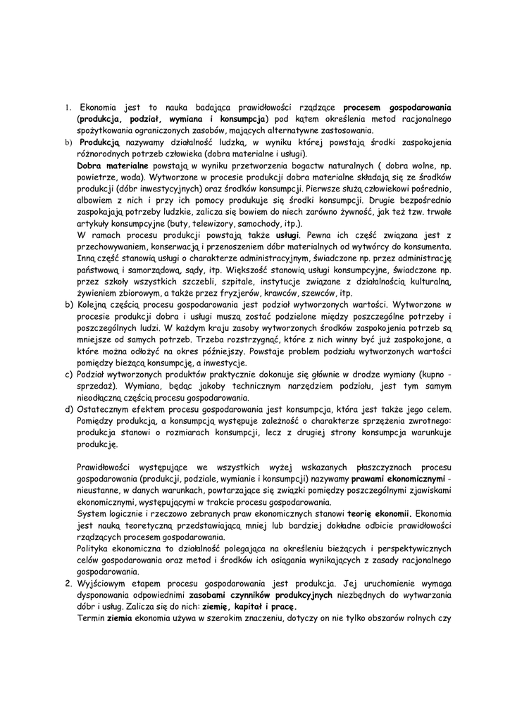 1. Ekonomia jest to nauka badająca prawidłowości rządzące procesem gospodarowania (produkcja, podział, wymiana i konsumpcja) pod kątem określenia metod racjonalnego spożytkowania ograniczonych zasobów, mających alternatywne zastosowania. b) Produkcją nazywamy działalność ludzką, w wyniku której powstają środki zaspokojenia różnorodnych potrzeb człowieka (dobra materialne i usługi). Dobra materialne powstają w wyniku przetworzenia bogactw naturalnych ( dobra wolne, np. powietrze, woda). Wytworzone w procesie produkcji dobra materialne składają się ze środków produkcji (dóbr inwestycyjnych) oraz środków konsumpcji. Pierwsze służą człowiekowi pośrednio, albowiem z nich i przy ich pomocy produkuje się środki konsumpcji. Drugie bezpośrednio zaspokajają potrzeby ludzkie, zalicza się bowiem do niech zarówno żywność, jak też tzw. trwałe artykuły konsumpcyjne (buty, telewizory, samochody, itp.). W ramach procesu produkcji powstają także usługi. Pewna ich część związana jest z przechowywaniem, konserwacją i przenoszeniem dóbr materialnych od wytwórcy do konsumenta. Inną część stanowią usługi o charakterze administracyjnym, świadczone np. przez administrację państwową i samorządową, sądy, itp. Większość stanowią usługi konsumpcyjne, świadczone np. przez szkoły wszystkich szczebli, szpitale, instytucje związane z działalnością kulturalną, żywieniem zbiorowym, a także przez fryzjerów, krawców, szewców, itp. b) Kolejną częścią procesu gospodarowania jest podział wytworzonych wartości. Wytworzone w procesie produkcji dobra i usługi muszą zostać podzielone między poszczególne potrzeby i poszczególnych ludzi. W każdym kraju zasoby wytworzonych środków zaspokojenia potrzeb są mniejsze od samych potrzeb. Trzeba rozstrzygnąć, które z nich winny być już zaspokojone, a które można odłożyć na okres późniejszy. Powstaje problem podziału wytworzonych wartości pomiędzy bieżącą konsumpcję, a inwestycje. c) Podział wytworzonych produktów praktycznie dokonuje się głównie w drodze wymiany (kupno sprzedaż). Wymiana, będąc jakoby technicznym narzędziem podziału, jest tym samym nieodłączną częścią procesu gospodarowania. d) Ostatecznym efektem procesu gospodarowania jest konsumpcja, która jest także jego celem. Pomiędzy produkcją, a konsumpcją występuje zależność o charakterze sprzężenia zwrotnego: produkcja stanowi o rozmiarach konsumpcji, lecz z drugiej strony konsumpcja warunkuje produkcję. Prawidłowości występujące we wszystkich wyżej wskazanych płaszczyznach procesu gospodarowania (produkcji, podziale, wymianie i konsumpcji) nazywamy prawami ekonomicznymi nieustanne, w danych warunkach, powtarzające się związki pomiędzy poszczególnymi zjawiskami ekonomicznymi, występującymi w trakcie procesu gospodarowania. System logicznie i rzeczowo zebranych praw ekonomicznych stanowi teorię ekonomii. Ekonomia jest nauką teoretyczną przedstawiającą mniej lub bardziej dokładne odbicie prawidłowości rządzących procesem gospodarowania. Polityka ekonomiczna to działalność polegająca na określeniu bieżących i perspektywicznych celów gospodarowania oraz metod i środków ich osiągania wynikających z zasady racjonalnego gospodarowania. 2. Wyjściowym etapem procesu gospodarowania jest produkcja. Jej uruchomienie wymaga dysponowania odpowiednimi zasobami czynników produkcyjnych niezbędnych do wytwarzania dóbr i usług. Zalicza się do nich: ziemię, kapitał i pracę. Termin ziemia ekonomia używa w szerokim znaczeniu, dotyczy on nie tylko obszarów rolnych czy budowlanych, ale też wszystkich bogactw ukrytych pod ziemią. Zasoby kapitału nie są darem natury, lecz wynikiem procesu produkcji, przeznaczonym do dalszej produkcji. Jest to więc ta część wyprodukowanych dóbr, która nie jest przeznaczona do bezpośredniej konsumpcji (Maszyny, urządzenia, narzędzia, budynki fabryczne, surowce, półfabrykaty - kapitał realny. Kapitał finansowy to pieniądze). Zasoby pracy rozumiemy jako nagromadzenie fizycznych i umysłowych zdolności ludzi do produkowania dóbr i usług. W ujęciu ilościowym zasoby pracy zależą od rozmiarów tej grupy ludności, którą zaliczamy do zawodowo czynnej oraz od czasu jej pracy. W ujęciu jakościowym zależą zaś od poziomu kwalifikacji ludzi zdolnych do pracy. 3. Wymienione trzy rodzaje zasobów czynników produkcji są, z punktu widzenia wymogów procesu gospodarowania, komplementarne (zależne) w stosunku do siebie. Są też zawsze ograniczone, a więc ograniczone są możliwości rozwoju produkcji. Ograniczoność zasobów przy nieograniczoności potrzeb rodzi konieczność nieustannego dokonywania wyborów i takiej alokacji (rozkładu, rozdziału pomiędzy alternatywne cele) zasobów, która zapewni najbardziej efektywne ich użycie. Najbardziej efektywne to znaczy: - z punktu widzenia całej gospodarki - zapewnienie maksymalnego, w długim okresie, tempa wzrostu gospodarczego, - z punktu widzenia producentów - osiągnięcie maksymalnego, w długim okresie, zysku (poprzez tzw. bezpieczny rozwój), - z punktu widzenia konsumentów - osiągnięcie maksymalnego stopnia zaspokojenia potrzeb konsumpcyjnych. Wybór oznacza przyjęcie jednej z możliwych alternatyw. 4. Koszt alternatywny to koszt rezygnacji z najlepszego spośród niezrealizowanych wariantów (alternatyw) możliwości produkcyjnych. Alternatyw Chleb a Zatrudnieni e A 5 B 4 C 3 D 2 E 1 F 0 Buty Produkcja 1000 950 850 700 400 0 Zatrudnieni e 0 1 2 3 4 5 Produkcja 0 6 11 15 18 20 5. Badaniem zasad racjonalnego gospodarowania ograniczonymi zasobami, mającymi alternatywne zastosowania w skali gospodarki jako całości, zajmuje się makroekonomia. Stąd też badania te dotyczą tworzenia, podziału i wzrostu produktu narodowego, równowagi i nierównowagi gospodarczej, polityki pieniężno - kredytowej i fiskalnej, skutków regionalnej integracji gospo