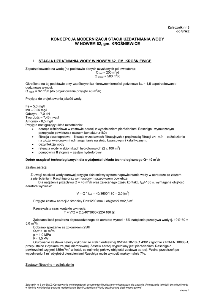 Załącznik nr 8 do SIWZ KONCEPCJA MODERNIZACJI STACJI UZDATNIANIA WODY W NOWEM 62, gm. KROŚNIEWICE I. STACJA UZDATNIANIA WODY W NOWEM 62, GM. KROŚNIEWICE Zapotrzebowanie na wodę (na podstawie danych uzyskanych od Inwestora): 3 Q śrd = 250 m /d 3 Q maxd = 500 m /d Określone na tej podstawie przy współczynniku nierównomierności godzinowe Nh = 1,5 zapotrzebowanie godzinowe wynosi: 3 3 Q maxh = 32 m /h (do projektowania przyjęto 40 m /h) Przyjęta do projektowania jakość wody: Fe – 5,6 mg/l Mn – 0,25 mg/l Odczyn – 7,0 pH Twardość – 7,43 mval/l Amoniak - 0,5 mg/l Przyjęto następujący układ uzdatniania: • aeracja ciśnieniowa w zestawie aeracji z wypełnieniem pierścieniami Raschiga i wymuszonym przepływie powietrza z czasem kontaktu t≥180s • filtracja dwustopniowa – filtracja w zestawach filtracyjnych z prędkością filtracji vf< m/h – odŜelazienie na złoŜu kwarcowym i odmanganianie na złoŜu kwarcowym i katalitycznym. • dezynfekcja wody 3 • retencja wody w zbiornikach hydroforowych (2 x 100 m ) • pompownia II stopnia – zestaw hydroforowy 3 Dobór urządzeń technologicznych dla wydajności układu technologicznego Q= 40 m /h Zestaw aeracji Z uwagi na skład wody surowej przyjęto ciśnieniowy system napowietrzania wody w aeratorze ze złoŜem z pierścieniami Raschiga oraz wymuszonym przepływem powietrza. 3 Dla natęŜenia przepływu Q = 40 m /h oraz zalecanego czasu kontaktu tzal>180 s. wymagana objętość aeratora wyniesie: 3 V = Q * tzal. = 40/3600*180 = 2,0 [m ] 3 Przyjęto zestaw aeracji o średnicy Dn=1200 mm. i objętości V=2,5 m . Rzeczywisty czas kontaktu wyniesie: T = V/Q = 2,5/40*3600=225≥180 [s] Zalecana ilość powietrza doprowadzanego do aeratora wynosi 15% natęŜenia przepływu wody tj. 10%*50 = 3 5,0 m /h. Dobrano spręŜarkę ze zbiornikiem 250l 3 Q1=11,16 m /h p = 1,0 MPa P= 1,5 kW Orurowanie zestawu naleŜy wykonać ze stali nierdzewnej X5CrNi 18-10 (1.4301) zgodnie z PN-EN 10088-1, przepustnice z dyskami ze stali nierdzewnej. Zestaw aeracji wypełniony jest pierścieniami Raschiga o 2 3 powierzchni czynnej 185m /m w ilości, co najmniej połowy objętości zestawu aeracji. Wolna przestrzeń po 3 wypełnieniu 1 m objętości pierścieniami Raschiga moŜe wynosić maksymalnie 7%. Zestawy filtracyjne – odŜelazienie ____________________________________________________________________________________________________________________ Załącznik nr 8 do SIWZ: Opracowanie wielobranŜowej dokumentacji budowlano-wykonawczej dla zadania „Polepszenie jakości i dystrybucji wody w Gminie Krośniewice poprzez modernizację Stacji Uzdatniania Wody oraz budowę sieci wodociągowej” strona 1 3 Dla natęŜenia przepływu wody Q=40 m /h oraz zalecanej prędkości filtracji wymagana powierzchnia filtracji wyniesie: vf <8,0 m/h 3 F = Q/v = 40/8 = 5,0 [m ] Dobrano 2 zestawy filtracyjnych o średnicy 1800 mm w wykonaniu indywidualnym. 2 Powierzchnia filtracyjna 1 zestawu filtracyjnego wynosi 2,54 m . Całkowita powierzchnia filtracji: 2 2 Ff = 2x2,54 = 5,08 m > Ff wym= 5,0 m Rzeczywista prędkość filtracji wyniesie 7,86 m/h. ZłoŜe filtracyjne dla pierwszego stopnia filtracji (licząc od dołu): • • • • • złoŜe kwarcowe o granulacji 8-16 mm - objętość dennicy filtra złoŜe kwarcowe o granulacji 4-8 mm – 10 cm. złoŜe kwarcowe o granulacji 2-4 mm – 10 cm. złoŜe kwarcowe o granulacji 0,8-1,4 mm – 100 cm. ZłoŜe antracytowe o granulacji 2 – 4 mm – 40 cm KaŜdy zestaw filtracyjny składa się z następujących elementów: ∗ Filtra ciśnieniowego w wykonaniu specjalnym D=1800 mm, Hwalczaka=1600 mm ∗ Odpowietrznika, typ 1.12G ¾”, ∗ ZłoŜa filtracyjnego ∗ DrenaŜ rurowy dwupoziomowy promienisty wykonany ze stali 1.4301 z szczelinami o wielkości poniŜej 0,65 mm ∗ 6 przepustnic z napędami pneumatycznymi, ∗ Orurowania – rur i kształtek ze stali 1.4301, ∗ Konstrukcji wsporczej ze stali 1.4301 raz z obejmami ∗ Niezbędnych przewodów elastycznych ∗ Spustu Orurowanie zestawu wykonać ze stali nierdzewnej X5CrNi 18-10 (1.4301) zgodnie z PN-EN 10088-1, przepustnice z dyskami ze stali nierdzewnej z siłownikami pneumatycznymi, zaworkami sterującymi i zaworkami tłumiącymi. Zestawy filtracyjne –odmanganianie 3 Dla natęŜenia przepływu wody Q=40 m /h oraz zalecanej prędkości filtracji wymagana powierzchnia filtracji wyniesie: vf <8,0 m/h 3 F = Q/v = 40/8 = 5,0 [m ] Dobrano 2 zestawy filtracyjnych o średnicy 1800 mm w wykonaniu indywidualnym. Powierzchnia 2 filtracyjna 1 zestawu filtracyjnego wynosi 2,54 m . Całkowita powierzchnia filtracji: 2 2 Ff = 2x2,54 = 5,08 m > Ff wym= 5,0 m Rzeczywista prędkość filtracji wyniesie 7,86 m/h ZłoŜe filtracyjne dla pierwszego stopnia filtracji (licząc od dołu): • złoŜe kwarcowe o granulacji 8-16 mm - objętość dennicy filtra • złoŜe kwarcowe o granulacji 4-8 mm – 10 cm. • złoŜe kwarcowe o granulacji 2-4 mm – 10 cm. • złoŜe kataliczne G1 o granulacji 1-3 mm – 80 cm. • złoŜe kwarcowe o granulacji 0,8-1,4 mm – 50 cm. KaŜdy zestaw filtracyjny składa się z następujących elementów: ∗ Filtra ciśnieniowego w wykonaniu specjalnym D=1800 mm, Hwalczaka=1600 mm ∗ Odpowietrznika, typ 1.12G ¾”, ∗ ZłoŜa filtracyjnego ∗ DrenaŜ rurowy dwupoziomowy promienisty wykonany ze stali 1.4301 z szczelinami o wielkości poniŜej 0,65 mm ∗ 6 przepustnic z napędami pneumatycznymi, ∗ Orurowania – rur i kształtek ze stali 1.4301, ∗ Konstrukcji wsporczej ze stali 1.4301wraz z obejmami ∗ Niezbędnych przewodów elastycznych ∗ Spustu ____________________________________________________________________________________________________________________ Załącznik nr 8 do SIWZ: Opracowanie wielobranŜowej dokumentacji budowlano-wykonawczej dla zadania „Polepszenie jakości i dystrybucji wody w Gminie Krośniewice poprzez modernizację Stacji Uzdatniania Wody oraz budowę sieci wodociągowej” strona 2 Przyj