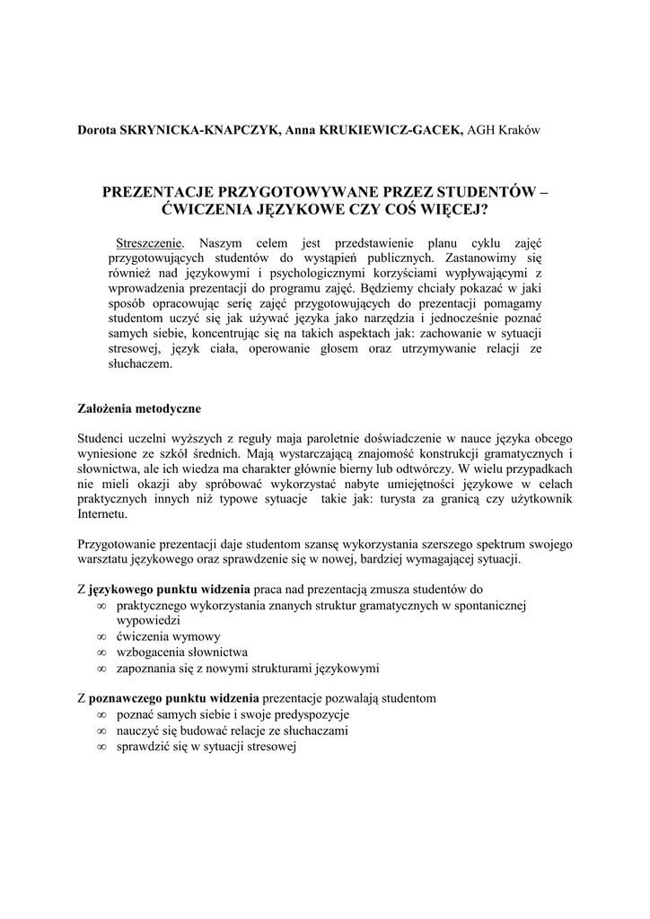 Dorota SKRYNICKA-KNAPCZYK, Anna KRUKIEWICZ-GACEK, AGH Kraków PREZENTACJE PRZYGOTOWYWANE PRZEZ STUDENTÓW – ĆWICZENIA JĘZYKOWE CZY COŚ WIĘCEJ? Streszczenie. Naszym celem jest przedstawienie planu cyklu zajęć przygotowujących studentów do wystąpień publicznych. Zastanowimy się równieŜ nad językowymi i psychologicznymi korzyściami wypływającymi z wprowadzenia prezentacji do programu zajęć. Będziemy chciały pokazać w jaki sposób opracowując serię zajęć przygotowujących do prezentacji pomagamy studentom uczyć się jak uŜywać języka jako narzędzia i jednocześnie poznać samych siebie, koncentrując się na takich aspektach jak: zachowanie w sytuacji stresowej, język ciała, operowanie głosem oraz utrzymywanie relacji ze słuchaczem. ZałoŜenia metodyczne Studenci uczelni wyŜszych z reguły maja paroletnie doświadczenie w nauce języka obcego wyniesione ze szkół średnich. Mają wystarczającą znajomość konstrukcji gramatycznych i słownictwa, ale ich wiedza ma charakter głównie bierny lub odtwórczy. W wielu przypadkach nie mieli okazji aby spróbować wykorzystać nabyte umiejętności językowe w celach praktycznych innych niŜ typowe sytuacje takie jak: turysta za granicą czy uŜytkownik Internetu. Przygotowanie prezentacji daje studentom szansę wykorzystania szerszego spektrum swojego warsztatu językowego oraz sprawdzenie się w nowej, bardziej wymagającej sytuacji. Z językowego punktu widzenia praca nad prezentacją zmusza studentów do • praktycznego wykorzystania znanych struktur gramatycznych w spontanicznej wypowiedzi • ćwiczenia wymowy • wzbogacenia słownictwa • zapoznania się z nowymi strukturami językowymi Z poznawczego punktu widzenia prezentacje pozwalają studentom • poznać samych siebie i swoje predyspozycje • nauczyć się budować relacje ze słuchaczami • sprawdzić się w sytuacji stresowej Prezentacje przygotowywane przez studentów – ćwiczenia językowe czy coś więcej? 191 Plan cyklu zajęć 1. ZAJĘCIA WPROWADZAJĄCE Celem tych zajęć jest uświadomienie studentom czym jest prezentacja. Jest to niezmiernie waŜne gdyŜ na podstawie swoich doświadczeń szkolnych studenci często utoŜsamiają prezentacje z prezentacją referatu, z reguły odczytywanego z kartki i wysłuchiwanego jedynie przez nauczyciela. Studenci, nie rzadko, nie zdają sobie sprawy, Ŝe wykład, spotkanie informacyjne na temat nowego produktu, nowej technologii czy organizacji studenckiej – to teŜ prezentacja. W trakcie zajęć rolą nauczyciela jest pokazanie studentom, Ŝe tematy prezentacji mogą być bardzo róŜnorodne, ale cel jest zawsze ten sam – zainteresowanie słuchacza. Dobrym sposobem jest tu przeanalizowanie zasugerowanych przez studentów przykładów nieudanych prezentacji w których uczestniczyli i zastanowienie się nad przyczynami niepowodzenia: • moŜe temat okazał się nieatrakcyjny dla słuchaczy poniewaŜ prelegent nie zadał sobie trudu by sprawdzić kim będą jego słuchacze i ile wiedzą na dany temat • moŜe prelegentowi nie udało się wzbudzić zainteresowania słuchaczy poniewaŜ: mówił w sposób monotonny, nie modulując głosu prezentacja była chaotyczna nie przygotował odpowiednich, atrakcyjnych materiałów audio-wizualnych nie panował nad językiem ciała • moŜe zawiódł sprzęt lub forma prezentacji nie odpowiadała warunkom lokalowym – była zła akustyka czy nie wszyscy uczestnicy widzieli ekran Po takim wprowadzeniu łatwo jest omówić ze studentami uŜywany przy prezentacjach sprzęt oraz zastanowić się jaki sprzęt potrafią bez trudu obsługiwać i chcieliby wykorzystać przygotowując swoją prezentację. Kończąc zajęcia naleŜy poprosić studentów by w domu zastanowili się jaki temat chcieliby prezentować i przypomnieć Ŝeby przy wyborze tematu kierowali się wnioskami z dyskusji na temat prezentacji w której przed chwilą uczestniczyli . 2. ZAJĘCIA PRZYGOTOWUJĄCE DO PREZENTACJI W trakcie tych zajęć naleŜy zapoznać studentów ze strukturą prezentacji, jej etapami i specyficznym językiem. Pracując ze studentami na poziomie zaawansowanym (od B2 w górę) moŜna zaproponować cały wachlarz zwrotów i struktur typowych dla prezentacji i pozwolić im na samodzielne zaadaptowanie ich na potrzeby swoich wystąpień. W przypadku uczniów mniej zaawansowanych naleŜałoby wspólnie wypracować model (szkielet) prezentacji i pozwolić studentom jedynie wypełnić go przygotowaną samodzielnie treścią. NaleŜy równocześnie przedyskutować zasady zachowań prelegenta takie jak: język ciała, modulacja głosu, ubiór, nawiązywanie kontaktu wzrokowego ze słuchaczami, reagowanie na problemy techniczne zaistniałe w trakcie prezentacji i reagowanie na zachowanie publiczności. Podsumowując zajęcia naleŜy ustalić harmonogram prac własnych studentów, prowadzonych indywidualnie lub w zespołach dwuosobowych . Po wstępnym samodzielnym opracowaniu materiałów studenci powinni zgłosić się na indywidualne konsultacje z nauczycielem. 192 D. Skrynicka-Knapczyk, A. Krukiewicz-Gacek 3. KONSULTACJE PRZED PREZENTACJAMI W czasie tych konsultacji studenci przedstawiają wybrany przez siebie materiał i zaproponowaną formę jego prezentacji. Zadaniem nauczyciela jest pomóc studentowi prawidłowo przekształcić zebrany materiał w formę prezentacji jak równieŜ dokonać korekty językowej nie tylko treści prezentacji, ale teŜ materiałów audio-wizualnych. NaleŜy równocześnie sprawdzić długość prezentacji, poniewaŜ niedoświadczeni prelegenci mają skłonność do przekraczania wyznaczonego czasu. 4. PREZENTACJE STUDENTÓW MoŜliwe są dwa scenariusze zajęć w zaleŜności od poziomu zaawansowania uczniów. Dla grup słabiej zaawansowanych proponujemy scenariusz prostszy, w którym po kaŜdej prezentacji nauczyciel analizuje wystąpienie głównie pod kątem poprawności językowej. PoniewaŜ pierwsza w Ŝyciu prezentacja często bywa nie