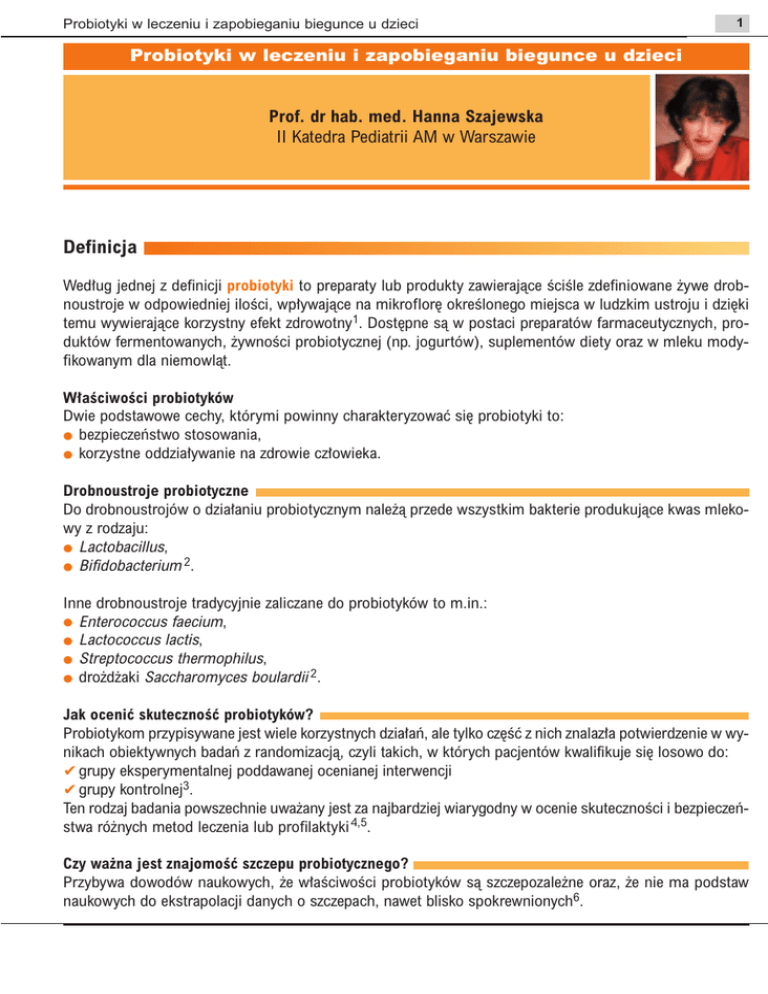 Probiotyki w leczeniu i zapobieganiu biegunce u dzieci 1 Probiotyki w leczeniu i zapobieganiu biegunce u dzieci Prof. dr hab. med. Hanna Szajewska II Katedra Pediatrii AM w Warszawie Definicja Wed∏ug jednej z definicji probiotyki to preparaty lub produkty zawierajàce ÊciÊle zdefiniowane ˝ywe drobnoustroje w odpowiedniej iloÊci, wp∏ywajàce na mikroflor´ okreÊlonego miejsca w ludzkim ustroju i dzi´ki temu wywierajàce korzystny efekt zdrowotny1. Dost´pne sà w postaci preparatów farmaceutycznych, produktów fermentowanych, ˝ywnoÊci probiotycznej (np. jogurtów), suplementów diety oraz w mleku modyfikowanym dla niemowlàt. W∏aÊciwoÊci probiotyków Dwie podstawowe cechy, którymi powinny charakteryzowaç si´ probiotyki to: ● bezpieczeƒstwo stosowania, ● korzystne oddzia∏ywanie na zdrowie cz∏owieka. Drobnoustroje probiotyczne Do drobnoustrojów o dzia∏aniu probiotycznym nale˝à przede wszystkim bakterie produkujàce kwas mlekowy z rodzaju: ● Lactobacillus, ● Bifidobacterium 2. Inne drobnoustroje tradycyjnie zaliczane do probiotyków to m.in.: Enterococcus faecium, ● Lactococcus lactis, ● Streptococcus thermophilus, ● dro˝d˝aki Saccharomyces boulardii 2. ● Jak oceniç skutecznoÊç probiotyków? Probiotykom przypisywane jest wiele korzystnych dzia∏aƒ, ale tylko cz´Êç z nich znalaz∏a potwierdzenie w wynikach obiektywnych badaƒ z randomizacjà, czyli takich, w których pacjentów kwalifikuje si´ losowo do: ✔grupy eksperymentalnej poddawanej ocenianej interwencji ✔grupy kontrolnej3. Ten rodzaj badania powszechnie uwa˝any jest za najbardziej wiarygodny w ocenie skutecznoÊci i bezpieczeƒstwa ró˝nych metod leczenia lub profilaktyki 4,5. Czy wa˝na jest znajomoÊç szczepu probiotycznego? Przybywa dowodów naukowych, ˝e w∏aÊciwoÊci probiotyków sà szczepozale˝ne oraz, ˝e nie ma podstaw naukowych do ekstrapolacji danych o szczepach, nawet blisko spokrewnionych6. 2 Probiotyki w leczeniu i zapobieganiu biegunce u dzieci Praktycznie oznacza to, ˝e aby racjonalnie stosowaç probiotyki niezb´dna jest znajomoÊç dzia∏ania konkretnego szczepu probiotycznego, a nie tylko rodzaju lub gatunku. Ka˝dy ze szczepów wymaga oddzielnych badaƒ w celu okreÊlenia jego w∏aÊciwoÊci probiotycznych i skutecznoÊci klinicznej w ÊciÊle okreÊlonej jednostce chorobowej7,8. Mechanizm dzia∏ania Sposoby dzia∏ania probiotyków nie zosta∏y jeszcze dobrze poznane i nadal sà przedmiotem dyskusji. Przypuszczalne mechanizmy (Ryc. 1) to: ● konkurencja o receptory lub przyleganie do komórek nab∏onka jelitowego9, ● wytwarzanie substancji, które hamujà wzrost bakterii chorobotwórczych10, ● wspó∏zawodnictwo z innymi mikroorganizmami o sk∏adniki od˝ywcze11, ● zakwaszanie treÊci jelitowej12, ● modyfikacja receptorów dla toksyn bakteryjnych na drodze enzymatycznej13, ● modulacja odpowiedzi immunologicznej poprzez m.in. stymulacj´ fagocytozy14, ● pobudzanie syntezy przeciwcia∏15 i cytokin16, ● zwi´kszona synteza mucyn17. Ryc. 1. Mechanizm dzia∏ania probiotyków produkcja inhibitorów wzrostu patogenów patogeny modyfikacja receptorów dla toksyn bakteryjnych eliminacja poprzez konkurencj´ produkcja kwasów organicznych zwi´kszanie wydzielania przeciwcia∏ (IgA) probiotyki wzmacnianie „bariery ochronnej” immunoregulacja komórki uk∏adu odpornoÊciowego zmniejszenie przepuszczalnoÊci nab∏onek przewodu pokarmowego Opracowano na podstawie: Ewaschuk JB, Dieleman LA. Probiotics and prebiotics in chronic inflammatory bowel diseases. World J Gastroenterol 2006;12:5941-50. Leczenie ostrej biegunki infekcyjnej Nawadnianie doustnymi p∏ynami nawadniajàcymi – post´powanie z wyboru w przypadku ostrej biegunki przebiegajàcej z odwodnieniem – jest niezwykle skuteczne, nie skraca jednak czasu utrzymywania si´ objawów. Poszukuje si´ wi´c leków, które mog∏yby skróciç czas choroby i zmniejszyç liczb´ oraz obj´toÊç stolców biegunkowych. Na podstawie wyników kilku metaanaliz18,19,20,21 (Tab. 1.) wydaje si´, ˝e korzystny efekt probiotyków w leczeniu ostrej biegunki jest: ● umiarkowany – probiotyki w porównaniu z placebo skracajà czas trwania biegunki Êrednio o 17–30 godzin, ● szczepozale˝ny – dobrze udokumentowany w odniesieniu do Lactobacillus GG22 oraz Saccharomyces boulardii 23, ● uzale˝niony od dawki – wi´kszy w przypadku dawki powy˝ej 1010–1011 jednostek tworzàcych kolonie (CFU), 3 Probiotyki w leczeniu i zapobieganiu biegunce u dzieci ● ● istotny klinicznie w biegunkach o etiologii wirusowej, najwi´kszy, je˝eli leczenie rozpocz´to we wczesnym okresie biegunki. Obecnie uwa˝a si´, ˝e w leczeniu ostrej biegunki infekcyjnej u dzieci mogà byç stosowane probiotyki o udokumentowanym dzia∏aniu24. Tab. 1. Probiotyki w leczeniu ostrej biegunki infekcyjnej: wyniki metaanaliz badaƒ z randomizacjà Punkt koƒcowy Biegunka ≥3 dni Autor Szajewska et al.18 Allen et al.21 Czas trwania Szajewska biegunki et al.18 Van Niel et al.19 Huang et al.19 Allen et al.21 Szajewska et al.22 Szajewska et al.23 RCT 8 (731) 15 (1341) 8 (731) 9 (675) 18 (1917) 12 (970) 7 (988) 4 (473) Probiotyk(i) Populacja Miara efektu Ró˝ne Dzieci RR Ró˝ne Dzieci i doroÊli RR Ró˝ne Dzieci WMD Lactobacilli Dzieci WMD Ró˝ne Dzieci WMD Ró˝ne Dzieci i doroÊli WMD Lactobacillus GG Dzieci WMD S. boulardii Dzieci WMD Efekt (95% Cl) 0,4 (0,3–0,5) 0,7 (0,6–0,8) -18 h (-27; -10) -17 h (-27; -10) -19 h (-26; -14) -30 h (-42; -19) -26 h (-46; -7) -24 h (-31; -19) NNT (95% Cl) 4 (3–9) 4 (4–7) – – – – – – RR – ryzyko wzgl´dne – w badaniach skutecznoÊci interwencji jest to iloraz prawdopodobieƒstwa wystàpienia okreÊlonego punktu koƒcowego w grupie eksperymentalnej, w której stosuje si´ ocenianà interwencj´ i tego prawdopodobieƒstwa w grupie kontrolnej. Ryzyko wzgl´dne okreÊla, jaka cz´Êç ryzyka podstawowego „pozosta∏a” po interwencji. NNT – liczba pacjen