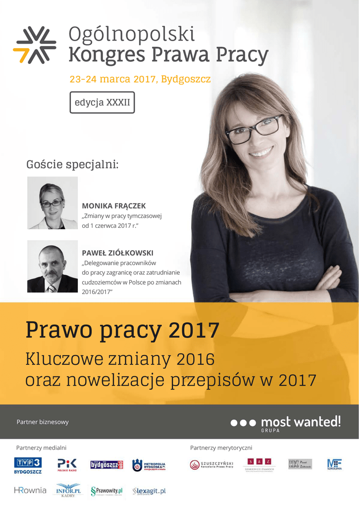 23-24 marca 2017, Bydgoszcz edycja XXXII Goście specjalni: MONIKA FRĄCZEK „Zmiany w pracy tymczasowej od 1 czerwca 2017 r.” PAWEŁ ZIÓŁKOWSKI „Delegowanie pracowników do pracy zagranicę oraz zatrudnianie cudzoziemców w Polsce po zmianach 2016/2017” Prawo pracy 2017 Kluczowe zmiany 2016 oraz nowelizacje przepisów w 2017 Partner biznesowy Partnerzy medialni Partnerzy merytoryczni Szanowni Państwo, W ramach XXXII edycji Ogólnopolskiego Kongresu Prawa Pracy w Bydgoszczy spotykamy się w gronie Prezesów, Dyrektorów HR, Managerów HR, Specjalistów ds. Kadr i Płac, Specjalistów HR, Radców Prawnych oraz Specjalistów ds. Administracji, by zaprezentować kluczowe zmiany 2016 oraz nowelizacje przepisów KP czekające nas w 2017 r. Zarówno udział w kongresie, jak i warsztatach stanowić będzie dla Państwa doskonałą okazję do konsultacji z ekspertami posiadającymi bogate doświadczenie w zakresie prawa pracy. Główne zagadnienia Kongresu ( Dzień I - 23 marca 2017): • umowy terminowe po roku od zmiany przepisów – praktyczne wskazówki dla pracodawców, • nowe zasady składania oświadczeń woli i dokumentów oraz nowe zasady prowadzenia i przechowywania akt osobowych pracowników i dokumentacji pracowniczej od 1 czerwca 2017, • minimalne stawki godzinowe w umowach cywilnoprawnych 2017 (zasady naliczania wynagrodzenia, konstruowanie bezpiecznych zapisów umownych, prawidłowe ewidencjonowanie godzin pracy), • delegowanie pracowników do pracy zagranicę oraz zatrudnianie cudzoziemców w Polsce po zmianach 2016/2017, • zmiany w pracy tymczasowej od 1 czerwca 2017 r. Główne zagadnienia Warsztatu (Dzień II - 24 marca 2017): • znowelizowane ograniczenia w zakresie prac uciążliwych, niebezpiecznych lub szkodliwych dla zdrowia kobiet (nowe rozporządzenia wykonawcze do przepisów znowelizowanych z dniem 3 sierpnia 2015 r.), • praktyczne aspekty zakładania akt osobowych i wypełniania obowiązków informacyjnych wobec nowych pracowników, także w kontekście zmian planowanych od 1 czerwca 2017 r., • poprawne zawieranie umów o pracę (ze szczególnym uwzględnieniem zasad określania miejsca wykonywania pracy zgodnie z podziałem proponowanym w najnowszym orzecznictwie sądów pracy), • zawieranie umów o pracę na czas określony, w szczególności umów na zastępstwo oraz umów zawieranych do wykonania pracy o charakterze sezonowym, • umowy cywilnoprawne z własnym pracownikiem, • nowe formy składnia oświadczenia o rozwiązaniu stosunku pracy (od 8 września 2016 r. oraz zgodnie ze zmianami planowanymi od 1 czerwca 2017 r.) oraz planowana, szczególna ochrona pracowników w wieku przedemerytalnym w związku z nowelizacją przepisów dotyczących wieku emerytalnego (od 1 października 2017 r), • planowane zmiany w przepisach dotyczących związków zawodowych, • nowe zasady wydawania i wypełniania świadectw pracy oraz dalsze zmiany od 1 czerwca 2017. www.kongresprawapracy.pl 1 Informacje podstawowe Kiedy? Gdzie? Organizator 23-24 marca 2017 Holiday Inn Bydgoszcz**** Beata Jagielska ul. Grodzka 36 +48 791 555 849 85-109 Bydgoszcz [email protected] Cena kongresu Cena warsztatu 390 zł + VAT 590 zł + VAT dla klientów MW! Cena obejmuje: uczestnictwo w całodziennym wydarzeniu, lunch oraz przerwy kawowe. Materiały szkoleniowe zostaną udostępnione w wersji elektronicznej. 690 zł + VAT dla pozostałych Cena obejmuje: uczestnictwo w warsztacie, materiały szkoleniowe, lunch oraz przerwy kawowe. Partnerzy Partner biznesowy Sponsor nagród Partnerzy medialni Partnerzy merytoryczni www.kongresprawapracy.pl 2 Program konferencji Dzień 1, czwartek 23 marca 2017 8.30 - 9.00 10.15 - 11.00 Rejestracja, kawa powitalna Prelegent: Karol Sienkiewicz 9.00 - 9.45 „Nowe zasady składania oświadczeń woli Prelegent: Piotr Ciborski i dokumentów oraz nowe zasady prowadzenia „Umowy terminowe po roku od zmiany i przechowywania akt osobowych pracowników przepisów – praktyczne wskazówki dla i dokumentacji pracowniczej od 1 czerwca pracodawców” 2017” • • Liczenie umów na czas określony i czasu ich trwania w przypadku Wielokrotne zawierania umowy • na • • Wypowiadanie umów na czas określony w różnych przypadkach. Czy prowadzenia akt osobowych Nowe okresy przechowywania dokumentacji Elektroniczne akta osobowe a przepisy przejściowe. trwania umowy? 11.00 - 11.15 Czy umowy na czas określony obowiązujące Pytania z sali do prelegenta w dniu 22 lutego 2016 r. musiały być • • okres wypowiedzenia może być dłuższy niż czas • Warunki pracowniczej, zrobić poprawnie? • Jakie czynności będą mogły być dokonane przez w postaci elektronicznej, Konieczność powiadamiania PIP o okresowym zatrudnianiu tego samego pracownika. Jak to pracy w formie elektronicznej, określony, gdy u pracodawcy wystąpi okresowe • prawie pracownika, pracodawcę i związek zawodowy czas zwiększenie zapotrzebowania na pracę, w warunkach, zatrudnionych na dzień 22 lutego 2016 r. • elektroniczna – kiedy będzie można ją stosować i na jakich pracowników i tych zatrudnionych przed tą datą, Forma anektowane? 11.15 - 12.00 Jak poprawnie sporządzać informację o warun- Prelegent: Michał Szuszczyński kach zatrudnienia, po zmianie przepisów „Minimalne stawki godzinowe w umowach o wypowiadaniu umów na czas określony? 9.45 - 10.00 Pytania z sali do prelegenta 10.00 - 10.15 PRZERWA cywilnoprawnych 2017 (zasady naliczania wynagrodzenia, konstruowanie bezpiecznych zapisów umownych, prawidłowe ewidencjonowanie godzin pracy)” • Jakie podmioty i jakie umowy obejmą nowe przepisy, • Zasady ustalania wynagrodzenia w umowach cywilnoprawnych w świetle nowych przepisów, www.kongresprawapracy.pl 3 Dzień 1, czwartek 23 marca 2017 • Zasady ewidencjowania czasu pracy zleceniobiorców, • Nowe uprawnienia 14.00 - 14.15 PRZERWA Państwowej Inspekcji Pracy oraz sankcje i grzywny związane 14.15 - 15.00 z nieprzestrzeganiem nowych prz