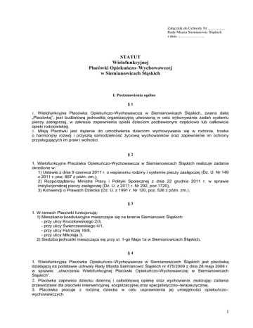 Załącznik do Uchwały Nr ………….. Rady Miasta Siemianowic Śląskich z dnia ………………… STATUT Wielofunkcyjnej Placówki Opiekuńczo–Wychowawczej w Siemianowicach Śląskich I. Postanowienia ogólne §1 1. Wielofunkcyjna Placówka Opiekuńczo-Wychowawcza w Siemianowicach Śląskich, zwana dalej „Placówką”, jest budżetową jednostką organizacyjną utworzoną w celu wykonywania zadań systemu pieczy zastępczej, w zakresie zapewnienia opieki dzieciom pozbawionym częściowo lub całkowicie opieki rodzicielskiej. 2. Misją Placówki jest dążenie do umożliwienia dzieciom wychowywania się w rodzinie, troska o harmonijny rozwój i przyszłą samodzielność życiową wychowanków oraz zapewnienie im ochrony przysługujących im praw i wolności. §2 1. Wielofunkcyjna Placówka Opiekuńczo-Wychowawcza w Siemianowicach Śląskich realizuje zadania określone w: 1) Ustawie z dnia 9 czerwca 2011 r. o wspieraniu rodziny i systemie pieczy zastępczej (Dz. U. Nr 149 z 2011 r. poz. 887 z późn. zm.), 2) Rozporządzeniu Ministra Pracy i Polityki Społecznej z dnia 22 grudnia 2011 r. w sprawie instytucjonalnej pieczy zastępczej (Dz. U. z 2011 r. Nr 292, poz.1720), 3) Konwencji o Prawach Dziecka (Dz. U. z 1991 r. Nr 120, poz. 526 z późn. zm.). §3 1. W ramach Placówki funkcjonują: 1) Mieszkania koedukacyjne mieszczące się na terenie Siemianowic Śląskich: - przy ulicy Kruczkowskiego 2/3, - przy ulicy Świerczewskiego 4/1, - przy ulicy Hutniczej 16/8, - przy ulicy Mikołaja 3. 2) Siedziba jednostki mieszcząca się przy ul. 1-go Maja 1a w Siemianowicach Śląskich. §4 1. Wielofunkcyjna Placówka Opiekuńczo–Wychowawcza w Siemianowicach Śląskich jest placówką działającą na podstawie uchwały Rady Miasta Siemianowic Śląskich nr 475/2009 z dnia 28 maja 2009 r. w sprawie: „utworzenia Wielofunkcyjnej Placówki Opiekuńczo-Wychowawczej w Siemianowicach Śląskich”. 2. Placówka zapewnia dziecku dzienną i całodobową opiekę oraz wychowanie, realizując zadania przewidziane dla placówki interwencyjnej, socjalizacyjnej oraz specjalistyczno–terapeutycznej. 3. Placówka pracuje z rodziną dziecka w celu usprawnienia jej umiejętności opiekuńczo– wychowawczych. 1 II. Cele i zadania §5 1. Placówka spełnia podstawowe funkcje rodziny w zakresie opieki i wychowania, zapewniając wychowankom wszechstronną opiekę wychowawczą oraz stwarzając im sprzyjające warunki do prawidłowego i wszechstronnego rozwoju. 2. Placówka utrzymuje kontakty z rodzicami lub innymi członkami rodziny wychowanków w celu utrzymania warunków ich powrotu do rodziny. 3. Placówka współpracuje z ośrodkami adopcyjno–opiekuńczymi w celu pozyskania dla wychowanków zastępczych form wychowania rodzinnego. §6 1. W organizacji prawidłowego procesu opiekuńczo–wychowawczego biorą udział wychowawcy, pedagodzy, psychologowie i pracownicy socjalni. III. Organizacja placówki. §7 1. Pracą Placówki kieruje Dyrektor, którego zatrudnia i zwalnia Prezydent Miasta, przy czym okres zatrudnienia nie może przekroczyć 5 lat. 2. Nadzór nad działalnością Placówki sprawuje: 1) Prezydent Miasta przy pomocy Miejskiego Ośrodka Pomocy Społecznej, w zakresie ustalonym przez Zarządzenie Prezydenta. 2) Wojewoda Śląski - Wydział Polityki Społecznej Urzędu Wojewódzkiego w Katowicach, w sprawach dotyczących standardów opieki i wychowania. 3. Dyrektor jest bezpośrednim przełożonym wszystkich pracowników, określa zakres ich czynności i kompetencji zgodnie z obowiązującymi przepisami i potrzebami Placówki. 4. Dyrektor kieruje bieżącymi sprawami Placówki, a w szczególności działalnością dydaktyczną, wychowawczo–opiekuńczą, finansowo–menedżerską oraz reprezentuje Placówkę na zewnątrz. 5. Dyrektor organizuje administracyjną, finansową i gospodarczą obsługę Placówki. 6. W wykonywaniu swoich zadań Dyrektor współpracuje z ogółem pracowników Placówki. §8 1. Dyrektor Placówki ma prawo do: 1) wydawania poleceń służbowych pracownikom Placówki, 2) zatrudniania i zwalniania pracowników, 3) decydowania w sprawie przyznawania nagród i wymierzania kar porządkowych pracownikom Placówki, 4) wprowadzania innowacji w celu usprawnienia pracy w Placówce, 5) decydowania o wewnętrznej organizacji pracy Placówki i jej bieżącym funkcjonowaniu, 6) przeprowadzania okresowej kontroli pracy w Placówce. 2. Dyrektor odpowiada za: 1) standard uzyskiwanych przez Placówkę wyników wychowania oraz za opiekę nad wychowankami, 2) zgodność funkcjonowania Placówki z przepisami i niniejszym statutem, 3) bezpieczeństwo osób przebywających w Placówce i podczas zajęć organizowanych przez Placówkę oraz za stan sanitarny i ochrony przeciwpożarowej obiektów Placówki, 4) celowe wykorzystanie środków zapewnionych na działalność Placówki, 5) zgodne z przepisami prowadzenie dokumentacji pracowniczej i wychowanków, właściwe zabezpieczenie pieczęci i druków ścisłego zarachowania. 2 §9 1. Placówka jest placówką nieferyjną, działającą przez cały rok kalendarzowy, przeznaczoną dla 26 dzieci. 2. Wychowankowie zamieszkują w czterech mieszkaniach na terenie Siemianowic Śląskich wymienionych w § 3 pkt 1. 3. Dyrektor Placówki, jeżeli pozwalają na to warunki i przemawiają za tym szczególne okoliczności, może przyjąć większą niż określoną w pkt 1 liczbę wychowanków. 3. Rodzeństwa umieszcza się, w miarę posiadanych możliwości, w tym samym mieszkaniu. 4. Grupą wychowanków opiekuje się stały zespół wychowawców. 5. Rodzice, krewni, opiekunowie prawni, rodziny zaprzyjaźnione, koledzy mogą odwiedzać wychowanków na zasadach ustalonych przez dyrektora oraz zespół wychowawców. § 10 1. Wychowawca kieruje procesem wychowawczym dziecka. 2. Do zadań wychowawcy należy w szczególności: 1) organizowanie pracy wychowawczej w grupie, 2) praca indywidualna z dzieckiem, 3) realizacja zadań wynikających z planu pomo