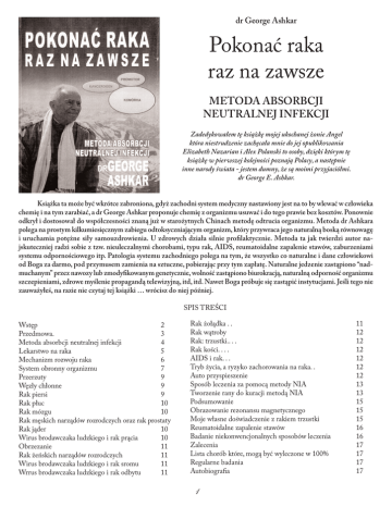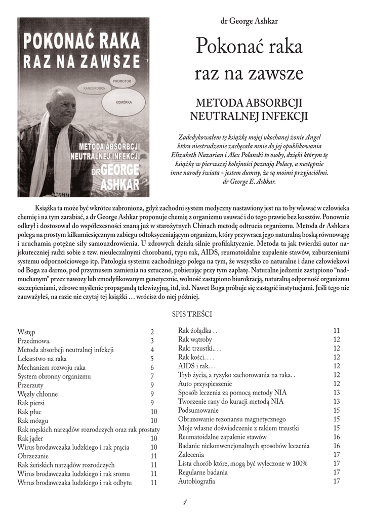 dr George Ashkar Pokonać raka raz na zawsze METODA ABSORBCJI NEUTRALNEJ INFEKCJI Zadedykowałem tę książkę mojej ukochanej żonie Angel która niestrudzenie zachęcała mnie do jej opublikowania Elizabeth Nazarian i Alex Polanski to osoby, dzięki którym tę książkę w pierwszej kolejności poznają Polacy, a następnie inne narody świata - jestem dumny, że są moimi przyjaciółmi. dr George E. Ashkar. Książka ta może być wkrótce zabroniona, gdyż zachodni system medyczny nastawiony jest na to by wlewać w człowieka chemię i na tym zarabiać, a dr George Ashkar proponuje chemię z organizmu usuwać i do tego prawie bez kosztów. Ponownie odkrył i dostosował do współczesności znaną już w starożytnych Chinach metodę odtrucia organizmu. Metoda dr Ashkara polega na prostym kilkumiesięcznym zabiegu odtoksyczniającym organizm, który przywraca jego naturalną boską równowagę i uruchamia potężne siły samouzdrowienia. U zdrowych działa silnie profilaktycznie. Metoda ta jak twierdzi autor najskuteczniej radzi sobie z tzw. nieuleczalnymi chorobami, typu rak, AIDS, reumatoidalne zapalenie stawów, zaburzeniami systemu odpornościowego itp. Patologia systemu zachodniego polega na tym, że wszystko co naturalne i dane człowiekowi od Boga za darmo, pod przymusem zamienia na sztuczne, pobierając przy tym zapłatę. Naturalne jedzenie zastąpiono “nadmuchanym” przez nawozy lub zmodyfikowanym genetycznie, wolność zastąpiono biurokracją, naturalną odporność organizmu szczepieniami, zdrowe myślenie propagandą telewizyjną, itd, itd. Nawet Boga próbuje się zastąpić instytucjami. Jeśli tego nie zauważyłeś, na razie nie czytaj tej książki … wrócisz do niej później. SPIS TREŚCI Wstęp 2 Przedmowa. 3 Metoda absorbcji neutralnej infekcji 4 Lekarstwo na raka 5 Mechanizm rozwoju raka 6 System obronny organizmu 7 Przerzuty 9 Węzły chłonne 9 Rak piersi 9 Rak płuc 10 Rak mózgu 10 Rak męskich narządów rozrodczych oraz rak prostaty Rak jąder 10 Wirus brodawczaka ludzkiego i rak prącia 10 Obrzezanie 11 Rak żeńskich narządów rozrodczych 11 Wirus brodawczaka ludzkiego i rak sromu 11 Wrrus brodawczaka ludzkiego i rak odbytu 11 Rak żołądka . . Rak wątroby Rak: trzustki.. . . Rak kości. . . . AIDS i rak. . . Tryb życia, a ryzyko zachorowania na raka. . Auto przyspieszenie Sposób leczenia za pomocą metody NIA Tworzenie rany do kuracji metodą NIA Podsumowanie Obrazowanie rezonansu magnetycznego Moje własne doświadczenie z rakiem trzustki Reumatoidalne zapalenie stawów Badanie niekonwencjonalnych sposobów leczenia Zalecenia Lista chorób które, mogą być wyleczone w 100% Regularne badania Autobiografia 1 11 12 12 12 12 12 12 13 13 15 15 15 16 16 17 17 17 17 WSTĘP To niesamowite, że tysiące naukowców, kosztem miliardów dolarów i dziesiątek lat badań, nie rozwiązało problemu raka, a tu pojawia się mało znany dr Ashkar i przekonuje, że uzdrowienie jest dziecinnie proste. Proponuje metodę, która -jak twierdzi - daje prawie stuprocentową skuteczność. Na dowód wspomina liczbę pięciuset uzdrowionych, do których sam się z radością zalicza. Koszt zabiegu szacuje zaledwie na kilka dolarów. Czy może słyszeli Państwo o tej metodzie? Nazywa się NIA (Neutral InfectionAbsorption). Nie? Przecież w czasach, gdy każdego dnia umiera na raka tysiące ludzi, powinni o tym pisać na pierwszych stronach gazet głosić we wszystkich czołówkach telewizyjnych wiadomości. Dlaczego tak nie jest? Być może z tego samego powodu ówcześni zabronili drukowania dzieł Kopernika: żeby zachować status quo, żeby rządzący systemem nie stracili zaszczytnych tytułów, dobrze płatnych posad, uznania, władzy i wpływu na ludzi. Proszę przez chwilę wyobrazić sobie, że żyją Państwo w czasach Mikołaja Kopernika. Wszyscy ,,mądrzy" i "święci" z poważnymi minami powtarzają Wam, że Słońce krąży wokół Ziemi, a tu jakiś mało znany człowiek nagle głosi, że jest odwrotnie. Nie znacie się na astronomii, więc skąd moglibyście wiedzieć, że taki Kopernik ma rację? Która teoria jest prawdziwa? Jest na to sposób. Po pierwsze, moglibyście zauważyć, że ,,mądrzy" i ,,święci" bardzo się zdenerwowali, gdy ktoś pokazał prawdę.Tak jest zawsze, gdyż prawda wstrząsa systemem. Podobnie było przy innym przewrocie - tym sprzed dwóch tysiącleci, gdy pojawił się pewien syn cieśli zwany Jezusem i zaczął twierdzić, że jest inaczej niż głoszą kapłani i uczeni. Mówił na przykład, że wybawienie od ograniczeń można osiągnąć już teraz - za życia, że można wyleczyć kogoś mocą i wiarą zawartą w nas. Nie tylko mówił, ale i pokazywał, że to prawda, że to działa. Ówcześni ,,mądrzy" i ,,święci" też bardzo się wtedy zdenerwowali. Czy prawda mieszka w gniewie i zdenerwowaniu? Na pewno nie. Drugą cechą prawdy jest prostota Kłamstwo musi być ubrane w zawiłe teorie i niezrozumiałe wyliczenia, aby przed pospólstwem ukryć swą nicość i szpetność. Po trzecie, prawda jest piękna. Można ją rozpoznać uczuciem. Jakże wielu geniuszy zauważyło, że głęboko pozytywne uczucia wskazują na prawdę. Wreszcie najważniejsze - prawdę można poznać po owocach. Warto się przyjrzeć jakie owoce mają poszczególne mmetody leczenia. Problem w tym, że ,,kapłani" starają się za wszelką cenę nie dopuścić, byśmy zaczęli myśleć samodzielnie. Jedynie myśląc samodzielnie będziemy zdolni dokonać przewrotu kopernikańskiego i właściwego wyboru. Wtedy będziemy wolni od ograniczeń, ale tylko w tej dziedzinie, w której dokonaliśmy przewrotu. ,,Prawda was wyzwoli" - mówił ówczesny "wywrotowiec" - Jezus Chrystus. W metodzie dr. Ashkara nie znajdziemy uczonych wywodów, skomplikowanych teorii, lecz porażającą prostotę. W jego przypadku też pojawili się zdenerwowani ,,kapłani", którzy aresztowali odkrywcę i zawlekli przed amerykański sąd w roku 1985, oskarżając