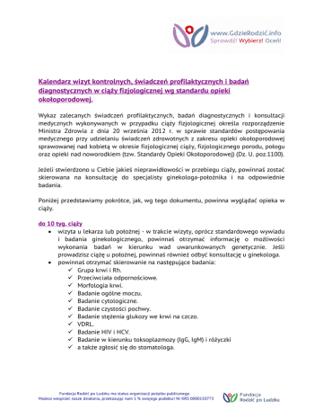 Kalendarz wizyt kontrolnych, świadczeń profilaktycznych i badań diagnostycznych w ciąży fizjologicznej wg standardu opieki okołoporodowej. Wykaz zalecanych świadczeń profilaktycznych, badań diagnostycznych i konsultacji medycznych wykonywanych w przypadku ciąży fizjologicznej określa rozporządzenie Ministra Zdrowia z dnia 20 września 2012 r. w sprawie standardów postępowania medycznego przy udzielaniu świadczeń zdrowotnych z zakresu opieki okołoporodowej sprawowanej nad kobietą w okresie fizjologicznej ciąży, fizjologicznego porodu, połogu oraz opieki nad noworodkiem (tzw. Standardy Opieki Okołoporodowej) (Dz. U. poz.1100). Jeżeli stwierdzono u Ciebie jakieś nieprawidłowości w przebiegu ciąży, powinnaś zostać skierowana na konsultację do specjalisty ginekologa-położnika i na odpowiednie badania. Poniżej przedstawiamy pokrótce, jak, wg tego dokumentu, powinna wyglądać opieka w ciąży. do 10 tyg. ciąży wizyta u lekarza lub położnej - w trakcie wizyty, oprócz standardowego wywiadu i badania ginekologicznego, powinnaś otrzymać informację o możliwości wykonania badań w kierunku wad uwarunkowanych genetycznie. Jeśli prowadzisz ciążę u położnej, powinnaś również odbyć konsultację u ginekologa. powinnaś otrzymać skierowanie na następujące badania: Grupa krwi i Rh. Przeciwciała odpornościowe. Morfologia krwi. Badanie ogólne moczu. Badanie cytologiczne. Badanie czystości pochwy. Badanie stężenia glukozy we krwi na czczo. VDRL. Badanie HIV i HCV. Badanie w kierunku toksoplazmozy (IgG, IgM) i różyczki a także zgłosić się do stomatologa. Fundacja Rodzić po Ludzku ma status organizacji pożytku publicznego. Możesz wesprzeć nasze działania, przekazując nam 1 % swojego podatku! Nr KRS 0000150773 11-14 tydzień ciąży wizyta kontrolna u lekarza lub położnej powinnaś otrzymać skierowania na następujące badania: Badanie ultrasonograficzne. Badanie ogólne moczu. Badanie cytologiczne, jeśli nie było wcześniej wykonane w okresie ciąży. 15-20 tydzień ciąży wizyta kontrolna u lekarza lub położnej powinnaś otrzymać skierowania na następujące badania: Morfologia krwi. Badanie ogólne moczu. Badanie czystości pochwy. Badanie cytologiczne, jeśli nie było wykonane wcześniej. 21-26 tydzień ciąży wizyta kontrolna u lekarza lub położnej – osoba sprawująca opiekę powinna skierować Cię do położnej podstawowej opieki zdrowotnej (położnej środowiskowo-rodzinnej), a także do szkoły rodzenia; powinnaś otrzymać skierowania na następujące badania: Badanie stężenia glukozy we krwi po doustnym podaniu 75g glukozy (w 24-28 tyg. ciąży) – dwukrotne oznaczenie stężenia glukozy: przed podaniem glukozy (na czczo) oraz po 2 godz. od podania glukozy. Badanie ultrasonograficzne. Badanie ogólne moczu. Przeciwciała anty-Rh u kobiet z Rh (-). U kobiet z ujemnym wynikiem w I trymestrze – badanie w kierunku toksoplazmozy. Badanie cytologiczne, jeśli nie było wykonane wcześniej. 27-32 tydzień ciąży wizyta kontrolna u lekarza lub położnej powinnaś otrzymać skierowania na następujące badania: Morfologia krwi. Badanie ogólne moczu. Przeciwciała odpornościowe. Badanie ultrasonograficzne. W przypadku występowania wskazań – podanie globuliny anty-D (28-30 tydz. ciąży). Badanie cytologiczne, jeśli nie było wcześniej wykonane w okresie ciąży. Fundacja Rodzić po Ludzku ma status organizacji pożytku publicznego. Możesz wesprzeć nasze działania, przekazując nam 1 % swojego podatku! Nr KRS 0000150773 33-37 tydzień ciąży wizyta kontrolna u lekarza lub położnej; jeśli prowadzisz ciążę u położnej, powinnaś również dodatkowo odbyć konsultację u ginekologa. powinnaś otrzymać skierowanie na badania: Morfologia krwi. Badanie ogólne moczu. Badanie czystości pochwy. Antygen HBs. Badanie w kierunku HIV. Posiew z przedsionka pochwy i okolic odbytu w kierunku paciorkowców B-hemolizujących. W grupie kobiet ze zwiększonym ryzykiem populacyjnym lub indywidualnym ryzykiem zakażenia: VDRL, HCV. Badanie cytologiczne, jeśli nie było wcześniej wykonane w okresie ciąży. 38-39 tydzień ciąży Wizyta kontrolna u lekarza lub położnej; jeśli prowadzisz ciążę u położnej, powinnaś również dodatkowo odbyć konsultację u ginekologa. Powinnaś otrzymać skierowanie na badania: Badanie ogólne moczu. Morfologia krwi. Po 40 tyg. ciąży powinnaś zgłaszać się do lekarza lub położnej co 2-3 dni na badanie KTG i USG (jeden raz). Gdy minie 41 tydzień ciąży, zostaniesz skierowana do szpitala. Fundacja Rodzić po Ludzku ma status organizacji pożytku publicznego. Możesz wesprzeć nasze działania, przekazując nam 1 % swojego podatku! Nr KRS 0000150773
