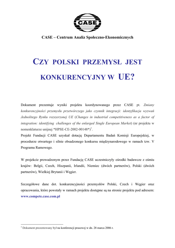 CASE – Centrum Analiz Społeczno-Ekonomicznych CZY POLSKI PRZEMYSŁ JEST KONKURENCYJNY W UE? Dokument prezentuje wyniki projektu koordynowanego przez CASE pt. Zmiany konkurencyjności przemysłu przetwórczego jako czynnik integracji: identyfikacja wyzwań Jednolitego Rynku rozszerzonej UE (Changes in industrial competitiveness as a factor of integration: identifying challenges of the enlarged Single European Market) (nr projektu w nomenklaturze unijnej *HPSE-CE-2002-00148*)1. Projekt Fundacji CASE uzyskał dotację Departamentu Badań Komisji Europejskiej, w procedurze otwartego i silnie obsadzonego konkursu międzynarodowego w ramach tzw. V Programu Ramowego. W projekcie prowadzonym przez Fundację CASE uczestniczyły ośrodki badawcze z ośmiu krajów: Belgii, Czech, Hiszpanii, Irlandii, Niemiec (dwóch partnerów), Polski (dwóch partnerów), Wielkiej Brytanii i Węgier. Szczegółowe dane dot. konkurencyjności przemysłów Polski, Czech i Węgier oraz opracowania, które powstały w ramach projektu dostępne są na stronie projektu pod adresem: www.compete.case.com.pl 1 Dokument prezentowany był na konferencji prasowej w dn. 28 marca 2006 r. 1. Zmiany konkurencyjności polskiego przemysłu przetwórczego (prof. Anna Wziątek-Kubiak, mgr Iga Magda) Konkurencyjność jest rozumiana jako zdolność do konkurowania i wygrywania walki konkurencyjnej. Mierniki konkurencyjności porównywane są do średniej unijnej. Badaniem objęto: • Wynik konkurencji na rynku krajowym i rozszerzonym rynku unijnym w latach 1996-2003 oraz w dwóch podokresach: lata 1996-1999 i 2000 -2003. • Zmiany czynników konkurencyjności względem średniej unijnej (UE-15): koszty pracy, wydajność pracy, jednostkowe koszty pracy jako stosunek kosztów pracy do wydajności pracy, stopę inwestycji, jakość towarów mierzoną cenami względnymi (polskimi do unijnych), koszty materiałowe. Przemysł przetwórczy w Polsce, lata 1996-2003 1996 Udział polskiego eksportu w unijnym rynku Udział polskiego eksportu do UE w eksporcie do UE 10 nowych członków UE Udział dostaw polskich wyrobów w 1,0% 1999 1,2% 2000 2003 1,4% 1,8% 27,4% 24,7% 25,6% 26,5% 66,0% 59,1% 58,8% 52,8% Koszty pracy do wydajności pracy PL do UE 0,77 0,79 0,75 0,62 Jakość towarów 0,43 0,50 0,53 0,67 Względna stopa inwestycji 0,73 0,66 0,70 0,69 krajowym rynku Nikły postęp w poprawie konkurencyjności polskiego przemysłu w latach 1996-1999 i zdecydowana poprawa konkurencyjności w latach 2000-2003. Cztery • • • • typy branż polskiego przemysłu: podwójni zwycięzcy (wygrywali konkurencje na krajowym i unijnym rynku) „ciągnieni” przez eksport, zorientowani na eksport przegrani. 2 Poziom 1996 Wzgl. jednostk. koszty pracy stopa inwestycji zatrudnienie jakość Udział w PL (%) Udział w UE Wzgl. jednostk. koszty pracy stopa inwestycji zatrudnienie jakość Udział w PL (%) Udział w UE Wzgl. jednostk. koszty pracy stopa inwestycji zatrudnienie jakość Udział w PL (%) Udział w UE Wzgl. jednostk. koszty pracy stopa inwestycji zatrudnienie jakość Udział w PL (%) Udział w UE Wzgl. jednostk. koszty pracy stopa inwestycji zatrudnienie jakość Udział w PL (%) Udział w UE 0,68 1998 2001 2003 1996 1998 Podwójni zwycięzcy (22 branż) 0,72 0,7 0,61 6 6,7 8,2 5,4 5,1 75,1 71,9 0,9% 75,7 69,6 1,1% 91,2 72,1 1,7% 91,6 71,7 2,0% 22 6,2 1 -3 18 Ciągnione przez eksport (23 branże) 0,8 0,81 0,76 0,57 1 7,6 8,7 5,3 6,2 56 56,4 1,2% 66,8 49 1,5% 71,1 41 2,5% 74,2 36,5 3,0% 14 -4,1 19 -13 27 Zorientowane na eksport (30 branż) 0,93 1,04 1,06 0,84 12 6 7,4 5,2 4,4 44,1 58,6 1,1% 46 53,3 1,1% 51,3 48,5 1,3% 53,6 45 1,4% 23 -10,5 4 -9 1 1,2 Przegrani (12 branż ) 1,34 1,41 1,17 12 6,7 6,6 5 5 34,4 41,1 1,3% 37,5 34,3 1,1% 40,4 29,6 0,9% 39,3 26,2 0,7% -1 -7,7 9 -17 -11 Zmiany ( w %) 1998- 2001- 19962001 2003 2003 -3 -13 -10 -34 -10,2 20 4 50 -6 2,2 0 -1 20 -24 -2,6 22 -0,3 111 -6 -25 -29 -39 -21,1 6 -16 68 17 3,5 4 -11 21 -18 -21,7 33 -35 159 2 -21 -10 -30 -22,6 12 -9 14 -15 -13,3 4 -7 11 -27 -39,9 22 -23 27 5 -17 -3 -24 -25,8 8 -14 -24 0 -11,3 -3 -11 -19 -25 -39,2 14 -36 -45 -19 -19 4 -3,6 3 -6 17% -21 -23,9 24 -19 73% Średnia dla analizowanych branż (87 branż) 0,77 0,81 0,77 0,62 5 -5 6,3 7,5 4,8 5 55 58,7 1,0% 58,8 54,1 1,2% 66,5 50,5 1,5% 68,2 47,6 1,8% 19 -3,5 7 -8 11% -36 -18,2 13 -7 33% 3 151 153 155 157 158 159 202 203 211 212 222 231 245 247 252 261 263 266 268 281 282 342 171 174 175 191 243 251 262 271 286 287 297 312 313 314 315 316 323 341 343 352 355 361 366 Podwójni zwycięzcy mięso i produkty mięsne owoce i warzywa przetworzone i zakonserwowane produkty mleczarskie karma dla zwierząt produkty spożywcze pozostałe napoje arkusze fornirowe; sklejka, płyty laminowane oraz inne rodzaje płyt wyroby stolarskie i ciesielskie dla budownictwa masa celulozowa, papier i wyroby z papieru wyroby z papieru i tektury usługi poligraficzne i usługi związane z poligrafią produkty pieców koksowniczych gliceryna; mydła i detergenty, perfumy i preparaty toaletowe włókna chemiczne wyroby z tworzyw sztucznych szkło i wyroby ze szkła płytki ceramiczne i płyty chodnikowe wyroby z betonu, gipsu i cementu produkty mineralne pozostałe niemetaliczne konstrukcje metalowe zbiorniki, cysterny, pojemniki nadwozia do pojazdów mechanicznych; przyczepy i naczepy Branże ciągnione przez eksport przędza włókiennicza i nici wyroby włókiennicze gotowe, z wyjątkiem odzieży wyroby włókiennicze pozostałe skóry wyprawione farby, lakiery i podobne środki pokrywające, gotowe sykatywy wyroby z gumy wyr. ceramiczne, poza wyr. ceramicznymi nieogniotrwałe do celów budowl. żeliwo, stal, żelazostopy i rury Wyr. nożownicze, narzędzia i drobne wyr. metalowe ogólnego stosowania wyroby metalowe gotowe pozostałe sprzęt gospodarstwa domowego, gdzie indziej nie sklasyfikowany osprzęt elektryczny rozdzielczy i kontrolny druty i przewody izolowane akumulatory, ogniwa i baterie galwaniczne sprzęt oświetleniowy i lampy elektryc