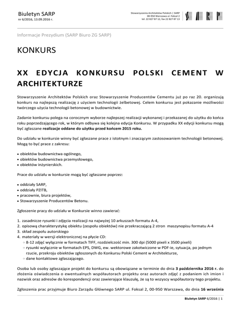 Biuletyn SARP nr 6/2016, 13.09.2016 r. Stowarzyszenia Architektów Polskich | SARP 00-950 Warszawa ul. Foksal 2 tel. 22 827 87 12, fax 22 827 87 13 Informacje Prezydium (SARP Biuro ZG SARP) KONKURS XX EDYCJA KONKURSU POLSKI CEMENT W ARCHITEKTURZE Stowarzyszenie Architektów Polskich oraz Stowarzyszenie Producentów Cementu już po raz 20. organizują konkurs na najlepszą realizację z użyciem technologii żelbetowej. Celem konkursu jest pokazanie możliwości twórczego użycia technologii betonowej w budownictwie. Zadanie konkursu polega na corocznym wyborze najlepszej realizacji wykonanej i przekazanej do użytku do końca roku poprzedzającego rok, w którym odbywa się kolejna edycja Konkursu. W przypadku XX edycji konkursu mogą być zgłaszane realizacje oddane do użytku przed końcem 2015 roku. Do udziału w konkursie winny być zgłaszane prace z istotnym i znaczącym zastosowaniem technologii betonowej. Mogą to być prace z zakresu: ● ● ● obiektów budownictwa ogólnego, obiektów budownictwa przemysłowego, obiektów inżynierskich. Prace do udziału w konkursie mogą być zgłaszane poprzez: ● ● ● ● oddziały SARP, oddziały PZITB, pracownie, biura projektów, Stowarzyszenie Producentów Betonu. Zgłoszenie pracy do udziału w Konkursie winno zawierać: 1. 2. 3. 4. zasadnicze rysunki i zdjęcia realizacji na najwyżej 10 arkuszach formatu A-4, opisową charakterystykę obiektu (zespołu obiektów) nie przekraczającą 2 stron maszynopisu formatu A-4 skład zespołu autorskiego materiały w wersji elektronicznej na płycie CD: 8-12 zdjęć wyłącznie w formatach TIFF, rozdzielczość min. 300 dpi (5000 pixeli x 3500 pixeli) rysunki wyłącznie w formatach EPS, DWG, ew. wektorowe zakotwiczone w PDF-ie, sytuacja, po jednym rzucie, przekroju obiektów zgłoszonych do Konkursu Polski Cement w Architekturze, dane kontaktowe zgłaszającego. ❍ ❍ ❍ Osoba lub osoby zgłaszające projekt do konkursu są obowiązane w terminie do dnia 3 października 2016 r. do złożenia oświadczenia o ewentualnych współautorach projektu oraz autorach zdjęć z podaniem ich imion i nazwisk oraz adresów do korespondencji oraz zawierające klauzulę, że są to wszyscy współautorzy tego projektu. Zgłoszenia prac przyjmuje Biuro Zarządu Głównego SARP ul. Foksal 2, 00-950 Warszawa, do dnia 16 września Biuletyn SARP 6/2016 | 1 Biuletyn SARP nr 6/2016, 13.09.2016 r. Stowarzyszenia Architektów Polskich | SARP 00-950 Warszawa ul. Foksal 2 tel. 22 827 87 12, fax 22 827 87 13 2016 r. do godz. 16:00. Pytania proszę kierować na adres: [email protected] Regulamin do pobrania: http://www.sarp.org.pl/pliki/2270_577e439e2ce18-regulamin_konkusu_polski_cement2016.pdf Informacje Prezydium (SARP Biuro ZG SARP) Konferencja NOWE OBLICZE BIM Konferencja NOWE OBLICZE BIM 29.11.2016 r, Warszawa, Multikino Złote Tarasy zaprasza firma WSC Witold Szymanik i S-ka Sp. z o.o. Wykorzystanie technologii BIM pozwala osiągnąć znaczne oszczędności podczas realizacji inwestycji i jej późniejszej eksploatacji. Wg szacunków brytyjskich, gdzie projektowanie BIM jest już obowiązkiem w inwestycjach publicznych, wdrożenie tej technologii może umożliwić dwukrotne przyspieszenie trwania budów i zmniejszenie ich kosztów o 1/3. Wirtualny model budowli obejmujący również zagadnienia branżowe staje się wstępną realizacją inwestycji i pozwala na eliminację błędów już na początkowym etapie cyklu jej życia. Konferencja NOWE OBLICZE BIM ma przyczynić się do popularyzacji technologii BIM w Polsce. Prelegentami będą polscy oraz zagraniczni specjaliści zajmujący się na co dzień problematyką BIM. Wśród prelegentów znajdą się m.in. Dr Ilka May - Arup, Antonio Ruivo Meireles - ndBIM Virtual Building, Ákos Rechtorisz - GRAPHISOFT, Paweł Wierzowiecki - Graph'it Studio, Maciej Dejer M.A.D. Engineers, Miklós Szövényi-Lux GRAPHISOFT. Wydarzenie ma charakter szkoleniowo-naukowy i skierowana jest do wszystkich osób zainteresowanych tematyką BIM, w tym architektów, inżynierów, projektantów, deweloperów, urzędników, wykonawców i producentów wyrobów budowlanych, a także nauczycieli akademickich i studentów. Organizatorzy konferencji zapraszają wszystkie osoby zainteresowane zastosowaniem najnowszych technologii informatycznych w przygotowaniu i kierowaniu procesami inwestycyjnymi. Biuletyn SARP 6/2016 | 2 Biuletyn SARP nr 6/2016, 13.09.2016 r. Stowarzyszenia Architektów Polskich | SARP 00-950 Warszawa ul. Foksal 2 tel. 22 827 87 12, fax 22 827 87 13 Patronat honorowy nad wydarzeniem objęło Stowarzyszenie Architektów Polskich SARP. Więcej informacji o wydarzeniu oraz formularz rejestracyjny można znaleźć na stronie www.wsc.pl/BIM2016 Informacje Prezydium (SARP Biuro ZG SARP) Forum Autodesk 6 października, PGE Narodowy w Warszawie: Forum Autodesk 2016 –The Future of Making Things Jak będzie wyglądała przyszłość tworzenia w Twojej firmie – sprawdź możliwości. Międzynarodowi eksperci, bogaty program merytoryczny, wystawa innowacyjnych rozwiązań. Dla wszystkich, którzy tworzą. Warszawa, 8 września 2016 – Autodesk zaprasza do udziału w największej konferencji poświęconej przyszłości oraz trendom w obszarze projektowania i tworzenia produktów. Już 6 października (czwartek) PGE Narodowy w Warszawie zgromadzi architektów, inżynierów, projektantów produktów, twórców gier i animacji oraz pasjonatów i użytkowników rozwiązań Autodesk. Rejestracja możliwa jest na stronie http://www.autodesk.pl/forumautodesk2016 Tematem przewodnim spotkania będzie FOMT – The Future of Making Things obejmujący m.in. takie zagadnienia jak: rozwój technologii i jej wpływ na projektowanie, tworzenie, użytkowanie, sprzedawanie i serwisowanie produktu; inteligentne maszyny; przetwarzanie w chmurze; internet rzeczy – czyli nowe możliwości dla rozwoju Biuletyn SARP 6/2016 | 3 Biuletyn SARP nr 6/2016, 13.09.2016 r. Stowarzyszenia Architektów Pol
