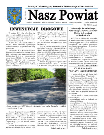 ISSN 1731-3325 Biuletyn Informacyjny Starostwa Powiatowego w Kozienicach Nasz Powiat Ekologia * Aktualności * Informacje gminne * Zdrowie * Finanse * Działalność placówek * Ochrona środowiska Nr 5/2011 (maj) INWESTYCJE DROGOWE W grudniu 2010 roku uchwalono budżet powiatu na 2011 rok, umożliwiło to wcześniejsze ogłoszenie przetargów, a co za tym idzie także wcześniejsze rozpoczęcie robót drogowych. W maju 2011 roku zostały oddane do użytku, przed terminem wynikającym z umów zawartych z wykonawcami drogi powiatowe: Przebudowa drogi powiatowej 1711W Ursynów-Aleksandrówka, gmina Kozienice – odcinek w m. Aleksandrówka, ul. Królewska o dł. 1128 m + zatoka autobusowa, koszt 497.000,- zł, (w tym gmina Kozienice 248.500,- zł), wykonawca: „TRANSMAR” Przedsiębiorstwo Handlowo-Usługowe Marek Sasin Radom, oddana 10.05.2011 r. Informacja Samodzielnego Publicznego Zespołu Zakładów 850 m, koszt 438.000,- zł (w tym 50.000,Opieki Zdrowotnej zł gmina Głowaczów); wykonawca w Kozienicach „Zyko-Dróg” Sp. z o.o. Radom, oddana 16.05.2011 r. Do 31 maja 2011 roku planowane jest zakończenie następujących robót drogowych: Remont drogi powiatowej nr 1742W Garbatka-Czarnolas – dwa odcinki drogi o dł. łącznej 1117 mb, koszt 525.000,zł (w tym 124.000,- zł gmina GarbatkaLetnisko) + chodniki obustronnie na dł. 264 mb. – ul. Czarnoleska w m. Garbatka-Letnisko, wykonawca „Zyko-Dróg” Sp. z o.o. Radom. Remont drogi powiatowej nr 1724W Kozienice-Mozolice Duże – odcinek o dł. 819 mb, koszt 241.000,- zł (w tym SP ZZOP w Kozienicach informuje, że poradnie kardiologiczna i endokrynologiczna zostały przeniesione na I piętro budynku „E”, zaś poradnie urazowo-ortopedyczna i chirurgiczna – do pomieszczeń w budynku „B”. Poradnie te zostały przeniesione tymczasowo, na czas przygotowania pomieszczeń docelowych w budynku „C”, dokąd przeniesione zostaną wszystkie poradnie SPZZOZ w Kozienicach. Pomieszczenia dotychczas zajmowane przez te poradnie zostaną wydzierżawione na działalność służącą pacjentom. Katarzyna Sadurska VII SESJA RADY POWIATU KOZIENICKIEGO Droga powiatowa 1711W Ursynów-Aleksandrówka, gmina Kozienice – odcinek w m. Aleksandrówka, Remont drogi powiatowej nr 1701W Grabów n/Pilicą-Augustów, odcinek Brzozówka – Augustów o dł. 710 m, koszt 390.000,- zł (w tym 50.000,- zł gmina Grabów nad Pilicą), wykonawca „Zyko-Dróg” Sp. z o.o. Radom, oddana 13.05.2011 r. Remont drogi powiatowej nr 1714W Głowaczów-Lipskie Budy, odcinek o dł. gmina Sieciechów 124.000,- zł), wykonawca „Zyko-Dróg” Sp. z o.o. Radom. Remont drogi powiatowej nr 1731W Sieciechów – Gniewoszów, odcinek Sławczyn-Oleksów o dł. 1813 mb, koszt 580.000,- zł (w tym gmina Gniewoszów 124.000,-zł), wykonawca Przedsiębiorstwo Robót Drogowych Sp. z o.o. Dokończenie na str. 2 11 maja odbyła się VII Sesja Rady Powiatu Kozienickiego IV kadencji. Radni zapoznali się z informacją Powiatowego Inspektora Sanitarnego dotyczącą oceny stanu sanitarno-epidemiologicznego powiatu kozienickiego za 2010 rok oraz sprawozdaniem z prac doraźnej Komisji ds. Legislacji. Dyrektor Powiatowego Urzędu Pracy przedstawił informacje o sytuacji na rynku pracy w powiecie kozienickim w 2010 roku. Podjęte zostały uchwały w następujących sprawach: – wprowadzenia zmian w budżecie powiatu na 2011 rok, – zmiany Statutu Powiatu Kozienickiego, – udzielenia pomocy finansowej Gminie Kozienice na realizację zadania „Termomodernizacja budynku przy ul. Warszawskiej 63 w m. Kozienice”, – udzielenia pomocy finansowej Gminie Grabów nad Pilicą na realizację zadania „Kanalizacja sanitarna Brzozówka I, Dąbrówki i Grabów Nowy – etap I budowa kanalizacji we wsi Dąbrówki, – udzielenia pomocy finansowej Gminie Garbatka-Letnisko na realizację zadania „Budowa sieci wodociągowej Dokończenie na str. 3 Informacje Dokończenie ze str. 1 INWESTYCJE DROGOWE Zwoleń. Przebudowa drogi powiatowej 1712W Ryczywół-Brzóza, gmina Kozienice – odcinek w m. Ryczywół o dł. 512 m + zatoka postojowa, koszt 270,000,- zł ,(w tym gmina Kozienice 135.000,-zł), wykonawca: Przedsiębiorstwo Robót Drogowych Sp. z o.o. Zwoleń, W czerwcu 2011 roku zostaną zakończone: Remont drogi powiatowej nr 1704W Magnuszew-Moniochy: A) odcinek I Magnuszew-Trzebień, gmina Magnuszew, koszt 375.000,- zł, (w tym gmina Magnuszew 100.000,-zł) B) odcinek II Grabnowola-Moniochy, gmina Głowaczów, koszt 274.00,- zł (w tym gmina Głowaczów 74.000,- zł), wykonawca „Zyko-Dróg” Sp. z o.o. Radom Remont drogi powiatowej nr 1710W Grabów n/Pilicą-Dziecinów, gm. Grabów n/Pilicą, koszt 254.000,- zł (w tym gmina Grabów nad Pilicą 74.000,-zł), wykonawca „Zyko-Dróg” Sp. z o.o. Radom. Przebudowa drogi powiatowej 1727W Kozienice-Śmietanki, gm. Kozienice – odcinek o dł. 1412 m, koszt 370.000,zł, (w tym gmina Kozienice 185.000,-zł), wykonawca: Zakład Transportowo-Budowlany Krzysztof Wach Pionki. Realizowana w ramach Narodowego Programu Przebudowy Dróg Lokalnych 2008-2011 przebudowa drogi powiatowej 1715W Brzóza – Radom odcinek Wólka Brzózka-Lewaszówka o dł. 4.993 mb w gminie Głowaczów zostanie zakończona do 31.08.2011 roku. Wartość zadania 2 432 669,- zł, w tym 1 216 334,-zł z budżetu państwa w ramach wniosku złożonego przez powiat kozienicki, 896 335,- zł środki finansowe powiatu, a 320.000,- zł gminy Głowaczów. W 2011 roku z budżetu powiatu kozienickiego, z byłego Powiatowego Funduszu Ochrony Środowiska i Gospodarki Wodnej gminy Garbatka-Letnisko, Głowaczów, Gniewoszów, Grabów nad Pilicą, Magnuszew, Sieciechów otrzymają po 186.000,- zł, a gmina Kozienice 300,000,- zł na inwestycje proekologiczne Danuta Delekta Nasz Powiat * OCENA STANU SANITARNEGO POWIATU ZA ROK 2010 PSSE W KOZIENICACH Sekcja Higieny Komunalnej Na terenie naszego powiatu liczącego 64 300 mieszkańców Oddział Higieny Komunalnej nadzoruje 21 wodociągów pu