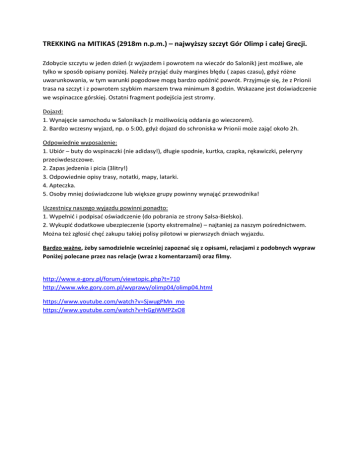 TREKKING na MITIKAS (2918m n.p.m.) – najwyższy szczyt Gór Olimp i całej Grecji. Zdobycie szczytu w jeden dzień (z wyjazdem i powrotem na wieczór do Salonik) jest możliwe, ale tylko w sposób opisany poniżej. Należy przyjąć duży margines błędu ( zapas czasu), gdyż różne uwarunkowania, w tym warunki pogodowe mogą bardzo opóźnić powrót. Przyjmuje się, że z Prionii trasa na szczyt i z powrotem szybkim marszem trwa minimum 8 godzin. Wskazane jest doświadczenie we wspinaczce górskiej. Ostatni fragment podejścia jest stromy. Dojazd: 1. Wynajęcie samochodu w Salonikach (z możliwością oddania go wieczorem). 2. Bardzo wczesny wyjazd, np. o 5:00, gdyż dojazd do schroniska w Prionii może zająć około 2h. Odpowiednie wyposażenie: 1. Ubiór – buty do wspinaczki (nie adidasy!), długie spodnie, kurtka, czapka, rękawiczki, peleryny przeciwdeszczowe. 2. Zapas jedzenia i picia (3litry!) 3. Odpowiednie opisy trasy, notatki, mapy, latarki. 4. Apteczka. 5. Osoby mniej doświadczone lub większe grupy powinny wynająć przewodnika! Uczestnicy naszego wyjazdu powinni ponadto: 1. Wypełnić i podpisać oświadczenie (do pobrania ze strony Salsa-Bielsko). 2. Wykupić dodatkowe ubezpieczenie (sporty ekstremalne) – najtaniej za naszym pośrednictwem. Można też zgłosić chęć zakupu takiej polisy pilotowi w pierwszych dniach wyjazdu. Bardzo ważne, żeby samodzielnie wcześniej zapoznać się z opisami, relacjami z podobnych wypraw Poniżej polecane przez nas relacje (wraz z komentarzami) oraz filmy. http://www.e-gory.pl/forum/viewtopic.php?t=710 http://www.wke.gory.com.pl/wyprawy/olimp04/olimp04.html https://www.youtube.com/watch?v=SjwugPMn_mo https://www.youtube.com/watch?v=hGgiWMPZxO8