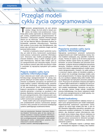 Inżynieria oprogramowania Rafał Kasprzyk Przegląd modeli cyklu życia oprogramowania T worzenie oprogramowania nie jest sprawą prostą i nikogo, kto brał udział w dużym projekcie, nie trzeba o tym przekonywać. Czasy, kiedy jedna osoba zajmowała się zbieraniem wymagań, analizą, projektowaniem, programowaniem, testowaniem i wdrażaniem produktu informatycznego dawno już się skończyły. „Programowanie odkrywcze” nie jest obecnie dobrym sposobem budowy jakichkolwiek systemów informatycznych. Tworzone dziś systemy są po prostu zbyt skomplikowane, aby przez cały cykl życia tych systemów mogła nad nimi panować jedna osoba. Trudności w budowaniu dużych systemów wymusiły, już wiele lat temu, konieczność usystematyzowania procesu wytwarzania systemów informatycznych. Stworzono więc modele porządkujące podejmowane działania i stany w jakich znajduje się produkt informatyczny. Obecnie zbiór modeli cykli życia oprogramowania jest niezwykle bogaty. Oczywiście wystarczy poznać tylko kilka kluczowych modeli, pozostałe są najczęściej hybrydami tych podstawowych. Pojęcie modelu cyklu życia systemu informatycznego Czym właściwie jest model cyklu życia systemu informatycznego (oprogramowania)? To szereg wzajemnie zależnych od siebie etapów, w których podejmowane są działania, począwszy od ujawnienia potrzeby budowy systemu informatycznego, prezentacji jego idei, konstrukcję, użytkowanie, przystosowane do ewentualnych zmian funkcjonowania (wynikających najczęściej ze względu na zmieniające się warunki otoczenia), a kończąc na wycofaniu z eksploatacji. Będziemy zajmować się tylko tą częścią cyklu życia oprogramowania, która związana jest z procesem wytwórczym i w związku z tym nazywana jest cyklem wytwarzania oprogramowania. Każdy model cyklu życia oprogramowania ma na celu przedstawienie procesu wytwarzania oprogramowania, który prowadzi do stworzenia działającego systemu spełniającego oczekiwania klienta. Autor jest absolwentem Wydziale Cybernetyki Wojskowej Akademii Technicznej, gdzie od roku zajmuje stanowisko asystenta w Instytucie Systemów Informatycznych. Pracuje w firmie ISOLUTION będąc odpowiedzialnym za przygotowywanie, prowadzenie i audyt szkoleń obejmujących analizę i projektowanie systemów informatycznych z użyciem notacji UML. Kontakt z autorem: [email protected] 52 www.sdjournal.org ���������������� ��������� ���������� ������ ������ ������ ��� ���������� ������ ��� ���������� ������ Rysunek 1. Programowanie odkrywcze Popularne modele cyklu życia systemu informatycznego Najczęściej wymienianym procesem wytwarzania oprogramowania jest model kaskadowy (zwany również modelem wodospadu, ang. waterfall) i model iteracyjny. Terminy te często są nie do końca poprawnie rozumiane. Bardzo często można się spotkać z przekonaniem, że proces kaskadowy jest procesem przestarzałym, a jedynie słusznym podejściem jest proces iteracyjny. Osobiście ostrożnie podchodzę do takiej oceny tych dwóch najpopularniejszych modeli wytwarzania oprogramowania. Uważam, że wybór procesu w znacznym stopniu zależy od charakteru projektu, a tym samym nie ma jednego słusznego modelu cyklu życia oprogramowania. Co więcej, najczęściej okazuje się, że w praktyce najlepiej radzą sobie modele, które są modyfikacjami lub hybrydami procesów podstawowych. Przyczyna ich powstania związana jest bądź to z wadami bądź trudnościami w adaptacji do rzeczywistych warunków wytwarzania systemów informatycznych modelu kaskadowego. Zauważmy, że sam proces iteracyjny stanowi swego rodzaju modyfikację procesu kaskadowego. Inne znane i popularne modele cyklu życia oprogramowania to model spiralny, model V, prototypowanie, i wiele innych. Model kaskadowy Najstarszym i prawdopodobnie najlepiej znanym cyklem życia oprogramowania jest model wodospadu. Najpowszechniej spotykanym argumentem zachęcającym do użycia tego modelu jest fakt, iż jest on dla człowieka najbardziej naturalnym sposobem rozwiązywania wszelkich problemów. W modelu kaskadowym, aby zbudować system informatyczny należy przejść przez kolejne etapy, których realizacja ma zapewnić zakończenie projektu. Etapy na jakie dzielony jest proces wytwarzania to: zbieranie wymagań, analiza, projektowanie, implementacja, testowanie i wdrożenie systemu. W modelu wodospadu wyjście z jednego etapu jest równocześnie wejściem w kolejny, bez możliwoSoftware Developer’s Journal 10/2006 Przegląd modeli cyklu życia oprogramowania l ����������������� l ������� l ������������� ������������� ���������� l ��������� Rysunek 2. Model kaskadowy ści powrotu. Zostaje zatem utworzona sztywno narzucona kolejność poszczególnych etapów. Analityk po stworzeniu modelu dziedziny problemu przekazuje wyniki swojej pracy projektantowi. Projektant, po stworzeniu projektu oprogramowania, w oparciu o wyniki etapu analizy, przekazuje go w ręce programisty, którego zadaniem jest jego implementacja. Następnie w celu zapewnienia wysokiej jakości produktu, kod jest testowany, a dopiero na samym końcu jest przekazywany klientowi. W procesie kaskadowym bardzo istotna jest forma przekazywania wyników z jednego etapu do drugiego. Niekiedy pojawiają się powroty, ale możliwość wystąpienia takiej sytuacji powinna być minimalizowana. Oczywistym jest przecież, że na przykład podczas implementacji może wystąpić jakiś problem, który zmusi zespół do powrotu do projektu lub co gorsza powtórnej analizy. Weryfikacja wyników poszczególnych etapów jest więc nieunikniona. Podstawowe cechy modelu kaskadowego niestety pokazują jednocześnie jego w