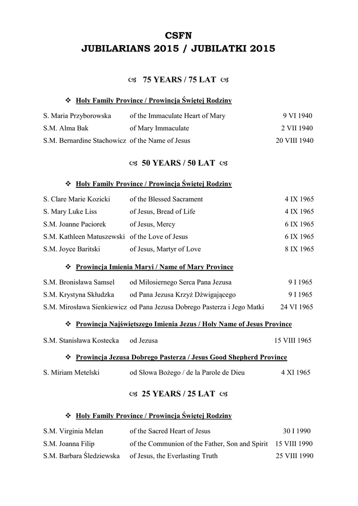 CSFN JUBILARIANS 2015 / JUBILATKI 2015 75 YEARS / 75 LAT Holy Family Province / Prowincja Świętej Rodziny S. Maria Przyborowska of the Immaculate Heart of Mary 9 VI 1940 S.M. Alma Bak of Mary Immaculate 2 VII 1940 S.M. Bernardine Stachowicz of the Name of Jesus 20 VIII 1940 50 YEARS / 50 LAT Holy Family Province / Prowincja Świętej Rodziny S. Clare Marie Kozicki of the Blessed Sacrament 4 IX 1965 S. Mary Luke Liss of Jesus, Bread of Life 4 IX 1965 S.M. Joanne Paciorek of Jesus, Mercy 6 IX 1965 S.M. Kathleen Matuszewski of the Love of Jesus 6 IX 1965 S.M. Joyce Baritski 8 IX 1965 of Jesus, Martyr of Love Prowincja Imienia Maryi / Name of Mary Province S.M. Bronisława Samsel od Miłosiernego Serca Pana Jezusa 9 I 1965 S.M. Krystyna Skłudzka od Pana Jezusa Krzyż Dźwigającego 9 I 1965 S.M. Mirosława Sienkiewicz od Pana Jezusa Dobrego Pasterza i Jego Matki 24 VI 1965 Prowincja Najświętszego Imienia Jezus / Holy Name of Jesus Province S.M. Stanisława Kostecka od Jezusa 15 VIII 1965 Prowincja Jezusa Dobrego Pasterza / Jesus Good Shepherd Province S. Miriam Metelski od Słowa Bożego / de la Parole de Dieu 4 XI 1965 25 YEARS / 25 LAT Holy Family Province / Prowincja Świętej Rodziny S.M. Virginia Melan of the Sacred Heart of Jesus 30 I 1990 S.M. Joanna Filip of the Communion of the Father, Son and Spirit 15 VIII 1990 S.M. Barbara Śledziewska of Jesus, the Everlasting Truth 25 VIII 1990 Prowincja Imienia Maryi / Name of Mary Province S.M. Modesta Latowska od Trójcy Świętej 31 I 1990 S.M. Bożydara Studnicka od Maryi Matki Najwyższego Kapłana 25 II 1990 S.M. Dobromiła Mielnicka od Boga Trójjedynego 29 IV 1990 S.M. Lidia Jankowicz od Ducha Świętego w Tajemnicy Krzyża 24 VI 1990 S.M. Danuta Lasek od Serca Jezusa Źródła Miłości 28 VI 1990 S.M. Augustyna Felkner od Chrystusa Najwyższego Kapłana 15 VIII 1990 S.M. Elena Wróbel od Nieskończonej Miłości 26 VIII 1990 S.M. Sergia Gaik od Niepokalanej Matki Wielkiego Zawierzenia 30 VIII 1990 S.M. Grażyna Nogaj od Jezusa Miłosiernego 2 IX 1990 S.M. Urszula Ściurka od Jezusa 8 IX 1990 S.M. Weronika Lisowska od Ojca Jezusa Chrystusa S.M. Janina Bąk od Ducha Świętego 2 X 1990 S.M. Edyta Glanowska od Jezusa Króla Miłości 21 X 990 S.M. Barbara Sarzyńska od Jezusa Ukrzyżowanego i Zmartwychwstałego 13 XII 1990 S. Marianna Słupczyńska od Maryi Matki Zbawiciela 30 XII 1990 15 IX 1990 Prowincja Najświętszego Imienia Jezus / Holy Name of Jesus Province S.M. Wiesława Hyzińska od Woli Bożej 21 I 1990 S.M. Bożena Stankiewicz od Matki Boga 8 II 1990 S.M. Sergia Czernek od Trójcy Świętej Źródła Miłosierdzia 8 II 1990 S.M. Immacolata Wilczak od Jezusa 28 II 1990 S.M. Noemi Leszczyńska od Boga Ojca Miłości Wiecznej 5 VII 1990 S.M. Julitta Prokopiuk od Miłości Bożej S.M. Lilianna Faszczewska od Jezusa Ukrzyżowanego i Maryi Oblubienicy Ducha Świętego 25 VIII 1990 25 VIII 1990 Prowincja Jezusa Dobrego Pasterza / Jesus Good Shepherd Province S.M. Aleksandra Król od Boga – Człowieka 11 II 1990 S.M. Teresita Brońska od Ducha Jezusa Chrystusa 10 VI 1990 Prowincja Bł. Męczennic / Bl. Martyrs Province S. Maria Bieluk od Krzyża 26 II 1990 Region Św. Michała Archanioła / St. Michael the Archangel Region S.M. Aneta Tobiasz od Krzyża 11 III 1990
