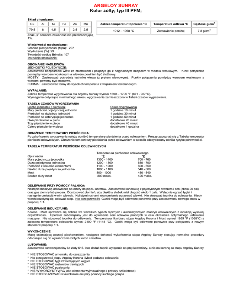 ARGELOY SUNRAY Kolor Ŝółty; typ III PFM; Skład chemiczny: Cu Al Ni Fe Zn Mn Zakres temperatur topnienia °C Temperatura odlewu °C Gęstość g/cm3 79,5 8 4,5 3 2,5 2,5 1012 – 1068 °C Zestawienie poniŜej 7,8 g/cm3 Znak „x” oznacza zawartość nie przekraczającą 1%. Właściwości mechaniczne: Granica plastyczności (Mpa): 207 WydłuŜenie (%): 29 Twardość według Brinella: 107 Instrukcja stosowania: OBCINANIE NADLEWÓW: JEDNOSTKI POJEDYNCZE: Zastosować bezpośredni wlew ze zbiornikiem i połączyć go z najgrubszym miejscem w modelu woskowym. Punkt połączenia pomiędzy wzorcem woskowym a wlewem powinien być stoŜkowy. MOSTY: Zastosować pośrednią technikę wlewu (z prętem wlewowym). Punkty połączenia pomiędzy wzorcem woskowym a wlewami powinny być stoŜkowe. FORMA: Zastosować formy do wysokich temperatur z wiązaniem fosforanowym. WYPALANIE: Zakres temperatur wygrzewania dla Argeloy Sunray wynosi 1600 – 1700 °F (871 - 927°C). Wymagania dotyczące minimalnego okresu wygrzewania zamieszczono w Tabeli czasów wygrzewania. TABELA CZASÓW WYGRZEWANIA Liczba jednostek / pierścieni Mały pierścień pojedynczej jednostki Pierścień na dwie/trzy jednostki Pierścień na cztery/pięć jednostek Dwa pierścienie w piecu Trzy pierścienie w piecu Cztery pierścienie w piecu Okres wygrzewania 1 godzina 10 minut 1 godzina 30 minut 1 godzina 50 minut dodatkowo 20 minut dodatkowo 40 minut dodatkowo 1 godzina OBNIśENIE TEMPERATURY PIERŚCIENIA: Po zakończeniu wygrzewania naleŜy obniŜyć temperaturę pierścienia przed odlewaniem. Proszę zapoznać się z Tabelą temperatur pierścieni odlewniczych. ObniŜenie temperatury pierścienia przed odlewaniem w sposób zdecydowany obniŜa ryzyko porowatości. TABELA TEMPERATUR PIERŚCIENI ODLEWNICZYCH Opis wzoru Mała pojedyncza jednostka DuŜa pojedyncza jednostka Pierścień z wieloma elementami Bardzo duŜa pojedyncza jednostka Most Bardzo duŜy most Temperatura pierścienia odlewniczego °F °C 1300 - 1400 700 - 760 1200 - 1300 650 - 700 1100 - 1200 600 - 650 1000 - 1100 540 - 600 800 - 1000 450 - 540 800 maks. 425 maks. ODLEWANIE PRZY POMOCY PALNIKA: Nakręcić maszynę odlewniczą na cztery do pięciu obrotów. Zastosować końcówkę z pojedynczym otworem i tlen (około 20 psi) oraz gaz ziemny lub propan. Dostosować płomień, aby błękitny stoŜek miał długość około 1 cala. Wstępnie ogrzać tygiel i następnie umieścić w nim wlewek. Kolistymi ruchami równomiernie ogrzewać wlewki. Nie stosować topnika do odlewania. Kiedy wlewki rozpłyną się, odlewać stop. Nie przegrzewać!) Guziki mogą być odlewane ponownie przy zastosowaniu nowego stopu w proporcji 1:1. ODLEWANIE INDUKCYJNE: Korona i Most sprawdza się dobrze we wszelkich typach ręcznych i automatycznych maszyn odlewniczych z indukcją wysokiej częstotliwości. Operator zobowiązany jest do wykonania serii odlewów próbnych w celu określenia optymalnego ustawienia maszyny. Nie stosować topnika do odlewania. Temperatura likwidusu stopu Argeloy Korona i Most wynosi 1955 °F (1068°C) a zalecana temperatura odlewania wynosi 2100 °F (1148 °C). Guziki mogą być odlewane ponownie przy połączeniu z nowym stopem w proporcji 1:1. WYKOŃCZENIE: Masę osłaniającą usunąć piaskowaniem, następnie dokonać wykończenia stopu Argeloy Sunray stosując normalne procedury odnoszące się do wykańczania złotych koron i mostów. LUTOWANIE: Zastosować konwencjonalny lut złoty 615, lecz dodać topnik wyłącznie na pręt lutowniczy, a nie na koronę ze stopu Argeloy Sunray * * * * * * * NIE STOSOWAĆ amoniaku do czyszczenia Nie przegrzewać stopu Argeloy Korona i Most podczas odlewania NIE STOSOWAĆ tygli zawierających węgiel NIE STOSOWAĆ roztworów trawiących NIE STOSOWAĆ pozłacania NIE WYKORZYSTYWAĆ jako elementu wyjmowalnego ( protezy szkieletowe) NIE STERYLIZOWAĆ w autoklawie ani przy pomocy suchego gorąca