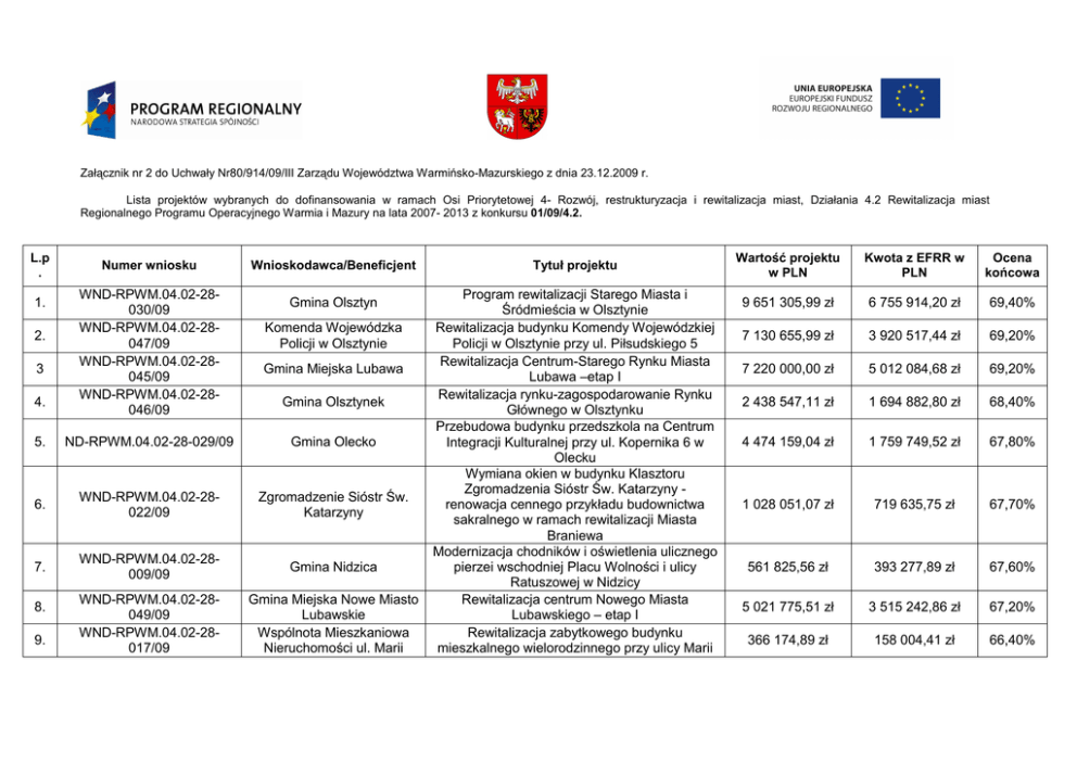 Załącznik nr 2 do Uchwały Nr80/914/09/III Zarządu Województwa Warmińsko-Mazurskiego z dnia 23.12.2009 r. Lista projektów wybranych do dofinansowania w ramach Osi Priorytetowej 4- Rozwój, restrukturyzacja i rewitalizacja miast, Działania 4.2 Rewitalizacja miast Regionalnego Programu Operacyjnego Warmia i Mazury na lata 2007- 2013 z konkursu 01/09/4.2. L.p . 1. 2. 3 4. Numer wniosku WND-RPWM.04.02-28030/09 WND-RPWM.04.02-28047/09 WND-RPWM.04.02-28045/09 WND-RPWM.04.02-28046/09 Wnioskodawca/Beneficjent Gmina Olsztyn Komenda Wojewódzka Policji w Olsztynie Gmina Miejska Lubawa Gmina Olsztynek 5. ND-RPWM.04.02-28-029/09 Gmina Olecko 6. WND-RPWM.04.02-28022/09 Zgromadzenie Sióstr Św. Katarzyny 7. WND-RPWM.04.02-28009/09 Gmina Nidzica WND-RPWM.04.02-28049/09 WND-RPWM.04.02-28017/09 Gmina Miejska Nowe Miasto Lubawskie Wspólnota Mieszkaniowa Nieruchomości ul. Marii 8. 9. Tytuł projektu Program rewitalizacji Starego Miasta i Śródmieścia w Olsztynie Rewitalizacja budynku Komendy Wojewódzkiej Policji w Olsztynie przy ul. Piłsudskiego 5 Rewitalizacja Centrum-Starego Rynku Miasta Lubawa –etap I Rewitalizacja rynku-zagospodarowanie Rynku Głównego w Olsztynku Przebudowa budynku przedszkola na Centrum Integracji Kulturalnej przy ul. Kopernika 6 w Olecku Wymiana okien w budynku Klasztoru Zgromadzenia Sióstr Św. Katarzyny renowacja cennego przykładu budownictwa sakralnego w ramach rewitalizacji Miasta Braniewa Modernizacja chodników i oświetlenia ulicznego pierzei wschodniej Placu Wolności i ulicy Ratuszowej w Nidzicy Rewitalizacja centrum Nowego Miasta Lubawskiego – etap I Rewitalizacja zabytkowego budynku mieszkalnego wielorodzinnego przy ulicy Marii Wartość projektu w PLN Kwota z EFRR w PLN Ocena końcowa 9 651 305,99 zł 6 755 914,20 zł 69,40% 7 130 655,99 zł 3 920 517,44 zł 69,20% 7 220 000,00 zł 5 012 084,68 zł 69,20% 2 438 547,11 zł 1 694 882,80 zł 68,40% 4 474 159,04 zł 1 759 749,52 zł 67,80% 1 028 051,07 zł 719 635,75 zł 67,70% 561 825,56 zł 393 277,89 zł 67,60% 5 021 775,51 zł 3 515 242,86 zł 67,20% 366 174,89 zł 158 004,41 zł 66,40% Curie Skłodowskiej 9 w Olsztynie Parafia Rzymskokatolicka Św. Apostołów Piotra i Pawła w Lidzbarku Warmińskim 10. WND-RPWM.04.02-28010/09 11. WND-RPWM.04.02-28020/09 Gmina Morąg 12. WND-RPWM.04.02-28019/09 Gmina Morąg 13. WND.RPWM.04.02-28004/09 Powiatowy Szpital im. Władysława Biegańskiego w Iławie 14. WND-RPWM.04.02-28055/09 Stowarzyszenie Pomocy Dzieciom i Rodzinie „ARKA” 15. WND-RPWM.04.02-28006/09 Wspólnota Mieszkaniowa Nieruchomości przy Placu Pułaskiego 3 RAZEM: Curie Skłodowskiej 9 w Olsztynie Odnowa nawierzchni Placu Kościelnego wokół Kościoła Parafii Rzymskokatolickiej Św. Apostołów Piotra i Pawła w Lidzbarku Warmińskim Poprawa bezpieczeństwa publicznego poprzez budowę bezprzewodowego systemu monitoringu miejskiego w Morągu Przebudowa dróg wewnętrznych, parkingów i przejść dla pieszych na Osiedlu Pułaskiego w Morągu Remont i adaptacja budynku kuchni i pralni Powiatowego Szpitala im. Władysława Biegańskiego w Iławie na ośrodek rehabilitacji Rewitalizacja budynku przy ul. Niepodległości 85: 1) Izolacja ścian zewnętrznych piwnic; 2) Remont elewacji; 3)Ukształtowanie i zagospodarowanie terenu Poprawa estetyki i atrakcyjności Śródmieścia, poprzez rewitalizacje budynku mieszkalnego wielorodzinnego przy Placu Pułaskiego 3 w Olsztynie 799 929,60 zł 559 950,72 zł 65,80% 275 888,46 zł 193 121,92 zł 64% 1 403 936,31 zł 982 755,42 zł 63% 8 231 691,36 zł 5 762 183,95 zł 61,40% 5 438 331,01 zł 2 336 831,70 zł 61% 92 773,40 zł 64 941,38 zł 54 135 045,30 zł *Ocena KOP stanowi 80% oceny końcowej **Ocena strategiczna stanowi20% oceny końcowej Urząd Marszałkowski Województwa Warmińsko-Mazurskiego ul. E.Plater 1, 10-562 Olsztyn Departament Zarządzania Programami Rozwoju Regionalneg lokalizacja Departamentu: Ul. Kościuszki 83, 10-950 Olsztyn tel. /0-89/ 521-96-00 fax./0-89/ 521-96-09 www.rpo.warmia.mazury.pl [email protected] 33 829 094,64zł 56,80%