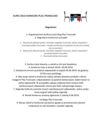 EURO 2016 KONKURS PLAC FRANCUSKI Regulamin: 1. Organizatorem konkursu jest blog Plac Francuski 2. Nagrodą w konkursie są książki 1. Słowniczek piłkarski polski, niemiecki, angielski, francuski, włoski, hiszpański + rozmówki polsko-francuskie + książka kucharska (z przepisami kuchni francuskiej rzecz oczywista ) 2. Słowniczek piłkarski polski, niemiecki, angielski, francuski, włoski, hiszpański + rozmówki polsko-francuskie 3. Rozmówki polsko-francuskie 3. Konkurs jest otwarty, a udział w nim jest bezpłatny. 4. Konkursu trwa w dniach 30.05.-03.06.2016. 5. Ostateczny termin przesłania odpowiedzi to piątek 03.06 2016 do godziny 23:59 czasu polskiego. 6. Aby wziąć udział w konkursie należy zakupić dowolny produkt z oferty księgarni Plac Francuski i odpowiedzieć na pytanie konkursowe. Jeden towar to jedna odpowiedź. W przypadku zakupu większej ilości towaru ilość konkursowych odpowiedzi równa jest ilości zakupionego towaru. 7. Nagrody trafia do autorów trzech najciekawszych odpowiedzi. Jedna osoba może wygrać tylko jedną nagrodę. 8. Wyniki konkursu zostaną ogłoszone 2 sobotę 4.06.2016. na blogu Plac Francuski 9. Biorąc udział w konkursie wyrażacie zgodę na przetwarzanie danych osobowych w celu kontaktu i wysyłki nagrody.