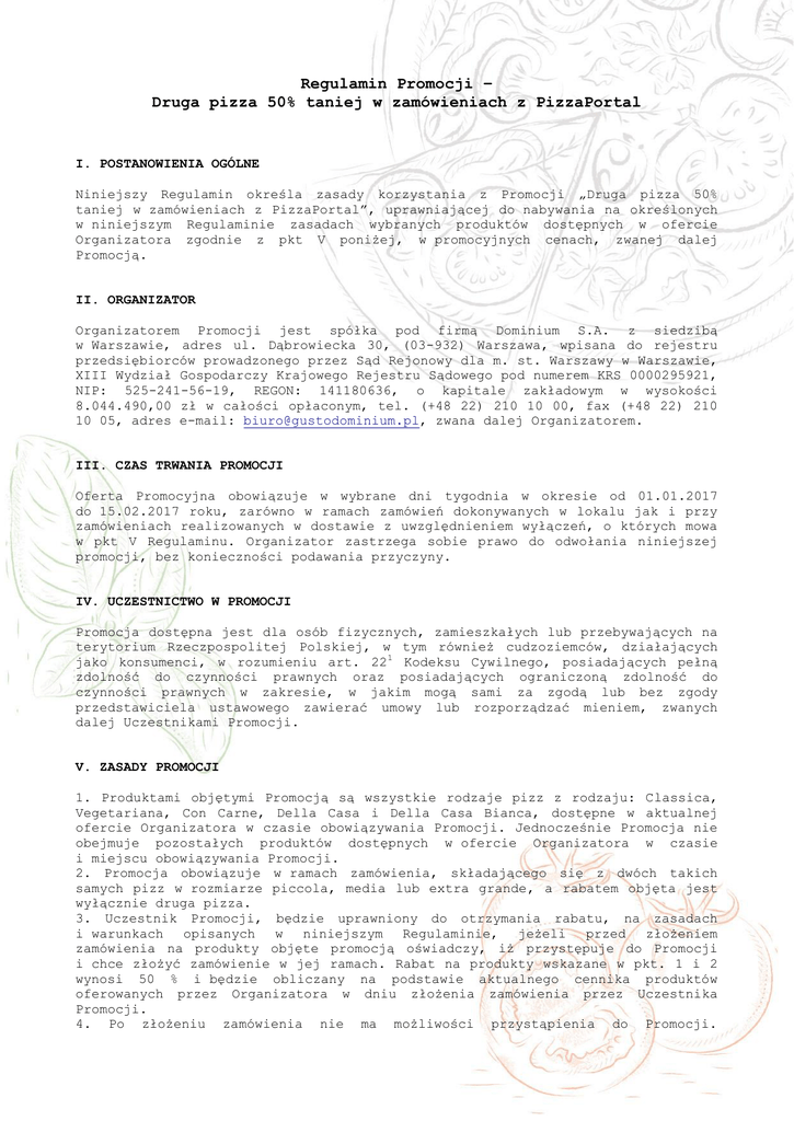 Regulamin Promocji – Druga pizza 50% taniej w zamówieniach z PizzaPortal I. POSTANOWIENIA OGÓLNE Niniejszy Regulamin określa zasady korzystania z Promocji „Druga pizza 50% taniej w zamówieniach z PizzaPortal”, uprawniającej do nabywania na określonych w niniejszym Regulaminie zasadach wybranych produktów dostępnych w ofercie Organizatora zgodnie z pkt V poniżej, w promocyjnych cenach, zwanej dalej Promocją. II. ORGANIZATOR Organizatorem Promocji jest spółka pod firmą Dominium S.A. z siedzibą w Warszawie, adres ul. Dąbrowiecka 30, (03-932) Warszawa, wpisana do rejestru przedsiębiorców prowadzonego przez Sąd Rejonowy dla m. st. Warszawy w Warszawie, XIII Wydział Gospodarczy Krajowego Rejestru Sądowego pod numerem KRS 0000295921, NIP: 525-241-56-19, REGON: 141180636, o kapitale zakładowym w wysokości 8.044.490,00 zł w całości opłaconym, tel. (+48 22) 210 10 00, fax (+48 22) 210 10 05, adres e-mail: [email protected], zwana dalej Organizatorem. III. CZAS TRWANIA PROMOCJI Oferta Promocyjna obowiązuje w wybrane dni tygodnia w okresie od 01.01.2017 do 15.02.2017 roku, zarówno w ramach zamówień dokonywanych w lokalu jak i przy zamówieniach realizowanych w dostawie z uwzględnieniem wyłączeń, o których mowa w pkt V Regulaminu. Organizator zastrzega sobie prawo do odwołania niniejszej promocji, bez konieczności podawania przyczyny. IV. UCZESTNICTWO W PROMOCJI Promocja dostępna jest dla osób fizycznych, zamieszkałych lub przebywających na terytorium Rzeczpospolitej Polskiej, w tym również cudzoziemców, działających jako konsumenci, w rozumieniu art. 221 Kodeksu Cywilnego, posiadających pełną zdolność do czynności prawnych oraz posiadających ograniczoną zdolność do czynności prawnych w zakresie, w jakim mogą sami za zgodą lub bez zgody przedstawiciela ustawowego zawierać umowy lub rozporządzać mieniem, zwanych dalej Uczestnikami Promocji. V. ZASADY PROMOCJI 1. Produktami objętymi Promocją są wszystkie rodzaje pizz z rodzaju: Classica, Vegetariana, Con Carne, Della Casa i Della Casa Bianca, dostępne w aktualnej ofercie Organizatora w czasie obowiązywania Promocji. Jednocześnie Promocja nie obejmuje pozostałych produktów dostępnych w ofercie Organizatora w czasie i miejscu obowiązywania Promocji. 2. Promocja obowiązuje w ramach zamówienia, składającego się z dwóch takich samych pizz w rozmiarze piccola, media lub extra grande, a rabatem objęta jest wyłącznie druga pizza. 3. Uczestnik Promocji, będzie uprawniony do otrzymania rabatu, na zasadach i warunkach opisanych w niniejszym Regulaminie, jeżeli przed złożeniem zamówienia na produkty objęte promocją oświadczy, iż przystępuje do Promocji i chce złożyć zamówienie w jej ramach. Rabat na produkty wskazane w pkt. 1 i 2 wynosi 50 % i będzie obliczany na podstawie aktualnego cennika produktów oferowanych przez Organizatora w dniu złożenia zamówienia przez Uczestnika Promocji. 4. Po złożeniu zamówienia nie ma możliwości przystąpienia do Promocji. W przypadku niezłożenia oświadczenia o przystąpieniu do Promocji zamawiający nie będzie objęty jej zasadami, a ceny na zamówione produkty będą odpowiadać aktualnemu cennikowi produktów Organizatora w lokalu. 5. Nie ma możliwości realizacji Promocji po okresie jej obowiązywania. 6. Promocji nie można łączyć z żadnymi innymi promocjami i rabatami dostępnymi w ofercie sieci restauracji Organizatora. 7. Zamówienia w dostawie realizowane są po uprzednim złożeniu zamówienia poprzez serwis do zamawiania jedzenia online PizzaPortal, dostępny pod adresem www.pizzaportal.pl. 8. Promocje obowiązują w lokalach sieci Organizatora na terenie Polski wskazanych w zał. nr 1 do Regulaminu Promocji. Organizator dla wykluczenia wątpliwości oświadcza, że Promocją nie są objęte lokale w: Zielonej Górze, Poznaniu (Centrum Handlowe M1), Krakowie (Kraków Galeria), Warszawie (Krakowskie Przedmieście), Płocku, Katowicach (Galeria Katowicka), Zakopanem (Krupówki 51, Gubałówka), Międzybrodziu Bialskim (Góra Żar), Jastarni, Jastrzębiej Górze na Helu oraz we Władysławowie, W przypadku zamówień w dostawie Promocja obowiązuje wyłącznie w placówkach, realizujących zamówienia w dostawie z wyłączeniem Jastarni, Jastrzębiej Góry i Władysławowa. Lista restauracji Organizatora dostępna jest na stronie www.gustodominium.pl/lokale. 9. Warunkiem skorzystania z Promocji w dostawie jest złożenie zamówienia o minimalnej wartości 25 złotych, bez kosztów dostawy. VI. REKLAMACJE I SKARGI 1. Wszelkie reklamacje lub skargi powinny być kierowane drogą elektroniczną na adres: [email protected] lub pisemnie na adres: Dominium S.A., ul. Dąbrowiecka 30, 03-932 Warszawa, bądź składane w siedzibie Organizatora. 2. Reklamacje lub skargi powinny zawierać imię, nazwisko i dokładny adres Uczestnika Promocji, jak również opis podstaw reklamacji lub skargi. 3. Organizator rozpatrzy zgłoszoną reklamację lub skargę w terminie 14 dni od otrzymania pisma reklamacyjnego lub skargi. W tym terminie Organizator poinformuje również Uczestnika Promocji, w takim sam sposób, w jaki reklamacja lub skarga została złożona, czyli drogą e-mailową lub pisemną, o wyniku złożonej reklamacji lub skargi. Po wyczerpaniu drogi reklamacyjnej Uczestnikowi Promocji przysługuje prawo dochodzenia roszczeń na zasadach ogólnych. VII. POSTANOWIENIA KOŃCOWE 1. Niniejsza treść jest pełną wersją Regulaminu Promocji, dostępną pod adresem: www.gustodominium.pl/regulaminy-promocji lub w siedzibie Organizatora. 2. Uczestnikowi Promocji nie przysługuje prawo do odstąpienia od umowy zawartej na zasadach określonych w niniejszym Regulaminie. 3. W sprawach nieuregulowanych niniejszym Regulaminem zastosowanie znajdować będą powszechnie obowiązujące przepisy prawne. Załącznik do Regulaminu nr 1 Lista restauracji Organizatora objętych Promocją Marka Miejscowość Gusto Dominium Białystok Ce