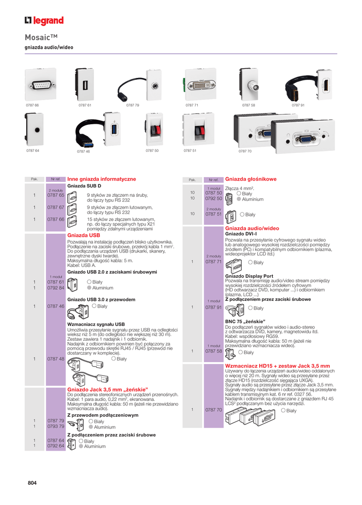 Mosaic™ gniazda audio/wideo 0787 66 0787 61 0787 64 Pak. 0787 46 Nr ref. 0787 79 2 moduły 0787 71 0787 50 Inne gniazda informatyczne 1 0787 659 styków ze złączem na śruby, do łączy typu RS 232 1 0787 679 styków ze złączem lutowanym, do łączy typu RS 232 1 0787 51 Nr ref. 10 10 0787 50 0792 50 10 0787 51 1 moduł Gniazdo USB 3.0 z przewodem 1 0787 46 Biały Wzmacniacz sygnału USB Umożliwia przesyłanie sygnału przez USB na odległości wieksz niż 5 m (do odległości nie większej niż 30 m). Zestaw zawiera 1 nadajnik i 1 odbiornik. Nadajnik z odbiornikiem powinien być połączony za pomocą przewodu skrętki RJ45 / RJ45 (przewód nie dostarczany w komplecie). 1 0787 48 Biały Złącza 4 mm². Biały Aluminium Biały Gniazda audio/wideo Gniazda USB Pozwalają na instalację podłączeń blisko użytkownika. Podłączenie na zaciski śrubowe, przekrój kabla 1 mm2. Do podłączania urządzeń USB (drukarki, skanery, zewnętrzne dyski twarde). Maksymalna długość kabla: 5 m. Kabel: USB A. Gniazdo USB 2.0 z zaciskami śrubowymi 1 moduł 1 0787 61 Biały 1 0792 84 Aluminium Gniazda głośnikowe 2 moduły 0787 6615 styków ze złączem lutowanym, np. do łączy specjalnych typu X21 pomiędzy zdalnymi urządzeniami 0787 91 0787 70 Pak. Gniazda SUB D 0787 58 2 moduły 1 0787 71 1 moduł Gniazdo DVI-I Pozwala na przesyłanie cyfrowego sygnału wideo lub analogowego wysokiej rozdzielczości pomiędzy źródłem (PC) i kompatybilnym odbiornikiem (plazma, wideoprojektor LCD itd.) Biały Gniazdo Display Port Pozwala na transmisję audio/video stream pomiędzy wysokiej rozdzielczości źródełem cyfrowym (HD odtwarzacz DVD, komputer ...) i odbiornikiem (plazma, LCD ...) Z podłączeniem przez zaciski śrubowe 1 0787 91 1 BNC 75 „żeńskie” Do podłączeń sygnałów wideo i audio-stereo z odtwarzacza DVD, kamery, magnetowidu itd. Kabel: współosiowy RG59. Maksymalna długość kabla: 50 m (jeżeli nie 1 moduł przewidziano wzmacniacza wideo). 0787 58 Biały Biały Wzmacniacz HD15 + zestaw Jack 3,5 mm Używany do łączenia urządzeń audio/wideo oddalonych o więcej niż 20 m. Sygnały wideo są przesyłane przez złącze HD15 (rozdzielczość sięgająca UXGA). Sygnały audio są przesyłane przez złącze Jack 3,5 mm. Sygnały między nadajnikiem i odbiornikiem są przesyłane kablem transmisyjnym kat. 6 nr ref. 0327 56. Nadajnik i odbiornik są dostarczane z gniazdem RJ 45 LCS² podłączanym bez użycia narzędzi. Gniazdo Jack 3,5 mm „żeńskie” 1 1 Do podłączenia stereofonicznych urządzeń przenośnych. Kabel: 1 para audio, 0,22 mm2, ekranowana. Maksymalna długość kabla: 50 m (jeżeli nie przewidziano wzmacniacza audio). Z przewodem podłączeniowym 0787 79 Biały 0793 79 Aluminium 1 1 0787 64 0792 64 804 Z podłączeniem przez zaciski śrubowe Biały Aluminium 1 0787 70 Biały