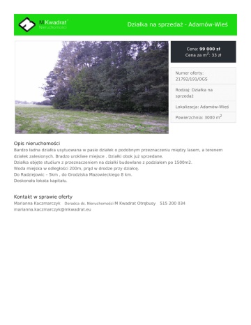 Działka na sprzedaż - Adamów-Wieś Cena: 99 000 zł Cena za m2: 33 zł Numer oferty: 21792/191/OGS Rodzaj: Działka na sprzedaż Lokalizacja: Adamów-Wieś Powierzchnia: 3000 m2 Opis nieruchomości Bardzo ładna działka usytuowana w pasie działek o podobnym przeznaczeniu między lasem, a terenem działek zalesionych. Bradzo urokliwe miejsce . Działki obok już sprzedane. Działka objęte studium z przeznaczeniem na działki budowlane z podziałem po 1500m2. Woda miejska w odległości 200m, prąd w drodze przy działcę. Do Radziejowic – 5km , do Grodziska Mazowieckiego 8 km. Doskonała lokata kapitału. Kontakt w sprawie oferty Marianna Kaczmarczyk Doradca ds. Nieruchomości M Kwadrat Otrębusy [email protected] 515 200 034
