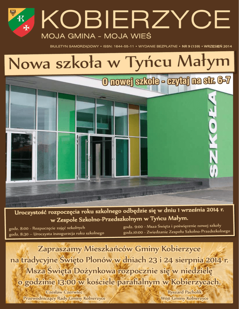 1 NR 9 (159) WRZESIEŃ 2014 Nowa szkoła w Tyńcu Małym O nowej szkole - czytaj na str. 6-7 Uroczystość rozpoczęcia roku szkolnego odbędzie się w dniu 1 września 2014 r. w Zespole Szkolno-Przedszkolnym w Tyńcu Małym. godz. 8:00 - Rozpoczęcie zajęć szkolnych godz. 8:30 – Uroczysta inauguracja roku szkolnego godz. 9:00 - Msza Święta i poświęcenie nowej szkoły godz.10:00 - Zwiedzanie Zespołu Szkolno-Przedszkolnego Zapraszamy Mieszkańców Gminy Kobierzyce na tradycyjne Święto Plonów w dniach 23 i 24 sierpnia 2014 r. Msza Święta Dożynkowa rozpocznie się w niedzielę o godzinie 13:00 w kościele parafialnym w Kobierzycach. Czesław Czerwiec Przewodniczący Rady Gminy Kobierzyce Ryszard Pacholik Wójt Gminy Kobierzyce GMINNE INFORMACJE GMINNE 2 INFORMACJE Zaproszenie na stoisko edukacyjne w zakresie gospodarowania odpadami komunalnymi Serdecznie zapraszamy wszystkich mieszkańców Gminy Kobierzyce na stoisko edukacyjne, które otwarte będzie na Dożynkach Gminnych w dniu 24.08.2014 r. w godz. 12.00 - 20.00 w pobliżu miasteczka dzieci GCKiS. Ww. stoisko prowadzone będzie przez Fundację Ekologiczną „Zielona Akcja” z Legnicy i poświęcone będzie edukacji ekologicznej w zakresie gospodarowania odpadami komunalnymi w formie konkursów, quizu, zabaw ekologicznych dla dzieci i dorosłych, rozpowszechniania materiałów edukacyjnych itp. Mamy nadzieję, że w ten atrakcyjny sposób, w formie wspólnej zabawy, będziecie Państwo mogli poszerzyć swoją wiedzę na temat gospodarowania odpadami komunalnymi i segregacji odpadów na terenie Gminy Kobierzyce. Praca od zaraz w charakterze kelnera, kelnerki. Poszukujemy osób z doświadczeniem i bez do doszkolenia. tel. 730 008 105 Centrum Logistyczne Netto w Domasławiu poszukuje osoby na stanowisko: Pracownik Magazynowy Miejsce pracy: Centrum Logistyczne Domasław (okolice Bielan Wrocławskich) Osoba zatrudniona na tym stanowisku będzie odpowiedzialna za: • kompletowanie zamówień; Oferujemy: • staranne przestrzeganie procedur i przepisów BHP; • umowę o pracę w pełnym etacie; • dbanie o porządek na stanowisku pracy. • wynagrodzenie stałe + system premiowy; • szkolenie uprawniające do obsługi wózków niWymagania: skiego unoszenia; • wysoka motywacja do pracy; • dofinansowanie do posiłków w trakcie pracy; • dobra organizacja pracy; • miłą atmosferę pracy; • gotowość do pracy w systemie zmianowym; • możliwość rozwoju zawodowego i podnoszenia • książeczka sanitarno-epidemiologiczna; kwalifikacji; • mile widziane doświadczenie na podobnym stanowisku. • szeroki pakiet socjalny. Wszystkich zainteresowanych ofertą zapraszamy do przesłania swojego CV i listu motywacyjnego na adres: [email protected] Proszę o umieszczenie w temacie maila: PM/Netto Prosimy o dopisanie klauzuli: “Wyrażam zgodę na przetwarzanie moich danych osobowych w celach rekrutacji zgodnie z ustawą z dn. 29.08.97, Dz.U. nr 133, poz. 883” Sklep IKEA w Bielanach Wrocławskich poszukuje kandydatów na stanowiska: Kasjer w Sklepie lub Restauracji IKEA ½ lub ¾ etatu (praca również w godzinach popołudniowych oraz w weekendy) Do zadań osoby na tym stanowisku należeć będzie: • sprawna i profesjonalna obsługa klientów podczas transakcji sprzedaży na linii kas lub w Restauracji i Barze Bistro. • umacnianie pozytywnych wrażeń klientów związanych z wizytą w Sklepie i Restauracji IKEA, • dbałość o porządek i czystość w miejscu pracy. Od kandydatów oczekujemy: • dyspozycyjności, • uprzejmości i cierpliwości w kontaktach z klientami, • łatwości w nawiązywaniu kontaktów i komunikowaniu się, • umiejętności pracy w zespole, Aplikacje należy składać za pośrednictwem internetowego systemu rekrutacyjnego, który znajdziesz na stronie www.IKEA.pl/praca. INFORMACJE GMINNE 3 Będzie nowa szkoła w Wysokiej Dnia 6 sierpnia 2014 roku w Urzędzie Gminy Kobierzyce podpisana została umowa na budowę zespołu szkolno-przedszkolnego wraz ze żłobkiem i świetlicą wiejską w miejscowości Wysoka. W tym niezwykle ważnym wydarzeniu uczestniczyli: Ryszard Pacholik - Wójt Gminy Kobierzyce, Czesław Czerwiec - Przewodniczący Rady Gminy Kobierzyce, Piotr Kopeć - Zastępca Wójta Gminy Kobierzyce, Maria Prodeus - Skarbnik Gminy Kobierzyce oraz radny gminy - Wiesław Muraczewski. Wykonawcę - firmę „DORBUD” Spółka Akcyjna z Kielc reprezentowali: Prezes Zarządu Tomasz Tworek i Zbigniew Bieniek. W budynku będzie się mieściła szkoła dla ok. 450 uczniów i 50 pracowników. Poza salami dydaktycznymi przewidziano blok sportowy z dużą salą gimnastyczną wyposażoną w wysuwane trybuny dla 168 widzów. Będzie tam też stołówka z zapleczem kuchennym, aula na 130 miejsc, inne pomieszczenia towarzyszące, przedszkole i żłobek dla łącznie 200 dzieci oraz 25 pracowników, Wizualizacja nowej szkoły w Wysokiej a także świetlica wiejska z salą główną i zapleczem kuchennym. Kubatura budynku – to około 62 tyś. m3, Moment podpisania umowy Zaplanowany na okres wakacyjny „Flomark” nabiera tempa. Każde spotkanie to większe zainteresowanie nie tylko mieszkańców Bielan Wrocławskich, bowiem są wśród nich mieszkańcy: Dobkowic, Pełczyc, Kobierzyc oraz Wrocławia. Różnorodny asortyment sprawia, że każdy może znaleźć dla siebie coś wyjątkowego za bardzo niską cenę. Są kupujący i sprzedający, czyli mówiąc potocznie „interes się kręci”, ku zadowoleniu organizatorów. Dziękujemy za każdą zostawioną złotówkę na szczytny cel tj. remont siedziby stowarzyszenia. Podziękowania składamy też osobom, które przekazały do sprzedaży swoje zbędne, lecz przydatne innym przedmioty. Planujemy realizować to działanie jeszcze przez okres miesiąca w następujących dniach: 30.08.2014, 13.09.2014 i 27.09.2014 w godzinach 12 - 16. Wszystkich serdecznie zapraszamy. Prezes Stowarzyszenia „Bielany dla Ciebie”- Elżbieta Regulska będą 2 kondy
