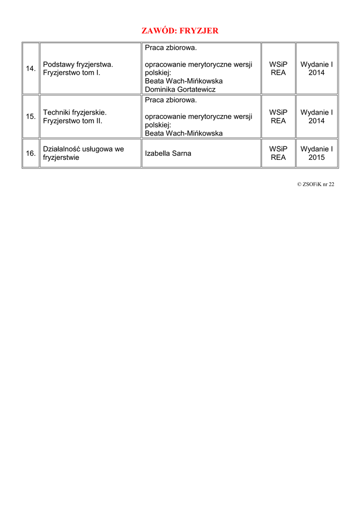 ZAWÓD: FRYZJER Praca zbiorowa. 14. Podstawy fryzjerstwa. Fryzjerstwo tom I. 15. Techniki fryzjerskie. Fryzjerstwo tom II. 16. Działalność usługowa we fryzjerstwie opracowanie merytoryczne wersji polskiej: Beata Wach-Mińkowska Dominika Gortatewicz Praca zbiorowa. opracowanie merytoryczne wersji polskiej: Beata Wach-Mińkowska Izabella Sarna WSiP REA Wydanie I 2014 WSiP REA Wydanie I 2014 WSiP REA Wydanie I 2015 © ZSOFiK nr 22