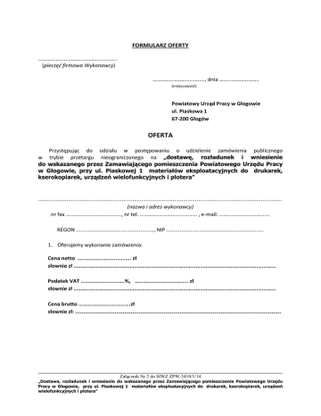 FORMULARZ OFERTY …………………………………………………. (pieczęć firmowa Wykonawcy) ……………………………….., dnia ……………………….. (miejscowość) Powiatowy Urząd Pracy w Głogowie ul. Piaskowa 1 67-200 Głogów OFERTA Przystępując do udziału w postępowaniu o udzielenie zamówienia publicznego w trybie przetargu nieograniczonego na „dostawę, rozładunek i wniesienie do wskazanego przez Zamawiającego pomieszczenia Powiatowego Urzędu Pracy w Głogowie, przy ul. Piaskowej 1 materiałów eksploatacyjnych do drukarek, kserokopiarek, urządzeń wielofunkcyjnych i plotera” ................................................................................................................................................................... (nazwa i adres wykonawcy) nr fax ....................................., nr tel. …………………………………… , e-mail: ………………………………. REGON ...................................................., NIP ................................................................. 1. Oferujemy wykonanie zamówienia: Cena netto ……………………………….. zł słownie zł ……………………………………………………………………………………………………………………………… Podatek VAT ………………………….%, ……………………………….. zł słownie zł ……………………………………………………………………………………………………………………………… Cena brutto ……………………………….zł słownie zł: .................................................................................................................................. ___________________________________________________________________________________________ Załącznik Nr 2 do SIWZ ZPW-3410/1/14 „Dostawa, rozładunek i wniesienie do wskazanego przez Zamawiającego pomieszczenia Powiatowego Urzędu Pracy w Głogowie, przy ul. Piaskowej 1 materiałów eksploatacyjnych do drukarek, kserokopiarek, urządzeń wielofunkcyjnych i plotera” Oferta cenowa Lp Wyszczególnienie Ilość A B Toner o symbolu MF 6500 do drukarki laserowej CANON laser base MF 6540PL, produkt z oryginalnym hologramem producenta Toner o symbolu C7115X do drukarki laserowej HP 1200, produkt z oryginalnym hologramem producenta Toner o symbolu Q2612A do drukarki laserowej HP 1015, produkt z oryginalnym hologramem producenta Toner o symbolu C3903A do drukarki laserowej HP 6 MP, produkt z oryginalnym hologramem producenta Toner o symbolu Q5949X do drukarki laserowej HP 1320, produkt z oryginalnym hologramem producenta Toner o symbolu C4096A do drukarki laserowej HP 2200, produkt z oryginalnym hologramem producenta Toner o symbolu Q6511X do drukarki laserowej HP 2430, produkt z oryginalnym hologramem producenta C 1 2 3 4 5 6 7 Nazwa/symbol/ nazwa producenta D Cena jednostkowa netto (zł) E Wartość netto (zł) (C x E) F Podatek VAT (%) G Wartość brutto (zł) (F + G) H 14 6 6 3 20 4 6 ___________________________________________________________________________________________ Załącznik Nr 2 do SIWZ ZPW-3410/1/14 „Dostawa, rozładunek i wniesienie do wskazanego przez Zamawiającego pomieszczenia Powiatowego Urzędu Pracy w Głogowie, przy ul. Piaskowej 1 materiałów eksploatacyjnych do drukarek, kserokopiarek, urządzeń wielofunkcyjnych i plotera” . 8 9 10 11 12 13 14 15 Toner o symbolu TK715 z hologramem oryginalności do KYOCERA KM 3055, 10 produkt z oryginalnym hologramem producenta Kardidże o symbolu C4844AE do drukarki atramentowej HP 2800, produkt 2 z oryginalnym hologramem producenta Kardidże o symbolu C4836AE do drukarki atramentowej HP 2800, produkt 2 z oryginalnym hologramem producenta Kardidże o symbolu C4837AE do drukarki atramentowej HP 2800, produkt 2 z oryginalnym hologramem producenta Kardidże o symbolu C4838AE do drukarki atramentowej HP 2800, produkt 2 z oryginalnym hologramem producenta Pojemnik z tuszem do CANON IPF 8300, poj. 700 ml., produkt 1 z oryginalnym hologramem producenta, kpl.=12 szt Toner o symbolu PRKN 402 do CPG 402 N do drukarki laserowej PAGEMASTER, 6 produkt z oryginalnym hologramem producenta Toner PK 942 do drukarki laserowej DELL 2330DN, 30 produkt z oryginalnym ___________________________________________________________________________________________ Załącznik Nr 2 do SIWZ ZPW-3410/1/14 „Dostawa, rozładunek i wniesienie do wskazanego przez Zamawiającego pomieszczenia Powiatowego Urzędu Pracy w Głogowie, przy ul. Piaskowej 1 materiałów eksploatacyjnych do drukarek, kserokopiarek, urządzeń wielofunkcyjnych i plotera” . 16 17 18 19 20 21 22 23 hologramem producenta Toner o symbolu 106R01415 do drukarki XEROX Phaser 3435, produkt z oryginalnym hologramem producenta POJEMNIK NA ZURZYTY TUSZ DO CANON IPF 8300, o symbolu PF-05 Toner o symbolu TK865 K do Kyocera TASKalfa 250 CI czarny, produkt z oryginalnym hologramem producenta Toner o symbolu TK865 K do Kyocera TASKalfa 250 CI yellow, produkt z oryginalnym hologramem producenta Toner o symbolu TK865 K do Kyocera TASKalfa 250 CI cyan, produkt z oryginalnym hologramem producenta Toner o symbolu TK865 K do Kyocera TASKalfa 250 CI magenta, produkt z oryginalnym hologramem producenta Toner o symbolu TK130 do urządzenia wielofunkcyjnego Kyocera FS-1028 MFP, produkt z oryginalnym hologramem producenta Toner o symbolu TK590 K do Kyocera FS-C2026 MFP czarny, produkt z oryginalnym hologramem producenta 20 1 5 3 3 3 50 5 ___________________________________________________________________________________________ Załącznik Nr 2 do SIWZ ZPW-3410/1/14 „Dostawa, rozładunek i wniesienie do wskazanego przez Zamawiającego pomieszczenia Powiatowego Urzędu Pracy w Głogowie, przy ul. Piaskowej 1 materiałów eksploatacyjnych do drukarek, kserokopiarek, urządzeń wielofunkcyjnych i plotera” . 24 25 26 27 28 29 30 Toner o symbolu T