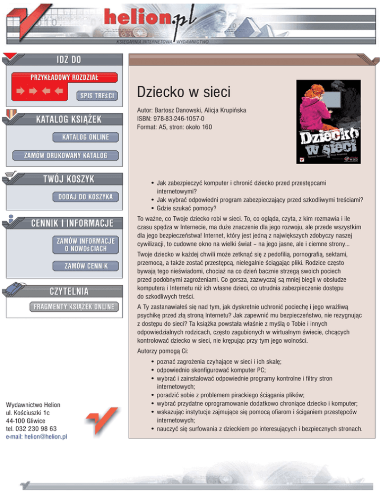 Dziecko w sieci Autor: Bartosz Danowski, Alicja Krupiñska ISBN: 978-83-246-1057-0 Format: A5, stron: oko³o 160 • Jak zabezpieczyæ komputer i chroniæ dziecko przed przestêpcami internetowymi? • Jak wybraæ odpowiedni program zabezpieczaj¹cy przed szkodliwymi treœciami? • Gdzie szukaæ pomocy? To wa¿ne, co Twoje dziecko robi w sieci. To, co ogl¹da, czyta, z kim rozmawia i ile czasu spêdza w Internecie, ma du¿e znaczenie dla jego rozwoju, ale przede wszystkim dla jego bezpieczeñstwa! Internet, który jest jedn¹ z najwiêkszych zdobyczy naszej cywilizacji, to cudowne okno na wielki œwiat – na jego jasne, ale i ciemne strony… Twoje dziecko w ka¿dej chwili mo¿e zetkn¹æ siê z pedofili¹, pornografi¹, sektami, przemoc¹, a tak¿e zostaæ przestêpc¹, nielegalnie œci¹gaj¹c pliki. Rodzice czêsto bywaj¹ tego nieœwiadomi, chocia¿ na co dzieñ bacznie strzeg¹ swoich pociech przed podobnymi zagro¿eniami. Co gorsza, zazwyczaj s¹ mniej biegli w obs³udze komputera i Internetu ni¿ ich w³asne dzieci, co utrudnia zabezpieczenie dostêpu do szkodliwych treœci. A Ty zastanawia³eœ siê nad tym, jak dyskretnie uchroniæ pociechê i jego wra¿liw¹ psychikê przed z³¹ stron¹ Internetu? Jak zapewniæ mu bezpieczeñstwo, nie rezygnuj¹c z dostêpu do sieci? Ta ksi¹¿ka powsta³a w³aœnie z myœl¹ o Tobie i innych odpowiedzialnych rodzicach, czêsto zagubionych w wirtualnym œwiecie, chc¹cych kontrolowaæ dziecko w sieci, nie krêpuj¹c przy tym jego wolnoœci. Autorzy pomog¹ Ci: Wydawnictwo Helion ul. Koœciuszki 1c 44-100 Gliwice tel. 032 230 98 63 e-mail: [email protected] • poznaæ zagro¿enia czyhaj¹ce w sieci i ich skalê; • odpowiednio skonfigurowaæ komputer PC; • wybraæ i zainstalowaæ odpowiednie programy kontrolne i filtry stron internetowych; • poradziæ sobie z problemem pirackiego œci¹gania plików; • wybraæ przydatne oprogramowanie dodatkowo chroni¹ce dziecko i komputer; • wskazuj¹c instytucje zajmuj¹ce siê pomoc¹ ofiarom i œciganiem przestêpców internetowych; • nauczyæ siê surfowania z dzieckiem po interesuj¹cych i bezpiecznych stronach. Spis treści Wstęp Rozdział 1. Niebezpieczeństwa i zagrożenia Pornografia jako jedno z większych niebezpieczeństw Pedofilia jako poważny problem współczesności Agresja i przemoc w świecie realnym i wirtualnym Zagrożenie związane z sektami w sieci Kradzież danych i oszustwa Internet a niebezpieczeństwa w realnym świecie Szkody spowodowane przez dziecko Krótkie podsumowanie Rozdział 2. Podstawy ochrony dziecka przed zagrożeniami Komputer i internet — pozytywny i negatywny wpływ na dziecko Uzależnienie od komputera i sieci Porady i wskazówki dla rodziców dzieci korzystających z komputera Wskazówki dla rodziców dotyczące bezpiecznego korzystania ich dzieci z internetu Jak rozmawiać z dzieckiem, aby rozmowa miała sens, podnosiła poczucie własnej wartości dziecka i budowała dobre relacje rodziców z dzieckiem Krótkie podsumowanie Rozdział 3. Przygotowanie komputera Konto użytkownika Ochrona przed szkodliwym oprogramowaniem Firewall Krótkie podsumowanie 5 9 10 12 14 17 18 18 19 20 23 27 30 34 36 42 43 45 46 50 71 78 4 Dziecko w sieci Rozdział 4. MS Windows XP — kontrola i bezpieczeństwo dziecka 79 Kontrola stron WWW Kontrola innych aplikacji używanych przez dziecko Krótkie podsumowanie 80 109 124 Rozdział 5. MS Windows Vista — nowe funkcje kontroli rodzicielskiej Konto użytkownika Konfiguracja kontroli rodzicielskiej Jak to wygląda od strony dziecka Analiza zachowań Krótkie podsumowanie Rozdział 6. Inne przydatne informacje 125 126 129 138 141 142 145 Gdzie szukać pomocy i zgłaszać zagrożenia Usługi oferowane przez dostawców internetu Wykaz przydatnego oprogramowania Wykaz stron dla dzieci Wykaz stron dla rodziców Wzory umów Netykieta Krótkie podsumowanie 146 148 150 151 152 152 153 153 Podsumowanie 155 Bibliografia 159 R O Z D Z I A Ł 2 Podstawy ochrony dziecka przed zagrożeniami Nasze dzieci są zafascynowane grami komputerowymi, internetem, telewizją, DVD, telefonami komórkowymi. Nie mamy na to wpływu — nie zatrzymamy postępu cywilizacji, bo i po co? Ale możemy, a nawet powinniśmy, nauczyć się skutecznie chronić dzieci przed zagrożeniami płynącymi z internetu i nie musimy być przy tym informatykami czy programistami. Wystarczy, że będziemy kochającymi i uważnymi na to, co robi nasze dziecko, rodzicami. Bo to nieprawda, że urządzenia elektroniczne sprawiają, że trudniej jest być rodzicem. 24 Dziecko w sieci Według Schuli Blank, amerykańskiego psychiatry dziecięcego, nie ma żadnego związku pomiędzy naszą umiejętnością zachowania autorytetu a pojawieniem się urządzeń elektronicznych. Na poparcie swojej tezy cytuje ona słowa Sokratesa, słynnego greckiego filozofa i myśliciela, który żył w czasach, kiedy nie było telewizji, gier komputerowych czy komputera, i który mówił wtedy: „Dzisiejsza młodzież lubi luksus, ma złe maniery, nie uznaje żadnych autorytetów i nie ma szacunku dla starszych (…) W naszych czasach dzieci stały się tyranami, nie pomagają w domu, (…) nie są posłuszne swoim rodzicom i tyranizują nauczycieli”. Czytając te słowa, zgodzimy się prawie wszyscy, że są one aktualne i dzisiaj. Ale my jako coraz bardziej świadomi rodzice pragnący dobra swoich dzieci możemy to zmienić, np. jeśli nie będziemy pozwalać dzieciom sobą kierować ani uznawać zanadto ich praw (być może to pokłosie tzw. bezstresowego modelu wychowania). Faktem bezspornym jest, że dzieci czasem lepiej niż my potrafią obsługiwać komputer, szybciej chłoną nowoczesną wiedzę technologiczną i opanowują umiejętność posługiwania się urządzeniami elektronicznymi — ich małe zwinne palce z zawrotną szybkością „biegają” po klawiaturze komputera czy telefonu komórkowego. Ale w obliczu np. istotnych niebezpieczeństw związanych z używaniem wyżej wymienio