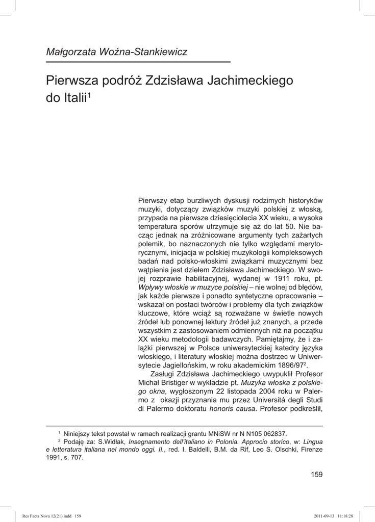 Małgorzata Woźna-Stankiewicz Pierwsza podróż Zdzisława Jachimeckiego do Italii1 Pierwszy etap burzliwych dyskusji rodzimych historyków muzyki, dotyczący związków muzyki polskiej z włoską, przypada na pierwsze dziesięciolecia XX wieku, a wysoka temperatura sporów utrzymuje się aż do lat 50. Nie bacząc jednak na zróżnicowane argumenty tych zażartych polemik, bo naznaczonych nie tylko względami merytorycznymi, inicjacja w polskiej muzykologii kompleksowych badań nad polsko-włoskimi związkami muzycznymi bez wątpienia jest dziełem Zdzisława Jachimeckiego. W swojej rozprawie habilitacyjnej, wydanej w 1911 roku, pt. Wpływy włoskie w muzyce polskiej – nie wolnej od błędów, jak każde pierwsze i ponadto syntetyczne opracowanie – wskazał on postaci twórców i problemy dla tych związków kluczowe, które wciąż są rozważane w świetle nowych źródeł lub ponownej lektury źródeł już znanych, a przede wszystkim z zastosowaniem odmiennych niż na początku XX wieku metodologii badawczych. Pamiętajmy, że i zalążki pierwszej w Polsce uniwersyteckiej katedry języka włoskiego, i literatury włoskiej można dostrzec w Uniwersytecie Jagiellońskim, w roku akademickim 1896/972. Zasługi Zdzisława Jachimeckiego uwypuklił Profesor Michał Bristiger w wykładzie pt. Muzyka włoska z polskiego okna, wygłoszonym 22 listopada 2004 roku w Palermo z okazji przyznania mu przez Universitá degli Studi di Palermo doktoratu honoris causa. Profesor podkreślił, 1 Niniejszy tekst powstał w ramach realizacji grantu MNiSW nr N N105 062837. Podaję za: S.Widłak, Insegnamento dell’italiano in Polonia. Approcio storico, w: Lingua e letteratura italiana nel mondo oggi. II., red. I. Baldelli, B.M. da Rif, Leo S. Olschki, Firenze 1991, s. 707. 2 159 Res Facta Nova 12(21).indd 159 2011-09-13 11:18:28 że „muzyka włoska, obecna już w Polsce od pięciuset lat, stała się istotną częścią głównych wartości naszej kultury”, a „wpływy włoskie” – o których pisał lwowianin, uczeń „sławnego” Guidona Adlera, któremu w 1911 roku powierzono pierwszą w Polsce uniwersytecką katedrę muzykologii w Uniwersytecie Jagiellońskim – „są po dziś dzień stałym tematem muzykologii polskiej”3. Na Sycylię, choć nie z powodu zainteresowania muzyką starych mistrzów, ale w celu propagowania geniuszu Fryderyka Chopina, dotarł Zdzisław Jachimecki w 1949 roku. Od grudnia 1924 do marca 1925 roku, po raz pierwszy we włoskich kręgach uniwersyteckich (Rzym, Padwa, Florencja, Bolonia) i w innych gremiach naukowych (Wenecja), krakowski muzykolog przedstawił wykład pt. L’italianitá e gl’italiani nella musica polacca 1424-1924. Jego recepcja była wręcz entuzjastyczna, bo Jachimecki omówił fakty w większości nieznane Włochom4. Po wykładzie na Uniwersytecie w Padwie (13 III 1925) sprawozdawca ukazującej się w Wenecji gazety pisał: Con limpidità e chiarezza, leggendo con ottima pronuncia e una leggera sfumatura d’accento esotico, il professor Jachimecki è risalito, nell’esporre le sue ricerche storiche, a oltre cinque secoli, attestando che fin d’allora l’anima della popolazione polacca sospirava all’arte italiana. (...) Una strada dritta unisce l’Italia alla Polonia, ed è la via del cuore, del sentimento. A sua finire di prof. Jachimecki che fu seguito attentamente durante tutto il suo dire, fu vivamente applaudito5. W okresie między tymi, w pewnym sensie symbolicznymi, datami Jachimecki wielokrotnie przebywał we Włoszech w celach naukowych bądź turystycznych. Częstokroć na bieżąco zdawał relację z podróży na łamach gazet i czasopism. Ale celem pierwszej w jego życiu wyprawy do Italii – jak zdecydowanie wolał nazywać ten drogi jego sercu kraj – nie było poszukiwanie muzycznych źródeł, czy zdobywanie muzykologicznej literatury. Warto zauważyć, że świadectwo o tej szczególnej peregrynacji ma charakter intymny, bo Zdzisław opowiadał o niej w listach do ukochanej kobiety. Jest jednak coś wspólnego w tych relacjach różniących się nieco językiem opisu i natężeniem tonu emocjonalnego, relacjach przeznaczonych przecież dla znacząco odmiennych adresatów. To fascynacja pięknem natury, obyczajami, dziełami sztuki oraz efektami codziennych prozaicznych prac mieszkańców mniej powszechnie znanych zakątków Italii. To także niczym nie dająca się poskromić nieustanna zachłanność poznawcza, a także potrzeba nowych i wciąż na nowo odświeżanych doświadczeń estetycznych związanych z malarstwem, architekturą, poezją, teatrem i muzyką. 3 M. Bristiger, Muzyka włoska z polskiego okna, w: M. Bristiger, Transkrypcje. Pisma i przekłady, słowo/obraz terytoria, Gdańsk 2010, s. 500. 4 Zob. zapowiedzi i sprawozdania z wykładów, m.in. Cinquecento anni di relazioni culturali fra l’Italia e la Polonia, „Il Popolo d’Italia” 1924, 18 XII, s. 3; Gli italiani nella musica polacca, „Il Mondo” 1924, 19 XII, s. 2; L’Italia nella musica polacca, „La Tribuna” 1924, 14 XII, s. 5; La Conferenza Jachimecki su gl’italiani e la musica polacca, „Il Giornale d’Italia” 1924, 17 XII, s. 3; La Conferenza del prof. Jachimecki all’Università [Bologna], „Il Resto del Carlino” 1925, 28 II, s. 5; 4 III, s. 5. Por. sprawozdanie z „Kuriera Poznańskiego”, Wykłady profesora Z. Jachimeckiego na Uniwersytetach Włoskich, przedruk w: „Przegląd Muzyczny” 1925, nr 7, s. 13-14; R. Pollak, Polonica włoskie, „Przegląd Współczesny” 1925, t. 13, s. 476; Kronika Uniwersytetu Jagiellońskiego za lata szkolne 1924/25 i 1925/26, Uniwersytet Jagielloński, Kraków 1927, s. 9, 54. Należy podkreślić, że za swoją aktywność w zakresie propagowania kultury włoskiej Z. Jachimecki w roku 1926 otrzymał włoskie odznaczenie państwowe – Komandorię Orderu Korony Włoskiej. 5 Musica italiana in Polonia, „Il Gazzettino” 1925, nr 63, 14 III, s. 4. 160 Res Facta Nova 12(21).indd 16