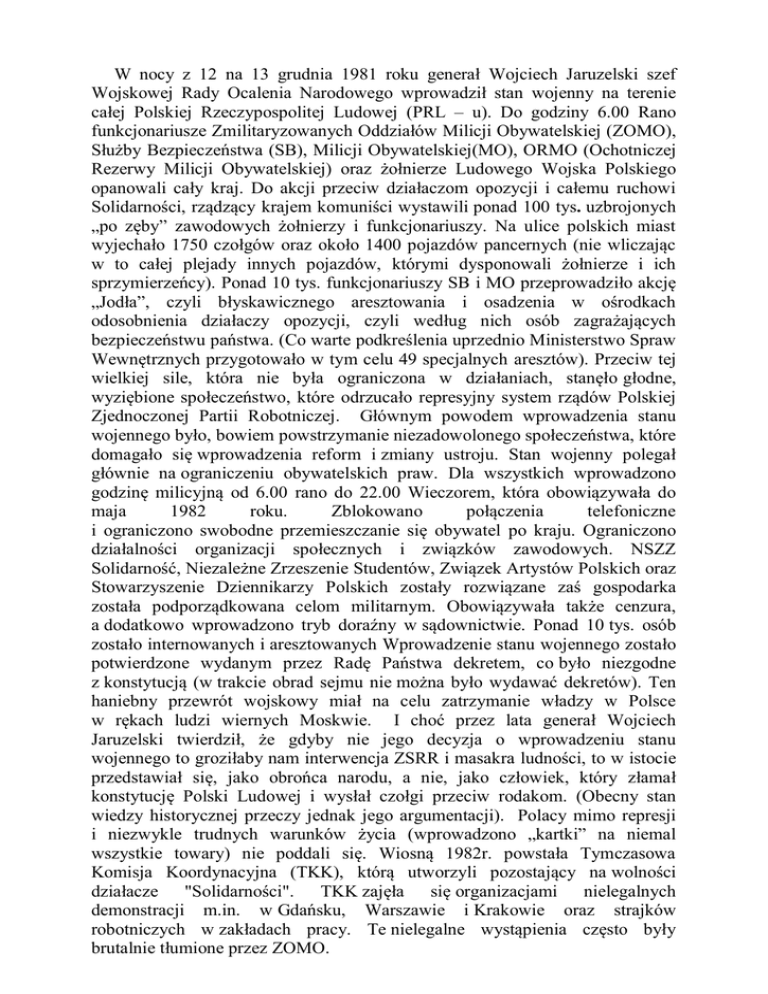 W nocy z 12 na 13 grudnia 1981 roku generał Wojciech Jaruzelski szef Wojskowej Rady Ocalenia Narodowego wprowadził stan wojenny na terenie całej Polskiej Rzeczypospolitej Ludowej (PRL – u). Do godziny 6.00 Rano funkcjonariusze Zmilitaryzowanych Oddziałów Milicji Obywatelskiej (ZOMO), Służby Bezpieczeństwa (SB), Milicji Obywatelskiej(MO), ORMO (Ochotniczej Rezerwy Milicji Obywatelskiej) oraz żołnierze Ludowego Wojska Polskiego opanowali cały kraj. Do akcji przeciw działaczom opozycji i całemu ruchowi Solidarności, rządzący krajem komuniści wystawili ponad 100 tys. uzbrojonych „po zęby” zawodowych żołnierzy i funkcjonariuszy. Na ulice polskich miast wyjechało 1750 czołgów oraz około 1400 pojazdów pancernych (nie wliczając w to całej plejady innych pojazdów, którymi dysponowali żołnierze i ich sprzymierzeńcy). Ponad 10 tys. funkcjonariuszy SB i MO przeprowadziło akcję „Jodła”, czyli błyskawicznego aresztowania i osadzenia w ośrodkach odosobnienia działaczy opozycji, czyli według nich osób zagrażających bezpieczeństwu państwa. (Co warte podkreślenia uprzednio Ministerstwo Spraw Wewnętrznych przygotowało w tym celu 49 specjalnych aresztów). Przeciw tej wielkiej sile, która nie była ograniczona w działaniach, stanęło głodne, wyziębione społeczeństwo, które odrzucało represyjny system rządów Polskiej Zjednoczonej Partii Robotniczej. Głównym powodem wprowadzenia stanu wojennego było, bowiem powstrzymanie niezadowolonego społeczeństwa, które domagało się wprowadzenia reform i zmiany ustroju. Stan wojenny polegał głównie na ograniczeniu obywatelskich praw. Dla wszystkich wprowadzono godzinę milicyjną od 6.00 rano do 22.00 Wieczorem, która obowiązywała do maja 1982 roku. Zblokowano połączenia telefoniczne i ograniczono swobodne przemieszczanie się obywatel po kraju. Ograniczono działalności organizacji społecznych i związków zawodowych. NSZZ Solidarność, Niezależne Zrzeszenie Studentów, Związek Artystów Polskich oraz Stowarzyszenie Dziennikarzy Polskich zostały rozwiązane zaś gospodarka została podporządkowana celom militarnym. Obowiązywała także cenzura, a dodatkowo wprowadzono tryb doraźny w sądownictwie. Ponad 10 tys. osób zostało internowanych i aresztowanych Wprowadzenie stanu wojennego zostało potwierdzone wydanym przez Radę Państwa dekretem, co było niezgodne z konstytucją (w trakcie obrad sejmu nie można było wydawać dekretów). Ten haniebny przewrót wojskowy miał na celu zatrzymanie władzy w Polsce w rękach ludzi wiernych Moskwie. I choć przez lata generał Wojciech Jaruzelski twierdził, że gdyby nie jego decyzja o wprowadzeniu stanu wojennego to groziłaby nam interwencja ZSRR i masakra ludności, to w istocie przedstawiał się, jako obrońca narodu, a nie, jako człowiek, który złamał konstytucję Polski Ludowej i wysłał czołgi przeciw rodakom. (Obecny stan wiedzy historycznej przeczy jednak jego argumentacji). Polacy mimo represji i niezwykle trudnych warunków życia (wprowadzono „kartki” na niemal wszystkie towary) nie poddali się. Wiosną 1982r. powstała Tymczasowa Komisja Koordynacyjna (TKK), którą utworzyli pozostający na wolności działacze "Solidarności". TKK zajęła się organizacjami nielegalnych demonstracji m.in. w Gdańsku, Warszawie i Krakowie oraz strajków robotniczych w zakładach pracy. Te nielegalne wystąpienia często były brutalnie tłumione przez ZOMO. W pamięci najbardziej zapadła krwawa pacyfikacja kopalni "Wujek" w Katowicach w grudniu 1981r., gdzie śmierć poniosło dziewięciu górników, a kilkadziesiąt osób zostało rannych. Osoby biorące udział w demonstracjach, opozycjoniści i działacze "Solidarności" byli szykanowani, zniesławiani i często zmuszani do podpisywania lojalek, czyli deklaracji lojalności w stosunku do władzy. Służby Bezpieczeństwa weryfikowały sędziów, nauczycieli, osoby związane z mediami. Działania sił MSW i wojska przebiegały wyjątkowo brutalnie. Wielu funkcjonariuszy wykazywało się okrucieństwem, o czym świadczą wspomnienia ofiar zatrzymań i pobić. Stan wojenny trwał od 13 grudnia 1981 roku do 22 lipca 1983 roku. Do 1989 roku w wyniku represji, ciężkich pobić, ran postrzałowych zmarło ponad 100 osób. Społeczeństwo było niezadowolone z działań prowadzonych przez władze. Bojkotowano instytucje, które podlegały władzy, a dla przeciwwagi zakładano podziemne wydawnictwa. Swoją działalność rozpoczęło też radio "Solidarność". Duchowieństwo zaangażowało się w niesienie pomocy poszkodowanym przez państwo. Opozycjoniści byli wspierani przez organizacje międzynarodowe oraz związki zawodowe z innych państw. Stany Zjednoczone wprowadziły sankcje ekonomiczne wobec PRL – u. W tym miejscu należy dodać, że sprawcy i mocodawcy tych zbrodni w wielu przypadkach do dziś nie zostali postawieni przed sądem i ukarani.. Trzeba również przypomnieć, że stan wojenny był także wielką klęską PZPR, z której w 1983 roku wystąpiło ponad 850 tysięcy jej członków. Wdzięczni za Solidarność również tą naszą radzymińską chcemy powiedzie, że my o walce „ Solidarności” o wolną i suwerenną ojczyznę dla kolejnych pokoleń Polaków będziemy pamiętać. Nie byłoby wolnej, suwerennej i niepodległej Rzeczypospolitej, bez waszego poświęcenia i ofiary. Najpiękniejszy i najtrwalszy pomnik, jaki chcemy Wam postawić, będzie wdzięcznością zapisaną w naszych sercach i prawdą historyczną, którą przekażemy następnym pokoleniom. Koło Historyczne „Wiarus” Szkoła Podstawowa nr 1 im. ppłk pil. Mariana Pisarka w Radzyminie