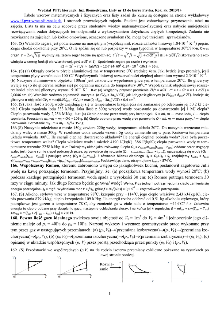 Wydział PPT; kierunek: Inż. Biomedyczna. Listy nr 13 do kursu Fizyka. Rok. ak. 2013/14 Tabele wzorów matematycznych i fizycznych oraz listy zadań do kursu są dostępne na stronie wykładowcy www.if.pwr.wroc.pl/~wsalejda i stronach prowadzących zajęcia. Student jest zobowiązany przynoszenia tabel na zajęcia. Lista ta ma na celu zdobycie przez studentów wiedzy matematyczno-fizycznej oraz nabycie umiejętności rozwiązywania zadań dotyczących termodynamiki z wykorzystaniem dotychczas zbytych kompetencji. Zadania nie rozwiązane na zajęciach lub krótko omówione, oznaczone symbolem (S), mogą być treściami sprawdzianów. 163. (S) Wahadło zegara jest podwieszone na mosiężnym (współczynnik rozszerzalności liniowej 1,84·10−5 K−1) pręcie. Zegar chodzi dokładnie przy 20oC. O ile spóźni się on lub pośpieszy w ciągu tygodnia w temperaturze 30oC? R-e: Okres drgań τ = 2π l g wydłuży się, zatem zegar będzie się spóźniać; τ * τ = l * l = (1 + α∆T ) 1 ≅ 1 + α∆T 2 (skorzystano z roz- winięcia w szereg funkcji pierwiastkowej, gdyż α∆T ≪ 1). Spóźnienie zegara po czasie t wyniesie: * 2 −5 ∆t ≃ t(τ − τ )/τ ≃ tα∆T/2 = 12·7·24· 60 ·1,84 · 10 ·10/2 ≃ 56 s. 164. (S) (a) Okrągły otwór w płycie aluminiowej ma w temperaturze 0oC średnicę 4cm. Jaki będzie jego promień, jeśli temperatura płyty wzrośnie do 100oC? Współczynnik liniowej rozszerzalności cieplnej aluminium wynosi 2,3·10−5 K−1. (b) Naczynie aluminiowe o objętości 100cm3 jest całkowicie wypełnione gliceryną o temperaturze 20oC. Ile gliceryny wyleje się (o ile gliceryna rozleje się) po ogrzaniu naczynia do temperatury 30oC? Współczynnik objętościowej rozszerzalności cieplnej gliceryny wynosi 5·10−4 K−1. R-e: (a) Względny przyrost promienia ∆r/r = α∆T i r* = r + ∆r = r(1 + α∆T) ≈ 2,0046 cm. (b) Wzrośnie zarówno pojemność naczynia (o ∆VAl = 3αAlV ∆T), jak i objętość gliceryny (o ∆Vglic = βglicV ∆T). Rozleje się 3 gliceryna o objętości ∆V3 = max(0,∆Vglic − ∆VAl) = max(0, (βglic − 3αAl)V∆T) ≈ 0,4 cm . 165. (S) Jaka ilość z 260g wody znajdującej się w temperaturze krzepnięcia nie zamarznie po odebraniu jej 50,2 kJ ciepła? Ciepło topnienia lodu 333 kJ/kg. Jaka ilość z 800g wrzącej wody pozostanie po dostarczeniu jej 1 MJ ciepła? Ciepło parowania wody 2,256 MJ/kg. R-e: (a) Ciepło oddane przez wodę przy krzepnięciu Q = ml, m — masa lodu, l — ciepło topnienia. Pozostanie m0 −m = m0 − Q/l ≈ 109 g. (b) Ciepło pobrane przez wodę przy parowaniu Q = ml, m — masa pary, l — ciepło parowania. Pozostanie m0 −m = m0 − Q/l ≈ 357 g. 166.(S) Naczynie miedziane o masie 150g zawiera 220g wody; temperatura układu 20oC. Do naczynia wrzucono miedziany walec o masie 300g. W rezultacie woda zaczęła wrzeć i 5g wody zamieniło się w parę. Końcowa temperatura układu wyniosła 100oC. Ile energii cieplnej dostarczono układowi? Ile energii cieplnej pobrała woda? Jaka była początkowa temperatura walca? Ciepła właściwe wody i miedzi: 4190 J/(kgK), 386 J/(kgK); ciepło parowania wody w temperaturze wrzenia: 2258 kJ/kg. R-e: Traktujemy układ jako izolowany. Ciepło Q1 = cmiedzimwalca(twalca − tkońc) oddane przez stygnący walec jest równe sumie ciepeł pobranych przez: ogrzewające się naczynie (Q2 = cmiedzimnacz(tkońc − tpocz)), ogrzewającą się wodę (Q3 = cwodymwody(tkońc −tpocz)) i parującą wodę (Q4 = lparmpary). Z równania bilansu cieplnego Q1 = Q2+Q3 +Q4 znajdujemy twalca = tkońc o +[(cmiedzimnacz +cwodymwody)(tkońc −tpocz)+lparmpary]/cmiedzimwalca. Podstawiając dane, otrzymujemy twalca = 874 C. 166. Współczesny Romeo, któremu zabroniono wstępu do jakiejkolwiek kuchni, postanowił zagotować Julii wodę na kawę potrząsając termosem. Przyjmijmy, że: (a) początkowa temperatura wody wynosi 20oC; (b) podczas każdego potrząśnięcia termosem woda spada z wysokości 30 cm; (c) Romeo potrząsa termosem 30 razy w ciągu minuty. Jak długo Romeo będzie gotował wodę? Ws-ka: Przy jednym potrząśnięciu na ciepło zamienia się −1 energia potencjalna Q1 = mgh. Wydzielana moc P = fQ1, gdzie f = 30/(60 s) = 0,5 s — częstotliwość potrząsania. 167. (S) Alkohol etylowy wrze w temperaturze 78oC, krzepnie przy −114oC, jego ciepło właściwe 2,43 kJ/(kg·K), ciepło parowania 879 kJ/kg, ciepło krzepnięcia 109 kJ/kg. Ile energii trzeba odebrać od 0,51 kg alkoholu etylowego, który początkowo jest gazem o temperaturze 78oC, aby zamienić go w ciało stałe o temperaturze −114oC? R-e: Całkowita energia to ciepło oddane przy skraplaniu gazu, następnie ochładzaniu cieczy, i na końcu jej krzepnięciu: E = mlpar + cm(Tpar − Tkrz) +mlkrz = m[lpar + c(Tpar − Tkrz) + lkrz] ≈ 756 kJ. 168. Pewna ilość gazu idealnego zwiększa swoją objętość od V0 = 1m3 do Vk = 4m3 i jednocześnie jego ciśnienie maleje od p0 = 40Pa do pk = 10Pa. Narysuj wykresy i wyznacz geometrycznie prace wykonane przy tym przez gaz w następujących przemianach: (a) (p0,V0)→(przemiana izobaryczna)→(p0,Vk)→(przemiana izochoryczna)→(pk,Vk); (b) (p0,V0)→(przemiana izochoryczna)→(pk,V0)→(przemiana izobaryczna)→ (pk,Vk); (c) opisanej w układzie współrzędnych (p, V) przez prostą przechodząca przez punkty (p0,V0) i (pk,Vk). 169. (S) Przedstawić we współrzędnych (p,V) na tle rodzin izoterm przemiany cykliczne pokazane na rysunkach po lewej stronie poniżej. Rozwiązanie 1 170. Znajdujący się w komorze gaz idealny poddano zamkniętemu cyklowi przemian termodynamicznych: A→B→C→A, przy czym przejście A→B jest przemianą izochoryczną, B→C odpowiada przemianie adiabatycznej, a przemiana C→A jest izobaryczna. Ciepło dostarczone układowi w procesie A→B było równe 20J, a wypadkowa praca wykonana przez układ w jednym cyklu zamkniętym wyniosła 15 J. Ile ciepła dostarczono układowi (lub ile ciepła oddał układ) w przemiani