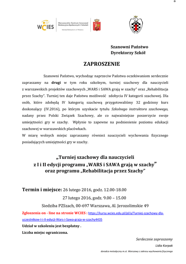 Szanowni Państwo Dyrektorzy Szkół ZAPROSZENIE Szanowni Państwo, wychodząc naprzeciw Państwa oczekiwaniom serdecznie zapraszamy na drugi w tym roku szkolnym, turniej szachowy dla nauczycieli z warszawskich projektów szachowych „WARS i SAWA grają w szachy” oraz „Rehabilitacja przez Szachy”. Turniej ten daje Państwu możliwość zdobycia IV kategorii szachowej. Dla osób, które zdobędą IV kategorią szachową przygotowaliśmy 32 godzinny kurs doskonalący (IV.2016), po którym uzyskacie tytułu Szkolnego instruktora szachowego, nadany przez Polski Związek Szachowy, ale co najważniejsze poszerzycie swoje umiejętności gry w szachy. Wpłynie to zapewne na podniesienie poziomu edukacji szachowej w warszawskich placówkach. W miarę wolnych miejsc zapraszamy również nauczycieli wychowania fizycznego posiadających umiejętności gry w szachy. „Turniej szachowy dla nauczycieli z I i II edycji programu „WARS i SAWA grają w szachy” oraz programu „Rehabilitacja przez Szachy” Termin i miejsce: 26 lutego 2016, godz. 12.00-18.00 27 lutego 2016, godz. 9.00 – 15.00 Siedziba PZSzach, 00-697 Warszawa, Al. Jerozolimskie 49 Zgłoszenia on - line na stronie WCIES : https://kursy.wcies.edu.pl/pl/a/Turniej-szachowy-dlauczestnikow-I-i-II-edycji-Wars-i-Sawa-graja-w-szachy4435 Udział w szkoleniu jest bezpłatny . Liczba miejsc ograniczona. Serdecznie zapraszamy Lidia Korpak doradca metodyczny m.st. Warszawy z zakresu wychowania fizycznego