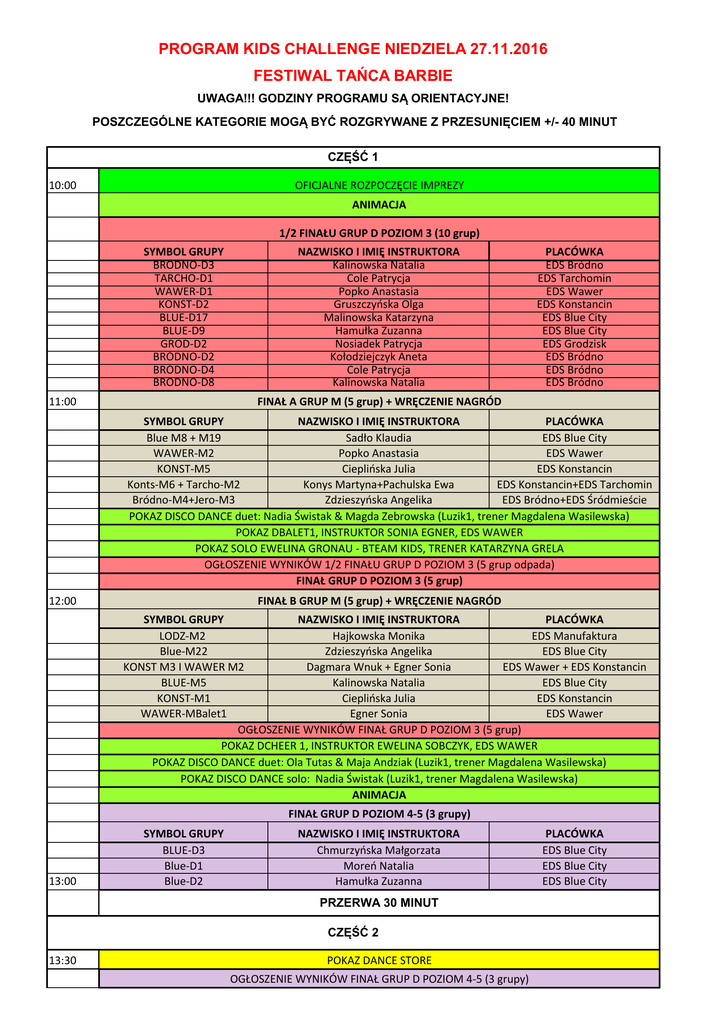 PROGRAM KIDS CHALLENGE NIEDZIELA 27.11.2016 FESTIWAL TAŃCA BARBIE UWAGA!!! GODZINY PROGRAMU SĄ ORIENTACYJNE! POSZCZEGÓLNE KATEGORIE MOGĄ BYĆ ROZGRYWANE Z PRZESUNIĘCIEM +/- 40 MINUT CZĘŚĆ 1 10:00 OFICJALNE ROZPOCZĘCIE IMPREZY ANIMACJA 1/2 FINAŁU GRUP D POZIOM 3 (10 grup) SYMBOL GRUPY BRÓDNO-D3 TARCHO-D1 WAWER-D1 KONST-D2 BLUE-D17 BLUE-D9 GROD-D2 BRÓDNO-D2 BRÓDNO-D4 BRÓDNO-D8 11:00 NAZWISKO I IMIĘ INSTRUKTORA Kalinowska Natalia Cole Patrycja Popko Anastasia Gruszczyńska Olga Malinowska Katarzyna Hamułka Zuzanna Nosiadek Patrycja Kołodziejczyk Aneta Cole Patrycja Kalinowska Natalia PLACÓWKA EDS Bródno EDS Tarchomin EDS Wawer EDS Konstancin EDS Blue City EDS Blue City EDS Grodzisk EDS Bródno EDS Bródno EDS Bródno FINAŁ A GRUP M (5 grup) + WRĘCZENIE NAGRÓD SYMBOL GRUPY NAZWISKO I IMIĘ INSTRUKTORA PLACÓWKA Blue M8 + M19 Sadło Klaudia EDS Blue City WAWER-M2 Popko Anastasia EDS Wawer KONST-M5 Cieplińska Julia EDS Konstancin Konts-M6 + Tarcho-M2 Konys Martyna+Pachulska Ewa EDS Konstancin+EDS Tarchomin Bródno-M4+Jero-M3 Zdzieszyńska Angelika EDS Bródno+EDS Śródmieście POKAZ DISCO DANCE duet: Nadia Świstak & Magda Zebrowska (Luzik1, trener Magdalena Wasilewska) POKAZ DBALET1, INSTRUKTOR SONIA EGNER, EDS WAWER POKAZ SOLO EWELINA GRONAU - BTEAM KIDS, TRENER KATARZYNA GRELA OGŁOSZENIE WYNIKÓW 1/2 FINAŁU GRUP D POZIOM 3 (5 grup odpada) FINAŁ GRUP D POZIOM 3 (5 grup) 12:00 FINAŁ B GRUP M (5 grup) + WRĘCZENIE NAGRÓD SYMBOL GRUPY NAZWISKO I IMIĘ INSTRUKTORA PLACÓWKA LODZ-M2 Hajkowska Monika EDS Manufaktura Blue-M22 Zdzieszyńska Angelika EDS Blue City KONST M3 I WAWER M2 Dagmara Wnuk + Egner Sonia EDS Wawer + EDS Konstancin BLUE-M5 Kalinowska Natalia EDS Blue City KONST-M1 Cieplińska Julia EDS Konstancin WAWER-MBalet1 Egner Sonia EDS Wawer OGŁOSZENIE WYNIKÓW FINAŁ GRUP D POZIOM 3 (5 grup) POKAZ DCHEER 1, INSTRUKTOR EWELINA SOBCZYK, EDS WAWER POKAZ DISCO DANCE duet: Ola Tutas & Maja Andziak (Luzik1, trener Magdalena Wasilewska) POKAZ DISCO DANCE solo: Nadia Świstak (Luzik1, trener Magdalena Wasilewska) ANIMACJA FINAŁ GRUP D POZIOM 4-5 (3 grupy) 13:00 SYMBOL GRUPY BLUE-D3 Blue-D1 Blue-D2 NAZWISKO I IMIĘ INSTRUKTORA Chmurzyńska Małgorzata Moreń Natalia Hamułka Zuzanna PRZERWA 30 MINUT CZĘŚĆ 2 13:30 POKAZ DANCE STORE OGŁOSZENIE WYNIKÓW FINAŁ GRUP D POZIOM 4-5 (3 grupy) PLACÓWKA EDS Blue City EDS Blue City EDS Blue City POKAZ DISCO DANCE solo: Ola Tutas (Luzik1, trener Magdalena Wasilewska) ANIMACJA 14:00 1/2 FINAŁU GRUP D POZIOM 2 (8 grup) SYMBOL GRUPY NAZWISKO I IMIĘ INSTRUKTORA PLACÓWKA WAWER-D3 Popko Anastasia EDS Wawer Bródno-D5 Zdzieszyńska Angelika EDS Bródno Tarcho-D2 Włodarska Renata EDS Tarchomin KONST-D6 Cieplińska Julia EDS Konstancin LODZ-D1 Nadajewska Marlena EDS Manufaktura KONST D3 Wnuk Dagmara EDS Konstancin LODZ-D4 Hajkowska Monika EDS Manufaktura WAWER-D2 Popko Anastasia EDS Wawer POKAZ FORMACJI KONST CREW KIDS, TRENER JULITA CHODKOWSKA, EDS KONSTANCIN KONCERT GOŚCIA SPECJALNEGO FINAŁ C GRUP M (5 grup) + WRĘCZENIE NAGRÓD SYMBOL GRUPY NAZWISKO I IMIĘ INSTRUKTORA PLACÓWKA Blue M4 Gruszczyńska Olga EDS Blue City WAWER-Mmix1 Popko Anastasia EDS Wawer BLUE-M3 Hamułka Zuzanna, Zielińska Paula EDS Blue City BRÓDNO-M7 Cole Patrycja EDS Bródno LODZ- M5 i M3 Nadajewska Marlena EDS Manufaktura OGŁOSZENIE WYNIKÓW 1/2 FINAŁU GRUP D POZIOM 2 (3 grupy odpadają) 15:30 FINAŁ GRUP D POZIOM 2 (5 grup) POKAZ SOLO HIP HOP: NICOLE TUCZYŃSKI, SWAGG KIDS, TRENER KLAUDIA KORUBA POKAZ SOLO HIP HOP: WIKTOR MOTYCZYŃSKI, SWAGG KIDS, TRENER KLAUDIA KORUBA FINAŁ GRUP D POZIOM 1 (8 grup) SYMBOL GRUPY NAZWISKO I IMIĘ INSTRUKTORA PLACÓWKA WAWER-D4 Popko Anastasia EDS Wawer BRÓDNO-D6 Cole Patrycja EDS Bródno Tarcho-D4 Włodarska Renata EDS Tarchomin BRÓDNO-D7 Kalinowska Natalia EDS Bródno JERO-D2 Dąbek Paulina EDS Śródmieście BRÓDNO-D1 Szafarz Magdalena EDS Bródno TARCHO-D5 Cole Patrycja EDS Tarchomin WAWER-DMIX1 Popko Anastasia EDS Wawer POKAZ SOLO HIP HOP: WIKTOR PĘKALSKI, SWAGG KIDS, TRENER KLAUDIA KORUBA POKAZ DUETU HIP HOP: NICOLE TUCZYŃSKI & WIKTOR MOTYCZYŃSKI, SWAGG KIDS, TRENER KLAUDIA KORUBA 16:30 OGŁOSZENIE WYNIKÓW FINAŁ GRUP D POZIOM 2 (5 grup) POKAZ DANCE STORE ANIMACJA OGŁOSZENIE WYNIKÓW FINAŁ GRUP D POZIOM 1 (8 grup) POKAZ DCHEER 1+2+DCHEER TURNIEJ, INSTRUKTOR MAŁGORZATA WEWIÓRA, EDS GRODZISK MAZ 17:30 FINAŁ D GRUP M (5 grup) + WRĘCZENIE NAGRÓD SYMBOL GRUPY BRÓDNO-M2 WAWER-M3 BRÓDNO-M1 + TARCHO-M1 LODZ-M1 BRÓDNO-M3 18:00 NAZWISKO I IMIĘ INSTRUKTORA Kalinowska Natalia Popko Anastasia Cole Patrycja Nadajewska Marlena Kalinowska Natalia ZAKOŃCZENIE IMPREZY PLACÓWKA EDS Bródno EDS Wawer EDS Bródno+EDS Tarchomin EDS Manufaktura EDS Bródno