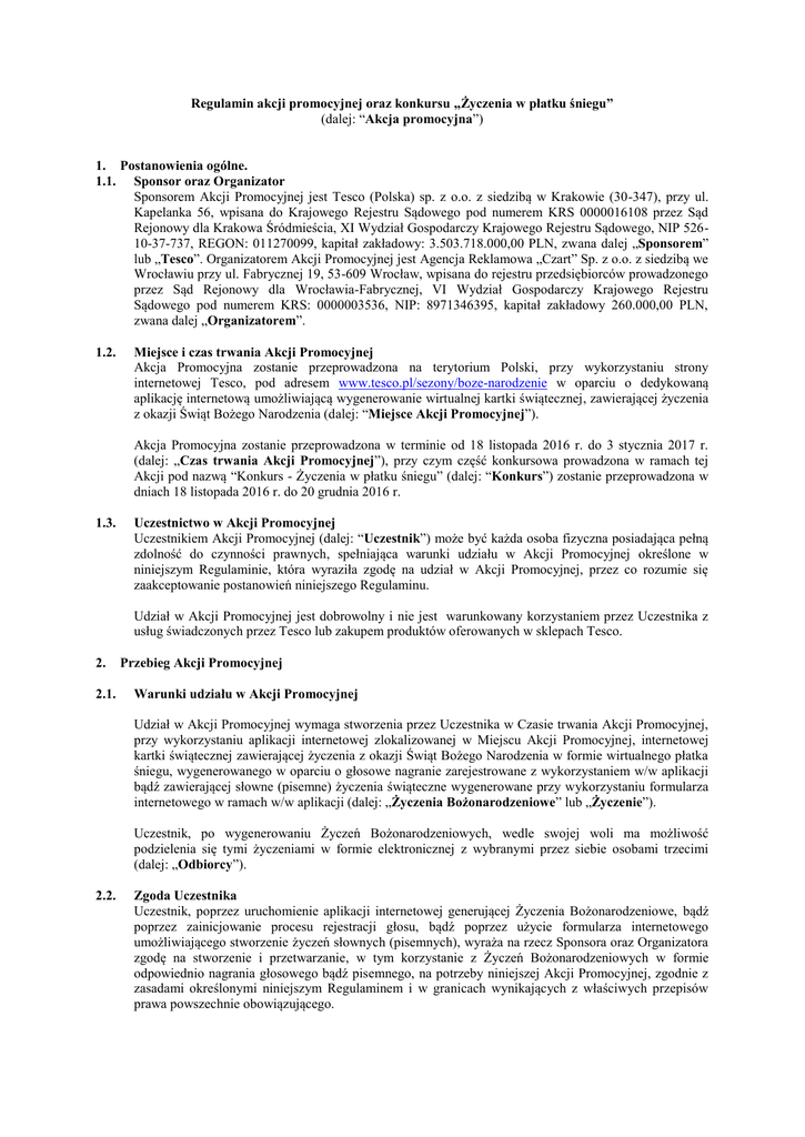Regulamin akcji promocyjnej oraz konkursu „Życzenia w płatku śniegu” (dalej: “Akcja promocyjna”) 1. Postanowienia ogólne. 1.1. Sponsor oraz Organizator Sponsorem Akcji Promocyjnej jest Tesco (Polska) sp. z o.o. z siedzibą w Krakowie (30-347), przy ul. Kapelanka 56, wpisana do Krajowego Rejestru Sądowego pod numerem KRS 0000016108 przez Sąd Rejonowy dla Krakowa Śródmieścia, XI Wydział Gospodarczy Krajowego Rejestru Sądowego, NIP 52610-37-737, REGON: 011270099, kapitał zakładowy: 3.503.718.000,00 PLN, zwana dalej „Sponsorem” lub „Tesco”. Organizatorem Akcji Promocyjnej jest Agencja Reklamowa „Czart” Sp. z o.o. z siedzibą we Wrocławiu przy ul. Fabrycznej 19, 53-609 Wrocław, wpisana do rejestru przedsiębiorców prowadzonego przez Sąd Rejonowy dla Wrocławia-Fabrycznej, VI Wydział Gospodarczy Krajowego Rejestru Sądowego pod numerem KRS: 0000003536, NIP: 8971346395, kapitał zakładowy 260.000,00 PLN, zwana dalej „Organizatorem”. 1.2. Miejsce i czas trwania Akcji Promocyjnej Akcja Promocyjna zostanie przeprowadzona na terytorium Polski, przy wykorzystaniu strony internetowej Tesco, pod adresem www.tesco.pl/sezony/boze-narodzenie w oparciu o dedykowaną aplikację internetową umożliwiającą wygenerowanie wirtualnej kartki świątecznej, zawierającej życzenia z okazji Świąt Bożego Narodzenia (dalej: “Miejsce Akcji Promocyjnej”). Akcja Promocyjna zostanie przeprowadzona w terminie od 18 listopada 2016 r. do 3 stycznia 2017 r. (dalej: „Czas trwania Akcji Promocyjnej”), przy czym część konkursowa prowadzona w ramach tej Akcji pod nazwą “Konkurs - Życzenia w płatku śniegu” (dalej: “Konkurs”) zostanie przeprowadzona w dniach 18 listopada 2016 r. do 20 grudnia 2016 r. 1.3. Uczestnictwo w Akcji Promocyjnej Uczestnikiem Akcji Promocyjnej (dalej: “Uczestnik”) może być każda osoba fizyczna posiadająca pełną zdolność do czynności prawnych, spełniająca warunki udziału w Akcji Promocyjnej określone w niniejszym Regulaminie, która wyraziła zgodę na udział w Akcji Promocyjnej, przez co rozumie się zaakceptowanie postanowień niniejszego Regulaminu. Udział w Akcji Promocyjnej jest dobrowolny i nie jest warunkowany korzystaniem przez Uczestnika z usług świadczonych przez Tesco lub zakupem produktów oferowanych w sklepach Tesco. 2. 2.1. Przebieg Akcji Promocyjnej Warunki udziału w Akcji Promocyjnej Udział w Akcji Promocyjnej wymaga stworzenia przez Uczestnika w Czasie trwania Akcji Promocyjnej, przy wykorzystaniu aplikacji internetowej zlokalizowanej w Miejscu Akcji Promocyjnej, internetowej kartki świątecznej zawierającej życzenia z okazji Świąt Bożego Narodzenia w formie wirtualnego płatka śniegu, wygenerowanego w oparciu o głosowe nagranie zarejestrowane z wykorzystaniem w/w aplikacji bądź zawierającej słowne (pisemne) życzenia świąteczne wygenerowane przy wykorzystaniu formularza internetowego w ramach w/w aplikacji (dalej: „Życzenia Bożonarodzeniowe” lub „Życzenie”). Uczestnik, po wygenerowaniu Życzeń Bożonarodzeniowych, wedle swojej woli ma możliwość podzielenia się tymi życzeniami w formie elektronicznej z wybranymi przez siebie osobami trzecimi (dalej: „Odbiorcy”). 2.2. Zgoda Uczestnika Uczestnik, poprzez uruchomienie aplikacji internetowej generującej Życzenia Bożonarodzeniowe, bądź poprzez zainicjowanie procesu rejestracji głosu, bądź poprzez użycie formularza internetowego umożliwiającego stworzenie życzeń słownych (pisemnych), wyraża na rzecz Sponsora oraz Organizatora zgodę na stworzenie i przetwarzanie, w tym korzystanie z Życzeń Bożonarodzeniowych w formie odpowiednio nagrania głosowego bądź pisemnego, na potrzeby niniejszej Akcji Promocyjnej, zgodnie z zasadami określonymi niniejszym Regulaminem i w granicach wynikających z właściwych przepisów prawa powszechnie obowiązującego. 2.3. Stworzenie i dzielenie się Życzeniami Bożonarodzeniowymi 2.3.1. Sponsor umożliwia każdemu Uczestnikowi w Czasie trwania Akcji Promocyjnej stworzenie internetowej kartki świątecznej w formie wirtualnego płatka śniegu zawierającej Życzenia Bożonarodzeniowe o treści określonej przez Uczestnika z zastrzeżeniem ograniczeń określonych poniżej. 2.3.2. Życzenia Bożonarodzeniowe spełniające wymagania niniejszego Regulaminu mogą być udostępnianie przez Uczestnika osobom trzecim przy wykorzystaniu serwisów społecznościowych (np. Facebook), wiadomości e-mail lub w formie bezpośredniego linku do Życzeń Bożonarodzeniowych. Uczestnik może stworzyć więcej niż jedno Życzenie Bożonarodzeniowe i następnie udostępnić je takiej liczbie osób trzecich, jakie Uczestnik uzna za stosowne. 2.3.3. Odpowiedzialność za treść Życzeń Bożonarodzeniowych oraz wynikającą z tytułu ich udostępniania osobom trzecim ponosi Uczestnik. Uczestnik biorąc udział w Akcji Promocyjnej potwierdza i zapewnia, iż ma świadomość ponoszenia przez siebie ewentualnej odpowiedzialności z tytułu niewłaściwej lub niezgodnej z prawem treści Życzeń Bożonarodzeniowych oraz mogącej wyniknąć z tytułu ich udostępnienia osobom trzecim. W szczególności Uczestnik oświadcza i zapewnia, iż treść Życzeń Bożonarodzeniowych, bądź to w formie audio bądź w formie tekstowej, nie narusza praw lub interesów podmiotów trzecich, w tym praw własności intelektualnej, praw autorskich majątkowych lub osobistych, jak również nie narusza dóbr osobistych podmiotów trzecich. 2.3.4. Z zastrzeżeniem postanowień poniższych regulujących zasady przeprowadzania Konkursu, Życzenia Bożonarodzeniowe nie będą udostępniane przez Sponsora publicznie. 2.3.5. Sponsor zastrzega sobie prawo usunięcia lub uniemożliwienia dostępu do Życzeń Bożonarodzeniowych, które w opinii Sponsora nie odpowiadają wymaganiom określonym niniejszym Regulaminem, w szczególności jeżeli stanowią lub w rozsądnej ocenie mogą zostać uznane za niezgodne z pow