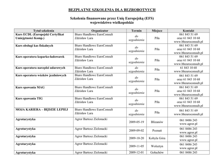 BEZPŁATNE SZKOLENIA DLA BEZROBOTNYCH Szkolenia finansowane przez Unię Europejską (EFS) województwo wielkopolskie Tytuł szkolenia Kurs ECDL (Europejski Certyfikat Umiejętności Komp.) Organizator Biuro Handlowe EuroConsult Zdzisław Lara Kurs obsługi kas fiskalnych Biuro Handlowe EuroConsult Zdzisław Lara Kurs operatora koparko-ładowarek Kurs operatora narzędzi udarowych Kurs operatora wózków jezdniowych Kurs spawania MAG Kurs spawania TIG Biuro Handlowe EuroConsult Zdzisław Lara Biuro Handlowe EuroConsult Zdzisław Lara Biuro Handlowe EuroConsult Zdzisław Lara Biuro Handlowe EuroConsult Zdzisław Lara Biuro Handlowe EuroConsult Zdzisław Lara MOJA KARIERA – BĘDZIE LEPIEJ Biuro Handlowe EuroConsult Zdzisław Lara Agroturystyka Agror Bartosz Zielonacki Agroturystyka Agror Bartosz Zielonacki Agroturystyka Agror Bartosz Zielonacki Agroturystyka Agror Bartosz Zielonacki Agroturystyka Agror Bartosz Zielonacki Termin Miejsce Kontakt 061 843 51 69 oraz 61 843 10 68 www.bheuroconsult.pl 061 843 51 69 oraz 61 843 10 68 www.bheuroconsult.pl 061 843 51 69 oraz 61 843 10 68 www.bheuroconsult.pl 61 843 10 68 www.bheuroconsult.pl 061 843 51 69 oraz 61 843 10 68 www.bheuroconsult.pl 061 843 51 69 oraz 61 843 10 68 www.bheuroconsult.pl 061 843 51 69 oraz 61 843 10 68 www.bheuroconsult.pl do uzgodnienia Piła do uzgodnienia Piła do uzgodnienia Piła do uzgodnienia Piła do uzgodnienia Piła do uzgodnienia Piła do uzgodnienia Piła do uzgodnienia Piła 061 843 51 69 www.bheuroconsult.pl 2009-05-19 Blizanów 061 8486 243 www.agror.pl 2009-09-02 Poznań 2009-10-20 Kobyla Góra 2009-11-05 Wolsztyn 2009-12-01 Gołuchów 061 8486 243 www.agror.pl 061 8486 243 www.agror.pl 061 8486 243 www.agror.pl 061 8486 243 Doradca ds. Jakości w Rolnictwie Agror Bartosz Zielonacki Doradca ds. Jakości w Rolnictwie Agror Bartosz Zielonacki Doradca ds. Jakości w Rolnictwie Agror Bartosz Zielonacki Doradca ds. Jakości w Rolnictwie Agror Bartosz Zielonacki Doradca ds. Pomocy z UE Agror Bartosz Zielonacki Doradca ds. Pomocy z UE Agror Bartosz Zielonacki Doradca ds. Pomocy z UE Agror Bartosz Zielonacki Doradca ds. Pomocy z UE Agror Bartosz Zielonacki Doradca ds. Promocji w Rolnictwie Agror Bartosz Zielonacki Doradca ds. Promocji w Rolnictwie Agror Bartosz Zielonacki Doradca ds. Promocji w Rolnictwie Agror Bartosz Zielonacki Doradca ds. Promocji w Rolnictwie Agror Bartosz Zielonacki Doradca ds. Rachunkowości Rolniczej Agror Bartosz Zielonacki Doradca ds. Rachunkowości Rolniczej Agror Bartosz Zielonacki Doradca ds. Rachunkowości Rolniczej Agror Bartosz Zielonacki Doradca ds. Rachunkowości Rolniczej Agror Bartosz Zielonacki Doradca ds. Rachunkowości Rolniczej Agror Bartosz Zielonacki Doradca ds. Środków do Produkcji Roślin Agror Bartosz Zielonacki www.agror.pl 061 8486 243 www.agror.pl 061 8486 243 www.agror.pl 061 8486 243 www.agror.pl 061 8486 243 www.agror.pl 061 8486 243 www.agror.pl 061 8486 243 www.agror.pl 061 8486 243 www.agror.pl 061 8486 243 www.agror.pl 061 8486 243 www.agror.pl 061 8486 243 www.agror.pl 061 8486 243 www.agror.pl 061 8486 243 www.agror.pl 061 8486 243 www.agror.pl 2009-06-24 Poznań 2009-09-09 Wolsztyn 2009-10-14 Skoki 2009-11-25 Goluchów 2009-05-11 Kobyla Góra 2009-09-10 Gołuchów 2009-10-29 Wolsztyn 2009-12-10 Skoki 2009-06-18 Skoki 2009-10-01 Blizanów 2009-11-12 Wolsztyn 2009-12-03 Poznań 2009-04-28 Blizanów 2009-06-08 Kobyla Góra 061 8486 243 www.agror.pl 2009-09-21 Gołuchów 2009-10-01 Wolsztyn 2009-11-25 Poznań 2009-05-04 Gołuchów 061 8486 243 www.agror.pl 061 8486 243 www.agror.pl 061 8486 243 www.agror.pl 061 8486 243 www.agror.pl Doradca ds. Środków do Produkcji Roślin Doradca ds. Środków do Produkcji Roślin Doradca ds. Środków do Produkcji Roślin Doradcy ds. GMO Agror Bartosz Zielonacki Doradcy ds. GMO Agror Bartosz Zielonacki Doradcy ds. GMO Agror Bartosz Zielonacki Doradcy ds. GMO Agror Bartosz Zielonacki Doradcy ds. GMO Agror Bartosz Zielonacki Otwieranie Nowej Firmy Agror Bartosz Zielonacki Otwieranie Nowej Firmy Agror Bartosz Zielonacki Otwieranie Nowej Firmy Agror Bartosz Zielonacki Otwieranie Nowej Firmy Agror Bartosz Zielonacki Agror Bartosz Zielonacki Agror Bartosz Zielonacki Agror Bartosz Zielonacki Otwieranie Nowej Firmy Agror Bartosz Zielonacki Otwieranie Nowej Firmy Agror Bartosz Zielonacki Otwieranie Nowej Firmy Agror Bartosz Zielonacki Podstawowa Umiejętność Obsługi Komputera Podstawowa Umiejętność Obsługi Komputera STUDIUM ZARZĄDZANIA KAPITAŁEM LUDZKIM – SZKOLENIA EFS Agror Bartosz Zielonacki Agror Bartosz Zielonacki 2009-06-15 Wolsztyn 2009-10-05 Blizanów 2009-11-17 Poznań 2009-04-27 Skoki 2009-05-27 Poznań 2009-09-15 Kobyla Góra 2009-10-06 Gołuchów 2009-11-03 Blizanów 2009-04-21 Poznań 2009-05-06 Wolsztyn 2009-06-03 Blizanów 2009-09-23 Skoki 2009-11-02 Kobyla Góra 2009-12-07 Gołuchów 2009-04-15 Skoki 2009-04-15 Skoki 2009-06-22 Wolsztyn 2009-09-08 Poznań MOST WANTED! 061 8486 243 www.agror.pl 061 8486 243 www.agror.pl 061 8486 243 www.agror.pl 061 8486 243 www.agror.pl 061 8486 243 www.agror.pl 061 8486 243 www.agror.pl 061 8486 243 www.agror.pl 061 8486 243 www.agror.pl 061 8486 243 www.agror.pl 061 8486 243 www.agror.pl 061 8486 243 www.agror.pl 061 8486 243 www.agror.pl 061 8486 243 www.agror.pl 061 8486 243 www.agror.pl 061 8486 243 www.agror.pl 061 8486 243 www.agror.pl 061 8486 243 www.agror.pl 22 825 00 88 w 122 www.mostwanted.pl Doradca ds. Jakości w Rolnictwie Agror Bartosz Zielonacki Dorada ds. Promocji w Rolnictwie Agror Bartosz Zielonacki Doradca ds. Rachunkowości Rolniczej Kobyla Góra 061 8486 243 www.agror.pl 2010-01-01 Poznań 061 8486 243 www.agror.pl 2010-01-01 Wągrowiec 061 8486 243 www.agror.pl 2010-01-01 Kobyla Góra 2010-01-01 Skoki 2010-01-01 Gołuchów 2010-01-01 Kobyla Góra 2010-01-01 Blizanów 2009-05-11 Poznań 2009-04-28 Poznań do uzgodnienia Poznań do uzgodnienia Poznań do uzgodnienia Poznań Do uzgodnienia Poznań 061 8486 243 www.agror.pl 061 8486 243 www.agror.pl 061