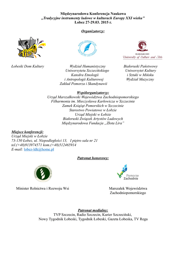Międzynarodowa Konferencja Naukowa ,,Tradycyjne instrumenty ludowe w kulturach Europy XXI wieku’’ Łobez 27-29.03. 2015 r. Organizatorzy: Łobeski Dom Kultury Wydział Humanistyczny Uniwersytetu Szczecińskiego Katedra Etnologii i Antropologii Kulturowej Zakład Pomorza i Skandynawii Białoruski Państwowy Uniwersytet Kultury i Sztuki w Mińsku Wydział Muzyczny Współorganizatorzy: Urząd Marszałkowski Województwa Zachodniopomorskiego Filharmonia im. Mieczysława Karłowicza w Szczecinie Zamek Książąt Pomorskich w Szczecinie Starostwo Powiatowe w Łobzie Urząd Miejski w Łobzie Białoruski Związek Artystów Ludowych Międzynarodowa Fundacja „Złota Lira” Miejsce konferencji: Urząd Miejski w Łobzie 73-150 Łobez, ul. Niepodległości 13, I piętro sala nr 21 tel.(+48)913974571 kom.(+48)512465914 E-mail: [email protected] Patronat honorowy: Minister Rolnictwa i Rozwoju Wsi Marszałek Województwa Zachodniopomorskiego Patronat medialny: TVP Szczecin, Radio Szczecin, Kurier Szczeciński, Nowy Tygodnik Łobeski, Tygodnik Łobeski, Gazeta Łobeska, TV Rega Wprowadzenie tematyczne Wiedza o instrumentarium ludowym jest ciągle jeszcze nie wystarczająca, przynajmniej w Polsce, ponieważ badania naukowe w tej dziedzinie rozpoczęto dużo później niż np. badania pieśni. Konferencja poświęcona ludowym instrumentom muzycznym we współczesnej Europie jest kontynuacją zaproponowanej przez Ernsta Emsheimera i Ericha Stockmanna w drugiej połowie XX w. tworzenia i uaktualniania wiedzy o muzycznych instrumentach ludowych. Ideą i celem konferencji jest współczesny opis procesów zachodzących w instrumentarium ludowym w Europie. Zamierzenia te możemy osiągnąć, przynajmniej w części, przybliżając aktualną wiedzę o ludowych instrumentach muzycznych używanych dawniej i aktualnie w praktyce muzycznej różnych krajów europejskich. Ważnym założeniem konferencji jest wskazanie dotychczasowych osiągnięć oraz bieżących kierunków badawczych w instrumentologii jako dyscyplinie naukowej. Wygłoszone referaty naukowe ukażą się w publikacji wydanej przez Wydawnictwo Naukowe Uniwersytetu Szczecińskiego. Tematyka konferencji obejmuje następujące zagadnienia badawcze: - historia wybranych instrumentów ludowych w danym regionie lub kraju, - opis technik gry na wybranych instrumentach, - twórcy instrumentów ludowych, dawni i współcześni, techniki wykonania, - zastosowanie poszczególnych instrumentów w dawnej i współczesnej praktyce instrumentalnej, - najpopularniejsze instrumenty ludowe w danym kraju lub regionie, - ludowe instrumenty muzyczne i ich modyfikacje. 27.03.2015 r. (piątek) do godz.1400 przyjazd naukowców i zaproszonych gości rejestracja Łobeski Dom Kultury, ul. Niepodległości 52, tel.: 91 397 45 71, 512 465 914 Miejsce konferencji: Urząd Miejski w Łobzie ul. Niepodległości 13, I piętro sala nr 21 godz. 1600 – Inauguracja Międzynarodowej Konferencji Naukowej ,,Tradycyjne instrumenty ludowe w kulturach Europy XXI wieku’’ Uwaga ! Konferencja jest składową większej całości pt. Międzynarodowe Spotkania z Folklorem. Łobeska Baba Wielkanocna i z uwagi na dużą liczbę uczestników tego artystycznego przedsięwzięcia kolejność wystąpień naukowych może ulec zmianie. Referaty wygłoszą: 1615-1635 prof. Aleksandr Karatiejew, Białoruski Państwowy Uniwersytet Kultury i Sztuki w Mińsku. Katedra Muzyki Dętej, Sztuki Estradowej, Białoruskiej i Ogólnoświatowej Kultury, (Białoruś) „Białoruskie ludowe instrumenty dęte jako obiekt badań naukowych narodowego i ogólnoświatowego etnoinstrumentoznawstwa w kontekście kultury europejskiej”. 1635-1655 mgr Dariusz Ledzion, Dyrektor Łobeskiego Domu Kultury (Polska) „Prywatne zbiory instrumentów muzycznych Stanisława Poprawskiego w Sławnie”. 1655-1715 mgr Olga Baglai, Dyrygent Zespołu Bandurzystów ,,Kobzaroczki” wykładowca Lwowskiej Szkoły Muzyki, Plastyki i Sztuki nr 5 w Lwowie (Ukraina) „Bandura, fenomen Ukrainy 1715-1735 prof. Igor Manguszew, Białoruski Państwowy Uniwersytet Kultury i Sztuki w Mińsku. Katedra Muzyki Dętej. (Białoruś) „Problemy popularyzacji białoruskiego ludowego instrumentarium dętego w nawiązaniu do postfolklorystycznej praktyki gry (w kontekście koncertowej działalności Katedry Białoruskich Ludowych Instrumentów Dętych „Dudy”, zespołu białoruskich instrumentów ludowych „Carduus” i zespołu białoruskich ludowych instrumentów dętych „Dudaczka”)”. 1735- 1815 mgr Dulusz Timur Dyrtyk -Opuylaa zasłużony artysta Republiki Tuwa, Dyrektor Ogólnokształcącej Podstawowej Szkoły MuzycznoArtystycznej im. R. D. Kendenbila, Dyrtyk Opuylaa, laureat międzynarodowych i krajowych konkursów, Republika Tuwa miasto Kyzył (Federacja Rosyjska) „Typologia tuwińskich ludowych instrumentów dętych w kontekścieświatowego instrumentoznawstwa i popularyzacji tradycyjnej kultury ludowej”. 1815- 1835 dr Piotr Klafkowski, Uniwersytet Szczeciński. Katedra Etnologii i Antropologii Kulturowej. (Polska) „Hej podstrójmy pod struny – instrumenty z rodziny skrzypiec w norweskiej kulturze ludowej i nie tylko”. 1835- 1855 mgr Siergiej Jaruk, laureat międzynarodowych oraz republikańskich konkursów i festiwali. (Mołodeczno, Białoruś) „Białoruskie ludowe instrumenty muzyczne w twórczości Janka Kupały. Muzyczna spuścizna poety”. 29.03.2015 r. (niedziela) Miejsce konferencji: Urząd Miejski w Łobzie ul. Niepodległości 13, I piętro sala nr 21 Referaty wygłoszą: 1000- 1020 prof. Oleg Lebiedziński, Wojskowy Uniwersytet Moskiewski (Rosja) „Historia i rozwój „dźwięcznych gęśli” jako jednego z głównych instrumentów Rosji” 1020-1040 prof. Bogdan Matławski, Uniwersytet Szczeciński. Katedra Etnologii i Antropologii Kulturowej . (Polska) „Ludowa sztuka lutnicza na Pomorzu Zachodnim na początku XXI w. Stanisław Mazurek.” 1040-1100 Oleg Siwyj Główny Inspektor Regionalnego Centrum Sztuk