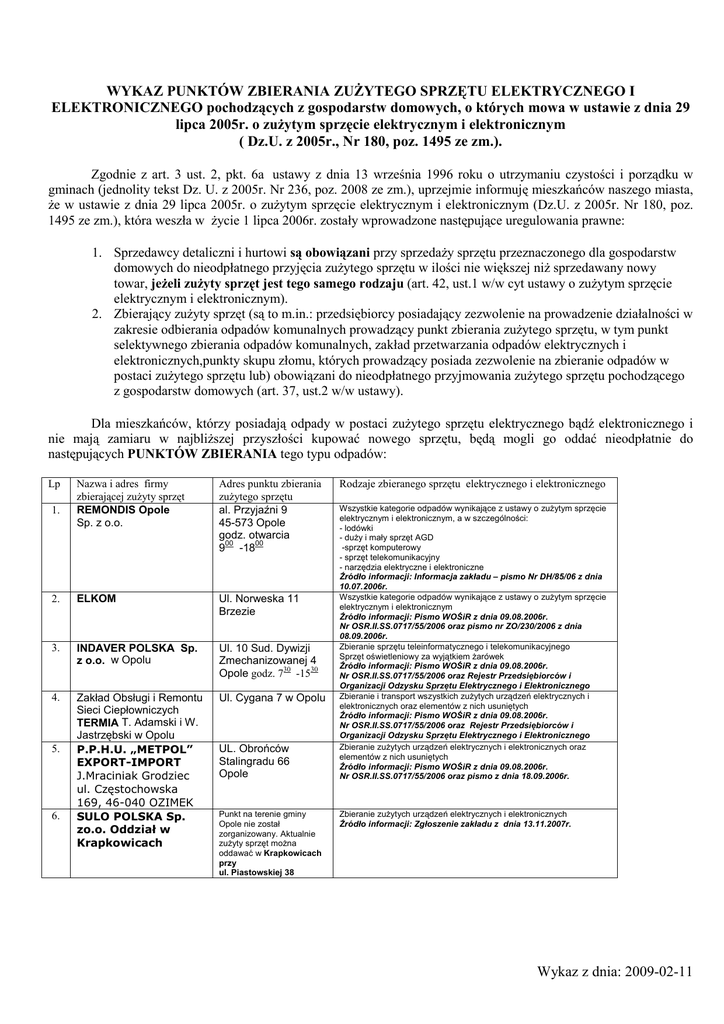WYKAZ PUNKTÓW ZBIERANIA ZUśYTEGO SPRZĘTU ELEKTRYCZNEGO I ELEKTRONICZNEGO pochodzących z gospodarstw domowych, o których mowa w ustawie z dnia 29 lipca 2005r. o zuŜytym sprzęcie elektrycznym i elektronicznym ( Dz.U. z 2005r., Nr 180, poz. 1495 ze zm.). Zgodnie z art. 3 ust. 2, pkt. 6a ustawy z dnia 13 września 1996 roku o utrzymaniu czystości i porządku w gminach (jednolity tekst Dz. U. z 2005r. Nr 236, poz. 2008 ze zm.), uprzejmie informuję mieszkańców naszego miasta, Ŝe w ustawie z dnia 29 lipca 2005r. o zuŜytym sprzęcie elektrycznym i elektronicznym (Dz.U. z 2005r. Nr 180, poz. 1495 ze zm.), która weszła w Ŝycie 1 lipca 2006r. zostały wprowadzone następujące uregulowania prawne: 1. Sprzedawcy detaliczni i hurtowi są obowiązani przy sprzedaŜy sprzętu przeznaczonego dla gospodarstw domowych do nieodpłatnego przyjęcia zuŜytego sprzętu w ilości nie większej niŜ sprzedawany nowy towar, jeŜeli zuŜyty sprzęt jest tego samego rodzaju (art. 42, ust.1 w/w cyt ustawy o zuŜytym sprzęcie elektrycznym i elektronicznym). 2. Zbierający zuŜyty sprzęt (są to m.in.: przedsiębiorcy posiadający zezwolenie na prowadzenie działalności w zakresie odbierania odpadów komunalnych prowadzący punkt zbierania zuŜytego sprzętu, w tym punkt selektywnego zbierania odpadów komunalnych, zakład przetwarzania odpadów elektrycznych i elektronicznych,punkty skupu złomu, których prowadzący posiada zezwolenie na zbieranie odpadów w postaci zuŜytego sprzętu lub) obowiązani do nieodpłatnego przyjmowania zuŜytego sprzętu pochodzącego z gospodarstw domowych (art. 37, ust.2 w/w ustawy). Dla mieszkańców, którzy posiadają odpady w postaci zuŜytego sprzętu elektrycznego bądź elektronicznego i nie mają zamiaru w najbliŜszej przyszłości kupować nowego sprzętu, będą mogli go oddać nieodpłatnie do następujących PUNKTÓW ZBIERANIA tego typu odpadów: Lp Nazwa i adres firmy zbierającej zuŜyty sprzęt REMONDIS Opole Sp. z o.o. Adres punktu zbierania zuŜytego sprzętu al. Przyjaźni 9 45-573 Opole godz. otwarcia 00 00 9 -18 2. ELKOM Ul. Norweska 11 Brzezie 3. INDAVER POLSKA Sp. z o.o. w Opolu Ul. 10 Sud. Dywizji Zmechanizowanej 4 Opole godz. 730 -1530 4. Zakład Obsługi i Remontu Sieci Ciepłowniczych TERMIA T. Adamski i W. Jastrzębski w Opolu P.P.H.U. „METPOL” EXPORT-IMPORT J.Mraciniak Grodziec ul. Częstochowska 169, 46-040 OZIMEK SULO POLSKA Sp. zo.o. Oddział w Krapkowicach Ul. Cygana 7 w Opolu 1. 5. 6. UL. Obrońców Stalingradu 66 Opole Punkt na terenie gminy Opole nie został zorganizowany. Aktualnie zuŜyty sprzęt moŜna oddawać w Krapkowicach przy ul. Piastowskiej 38 Rodzaje zbieranego sprzętu elektrycznego i elektronicznego Wszystkie kategorie odpadów wynikające z ustawy o zuŜytym sprzęcie elektrycznym i elektronicznym, a w szczególności: - lodówki - duŜy i mały sprzęt AGD -sprzęt komputerowy - sprzęt telekomunikacyjny - narzędzia elektryczne i elektroniczne Źródło informacji: Informacja zakładu – pismo Nr DH/85/06 z dnia 10.07.2006r. Wszystkie kategorie odpadów wynikające z ustawy o zuŜytym sprzęcie elektrycznym i elektronicznym Źródło informacji: Pismo WOŚiR z dnia 09.08.2006r. Nr OSR.II.SS.0717/55/2006 oraz pismo nr ZO/230/2006 z dnia 08.09.2006r. Zbieranie sprzętu teleinformatycznego i telekomunikacyjnego Sprzęt oświetleniowy za wyjątkiem Ŝarówek Źródło informacji: Pismo WOŚiR z dnia 09.08.2006r. Nr OSR.II.SS.0717/55/2006 oraz Rejestr Przedsiębiorców i Organizacji Odzysku Sprzętu Elektrycznego i Elektronicznego Zbieranie i transport wszystkich zuŜytych urządzeń elektrycznych i elektronicznych oraz elementów z nich usuniętych Źródło informacji: Pismo WOŚiR z dnia 09.08.2006r. Nr OSR.II.SS.0717/55/2006 oraz Rejestr Przedsiębiorców i Organizacji Odzysku Sprzętu Elektrycznego i Elektronicznego Zbieranie zuŜytych urządzeń elektrycznych i elektronicznych oraz elementów z nich usuniętych Źródło informacji: Pismo WOŚiR z dnia 09.08.2006r. Nr OSR.II.SS.0717/55/2006 oraz pismo z dnia 18.09.2006r. Zbieranie zuŜytych urządzeń elektrycznych i elektronicznych Źródło informacji: Zgłoszenie zakładu z dnia 13.11.2007r. Wykaz z dnia: 2009-02-11 7. TRANS-FORMERS Wrocław Punkt na terenie gminy Opole nie został zorganizowany. Aktualnie zuŜyty sprzęt moŜna oddawać na Bielanach Wrocławskich ul. Atramentowa 10 55-040 Kobierzyce Zbieranie zuŜytych urządzeń elektrycznych i elektronicznych Źródło informacji: Pismo nr 354/07 z dnia 22.11.2007r. 8. REMONDIS Tarnowskie Góry Zbieranie zuŜytych urządzeń elektrycznych i elektronicznych Źródło informacji: Pismo nr DT/3923/2007 z dnia 19.11.2007r. 9. Wywóz Nieczystości oraz Przewóz Ładunków Wiesław Strach Punkt zbierania: al. Przyjaźni 9 45-573 Opole godz. otwarcia 900 -1800 Punkt zbierania: Ul. Chabrów 50A 45-221 Opole Zbieranie zuŜytych urządzeń elektrycznych i elektronicznych Źródło informacji: Pismo bez numeru z dnia 15.10.2007r. uzupełnionego pismem z dnia 21.11.2007r. Ul. Kosmowskiej 6/94 10. Zakład Komunalny Sp. z o.o. Ul. Podmiejska 69 45-574 Opole Zbieranie zuŜytych urządzeń elektrycznych i elektronicznych Źródło informacji: Pismo numer W/63/SO/2009 z dnia 5.02.2009r. Dodatkowe informacje moŜna uzyskać w Urzędzie Miasta Opola, w Wydziale InŜynierii Miejskiej na pl. Wolności 7-8, pokój nr 108 (I piętro), w godzinach urzędowania tj. od 7:30 do 15:30 lub pod numerem telefonu 077/4511-801. Wykaz przygotowała: Iwona Kowalczuk Wydział InŜynierii Miejskiej Wykaz zatwierdził: Naczelnik Wydziału Stanisław Głębocki Wykaz z dnia: 2009-02-11