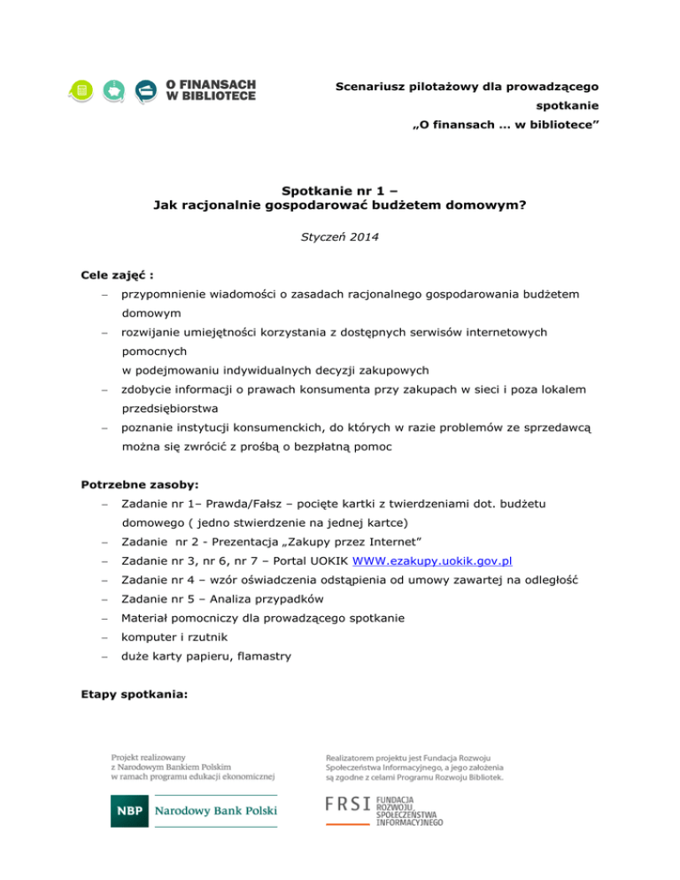 Scenariusz pilotażowy dla prowadzącego spotkanie „O finansach … w bibliotece” Spotkanie nr 1 – Jak racjonalnie gospodarować budżetem domowym? Styczeń 2014 Cele zajęć : − przypomnienie wiadomości o zasadach racjonalnego gospodarowania budżetem domowym − rozwijanie umiejętności korzystania z dostępnych serwisów internetowych pomocnych w podejmowaniu indywidualnych decyzji zakupowych − zdobycie informacji o prawach konsumenta przy zakupach w sieci i poza lokalem przedsiębiorstwa − poznanie instytucji konsumenckich, do których w razie problemów ze sprzedawcą można się zwrócić z prośbą o bezpłatną pomoc Potrzebne zasoby: − Zadanie nr 1– Prawda/Fałsz – pocięte kartki z twierdzeniami dot. budżetu domowego ( jedno stwierdzenie na jednej kartce) − Zadanie nr 2 - Prezentacja „Zakupy przez Internet” − Zadanie nr 3, nr 6, nr 7 – Portal UOKIK WWW.ezakupy.uokik.gov.pl − Zadanie nr 4 – wzór oświadczenia odstąpienia od umowy zawartej na odległość − Zadanie nr 5 – Analiza przypadków − Materiał pomocniczy dla prowadzącego spotkanie − komputer i rzutnik − duże karty papieru, flamastry Etapy spotkania: O finansach… w bibliotece. Scenariusz pilotażowy dla prowadzącego spotkanie. Moduł 1 1. Etap nr 1 – Rozpoczęcie spotkania. Powtórzenie wiadomości dot. budżetu domowego oraz zasad racjonalnego gospodarowania finansami osobistymi, ok. 15 min. 2. Etap nr 2 – Zakupy na odległość (istota, plusy i minusy; prawa i obowiązki sprzedawcy i konsumenta), ok. 40 min. 3. Etap nr 3 – Zakupy poza lokalem przedsiębiorstwa (istota, prawa i obowiązki sprzedawcy i konsumenta), ok. 25 min . 4. Etap nr 4 – Analiza przypadków, ok. 60 min. 5. Etap nr 5 – Instytucje konsumenckie, ok. 20 min 6. Etap nr 6 – Podsumowanie spotkania, ok. 10 min Przebieg spotkania: 1. Przywitaj uczestników i powiedz, że tematem spotkania będzie powtórzenie i pogłębienie wiadomości na temat gospodarowania finansami osobistymi. Poproś o aktywny udział, dzielenie się własnym doświadczeniem, konstruktywne komentarze, zgłaszanie pytań w razie wątpliwości czy niezrozumienia prezentowanego zagadnienia. 2. Zaproponuj uczestnikom wykonanie ćwiczenia przypominającego i porządkującego podstawowe wiadomości dotyczące budżetu domowego, z którymi uczestnicy zapoznali się w module nr 1 kursu e-learningowego „Jak racjonalnie gospodarować budżetem domowym?”. 3. Przygotuj na kartkach przykłady twierdzeń dot. budżetu domowego ( jedno stwierdzenie na jednej kartce) i rozdaj je losowo uczestnikom (zadanie nr 1). Następnie poproś, aby po kolei każda osoba przeczytała głośno zdanie i oceniła, czy jest ono prawdziwe czy fałszywe. Jeśli stwierdzenie jest błędne, wspólnie z uczestnikami spróbuj je sformułować poprawnie. Ćwiczenie uczestnicy mogą również wykonać pracując w parach, małych grupach lub możesz odczytywać stwierdzenia na forum sali, prosząc o odpowiedź na pytanie „Czy zdanie jest prawdziwe czy fałszywe?” 4. Przypomnij, że w trakcie kursu e- learningowego omówione zostały zasady racjonalnego gospodarowania budżetem domowym. Poproś o przypomnienie co najmniej pięciu praktycznych sposobów sprzyjających racjonalnemu gospodarowaniu finansami osobistymi (np. porównuj ceny produktów w różnych sklepach; płać rachunki w terminie- unikniesz płacenia karnych odsetek; zachowaj dyscyplinę w robieniu zakupów; na zakupy chodź z listą; nie ulegaj reklamom i zachciankom, kupuj rzeczy potrzebne; odkładaj nawet niewielkie nadwyżki finansowe; kontroluj swoje wydatki regularnie; ogranicz wydatki zmieniając nawyki np. dotyczące korzystania z mediów, używek itp.). Zachęć uczestników do podawania własnych przykładów i dzielenia się doświadczeniem. 2 O finansach… w bibliotece. Scenariusz pilotażowy dla prowadzącego spotkanie. Moduł 1 5. Zwróć uwagę, czy pojawiły się wypowiedzi dotyczące tego, gdzie i jak robimy zakupy. Przypomnij, że w podjęciu racjonalnych decyzji zakupowych pomocne mogą być dostępne w Internecie porównywarki cen. W trakcie realizacji modułu nr 1 kursu e-learningowego uczestnicy poznali dostępne serwisy internetowe pomocne w planowaniu wydatków i podejmowaniu indywidualnych decyzji zakupowych np. WWW.ceneo.pl, WWW.opineo.pl, WWW.cokupic.pl, WWW.allegro.pl. Zapytaj uczestników, czy korzystali z poznanych narzędzi? Czy porównywarki były przydatne w planowaniu i robieniu zakupów? W jakim zakresie? (np. porównanie cen, odszukanie sklepu najbliżej miejsca zamieszkania, poznanie opinii innych osób o produkcie) Poproś ochotników o krótkie wypowiedzi. Podkreśl, że Polacy coraz częściej kupują towary korzystając z usług sklepów internetowych czy też serwisów aukcyjnych dostępnych w Internecie. Porozmawiaj z uczestnikami o ich doświadczeniach w robieniu zakupów na odległość tzn. za pośrednictwem telefonu, Internetu (np. co kupowali, na co zwracali uwagę wybierając towar/sprzedawcę, czy zakupy w sieci spełniły ich oczekiwania itp.). Zwróć uwagę na podawane argumenty „za” i „przeciw” zakupom w sieci. Możesz zapisywać je na tablicy w dwóch kolumnach: Plusy/Minusy e-zakupów. Podsumowując wypowiedzi uczestników zwróć uwagę, które argumenty przeważały, jaki miały charakter? + - - wygoda - długi czas oczekiwana na zamówiony - możliwość złożenia zamówienia o produkt dowolnej porze - rozbieżność pomiędzy towarem na - oszczędność czasu zdjęciu a towarem w rzeczywistości - konkurencyjne ceny - brak możliwości przymierzenia, - nieograniczony dostęp do różnych sprawdzenia, wypróbowania produktu produktów i sklepów - anonimowość - możliwość zapoznawania się z informacjami o wybranym towarze tak długo jak tylko chcemy - możliwość poznania opinii innych konsumentów 6. Zapytaj uczestników: czy ich zdaniem uprawnienia konsumentów zawierających umowy przez Internet różnią się od upr