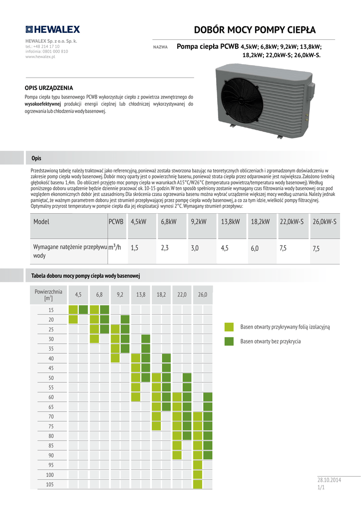 DOBÓR MOCY POMPY CIEPŁA HEWALEX Sp. z o.o. Sp. k. tel.: +48 214 17 10 infolinia: 0801 000 810 www.hewalex.pl NAZWA Pompa ciepła PCWB 4,5kW; 6,8kW; 9,2kW; 13,8kW; 18,2kW; 22,0kW-S; 26,0kW-S. OPIS URZĄDZENIA Pompa ciepła typu basenowego PCWB wykorzystuje ciepło z powietrza zewnętrznego do wysokoefektywnej produkcji energii cieplnej lub chłodniczej wykorzystywanej do ogrzewania lub chłodzenia wody basenowej. Opis Przedstawioną tabelę należy traktować jako referencyjną, ponieważ została stworzona bazując na teoretycznych obliczeniach i zgromadzonym doświadczeniu w zakresie pomp ciepła wody basenowej. Dobór mocy oparty jest o powierzchnię basenu, ponieważ strata ciepła przez odparowanie jest największa. Założono średnią głębokość basenu 1,4m. Do obliczeń przyjęto moc pompy ciepła w warunkach A15°C/W26°C (temperatura powietrza/temperatura wody basenowej). Według poniższego doboru urządzenie będzie dziennie pracować ok. 10-15 godzin. W ten sposób spełniony zostanie wymagany czas filtrowania wody basenowej oraz pod względem ekonomicznych dobór jest uzasadniony. Dla skrócenia czasu ogrzewania basenu można wybrać urządzenie większej mocy według uznania. Należy jednak pamiętać, że ważnym parametrem doboru jest strumień przepływającej przez pompę ciepła wody basenowej, a co za tym idzie, wielkość pompy filtracyjnej. Optymalny przyrost temperatury w pompie ciepła dla jej eksploatacji wynosi 2°C. Wymagany strumień przepływu: Model PCWB Wymagane natężenie przepływu m³/h wody 4,5kW 6,8kW 9,2kW 13,8kW 18,2kW 22,0kW-S 26,0kW-S 1,5 2,3 3,0 4,5 6,0 7,5 7,5 Tabela doboru mocy pompy ciepła wody basenowej Powierzchnia [m2] 4,5 6,8 9,2 13,8 18,2 22,0 26,0 15 20 25 Basen otwarty przykrywany folią izolacyjną 30 Basen otwarty bez przykrycia 35 40 45 50 55 60 65 70 75 80 85 90 95 100 105 28.10.2014 1/1