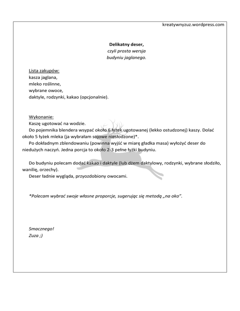kreatywnyzuz.wordpress.com Delikatny deser, czyli prosta wersja budyniu jaglanego. Lista zakupów: kasza jaglana, mleko roślinne, wybrane owoce, daktyle, rodzynki, kakao (opcjonalnie). Wykonanie: Kaszę ugotować na wodzie. Do pojemnika blendera wsypać około 6 łyżek ugotowanej (lekko ostudzonej) kaszy. Dolać około 5 łyżek mleka (ja wybrałam sojowe niesłodzone)*. Po dokładnym zblendowaniu (powinna wyjść w miarę gładka masa) wyłożyć deser do niedużych naczyń. Jedna porcja to około 2-3 pełne łyżki budyniu. Do budyniu polecam dodać kakao i daktyle (lub dżem daktylowy, rodzynki, wybrane słodziło, wanilię, orzechy). Deser ładnie wygląda, przyozdobiony owocami. *Polecam wybrać swoje własne proporcje, sugerując się metodą „na oko”. Smacznego! Zuza ;)