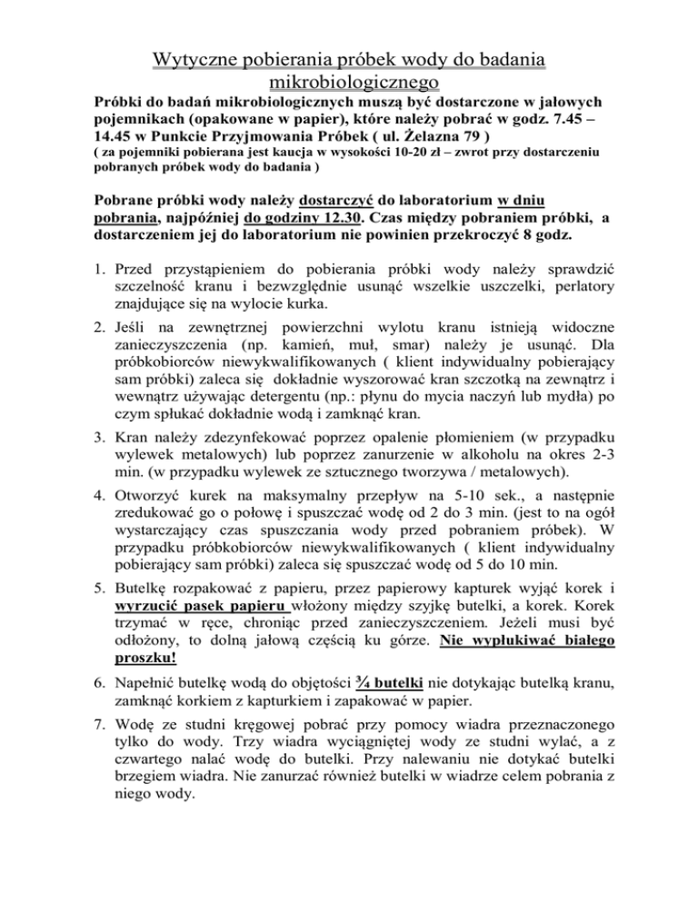 Wytyczne pobierania próbek wody do badania mikrobiologicznego Próbki do badań mikrobiologicznych muszą być dostarczone w jałowych pojemnikach (opakowane w papier), które należy pobrać w godz. 7.45 – 14.45 w Punkcie Przyjmowania Próbek ( ul. Żelazna 79 ) ( za pojemniki pobierana jest kaucja w wysokości 10-20 zł – zwrot przy dostarczeniu pobranych próbek wody do badania ) Pobrane próbki wody należy dostarczyć do laboratorium w dniu pobrania, najpóźniej do godziny 12.30. Czas między pobraniem próbki, a dostarczeniem jej do laboratorium nie powinien przekroczyć 8 godz. 1. Przed przystąpieniem do pobierania próbki wody należy sprawdzić szczelność kranu i bezwzględnie usunąć wszelkie uszczelki, perlatory znajdujące się na wylocie kurka. 2. Jeśli na zewnętrznej powierzchni wylotu kranu istnieją widoczne zanieczyszczenia (np. kamień, muł, smar) należy je usunąć. Dla próbkobiorców niewykwalifikowanych ( klient indywidualny pobierający sam próbki) zaleca się dokładnie wyszorować kran szczotką na zewnątrz i wewnątrz używając detergentu (np.: płynu do mycia naczyń lub mydła) po czym spłukać dokładnie wodą i zamknąć kran. 3. Kran należy zdezynfekować poprzez opalenie płomieniem (w przypadku wylewek metalowych) lub poprzez zanurzenie w alkoholu na okres 2-3 min. (w przypadku wylewek ze sztucznego tworzywa / metalowych). 4. Otworzyć kurek na maksymalny przepływ na 5-10 sek., a następnie zredukować go o połowę i spuszczać wodę od 2 do 3 min. (jest to na ogół wystarczający czas spuszczania wody przed pobraniem próbek). W przypadku próbkobiorców niewykwalifikowanych ( klient indywidualny pobierający sam próbki) zaleca się spuszczać wodę od 5 do 10 min. 5. Butelkę rozpakować z papieru, przez papierowy kapturek wyjąć korek i wyrzucić pasek papieru włożony między szyjkę butelki, a korek. Korek trzymać w ręce, chroniąc przed zanieczyszczeniem. Jeżeli musi być odłożony, to dolną jałową częścią ku górze. Nie wypłukiwać białego proszku! 6. Napełnić butelkę wodą do objętości ¾ butelki nie dotykając butelką kranu, zamknąć korkiem z kapturkiem i zapakować w papier. 7. Wodę ze studni kręgowej pobrać przy pomocy wiadra przeznaczonego tylko do wody. Trzy wiadra wyciągniętej wody ze studni wylać, a z czwartego nalać wodę do butelki. Przy nalewaniu nie dotykać butelki brzegiem wiadra. Nie zanurzać również butelki w wiadrze celem pobrania z niego wody. 8. Przy pobieraniu z węży gumowych lub tworzywa sztucznego, jeśli jest to możliwe, obciąć ok.10 cm końcówkę węża, koniec zanurzyć na max.10 min. w alkoholu. Potem spuszczać wodę przez okres od 5 do 10 min. i dopiero pobrać próbkę nie dotykając węża do butelki. Wytyczne pobierania próbek wody do badania fizykochemicznego Komplet pojemników do badania fizykochemicznego można pobrać w godz. 7. 45 – 14.45 w Punkcie Przyjmowania Próbek ( ul. Żelazna 79 ). ( za pojemniki pobierana jest kaucja w wysokości 20 zł – zwrot przy dostarczeniu pobranych próbek wody do badania ) 1. Punkt pobrania próbki wody należy przygotować w następujący sposób: odkręcić kran na maksymalny przepływ na 5–10 sek., celem zminimalizowania efektu dostania się do pobieranej próbki zawiesin uruchamianych przy gwałtownej zmianie ciśnienia w sieci (uderzenia hydrauliczne), a następnie po zredukowaniu przepływu wody o połowę spuszczać ją przez czas od 2 do 3 min. wolnym strumieniem, aby woda się nie rozpryskiwała. W przypadku próbkobiorców niewykwalifikowanych (klient indywidualny pobierający sam próbki) zaleca się spuszczać wodę od 5 do 10 min. 2. Następnie, butelki napełnić do pełna badaną wodą tzn. pod korek tak, aby po zamknięciu korkiem, nad powierzchnią wody (pod korkiem) nie pozostały pęcherzyki powietrza. Ogranicza to wzajemne oddziaływanie próbki z powietrzem oraz minimalizuje mieszanie podczas transportu. 3. Dopuszcza się również pobranie wody do badania w dwie butelki (1,5 l po wodzie mineralnej). Punkt pobrania próbki wody należy przygotować zgodnie z informacją zawartą w p.1. Butelki należy dobrze wypłukać badaną wodą i następnie napełnić je zgodnie z wymaganiami p. 2. UWAGA! Sposób napełniania butelek opisany w punktach 2, 3 dotyczy próbek wody badanych w rutynowym zakresie ( pozycje 1-13- wykazu parametrów). W przypadku konieczności wykonania badań pozostałych oznaczeń fizykochemicznych należy skontaktować się z laboratorium. Pobrane próbki wody należy dostarczyć do laboratorium w dniu pobrania, najpóźniej do godziny 12.30. W przypadku braku możliwości dostarczenia próbek w dniu ich pobrania, dopuszcza się przechowanie tych próbek w lodówce i dostarczenie ich do laboratorium następnego dnia.