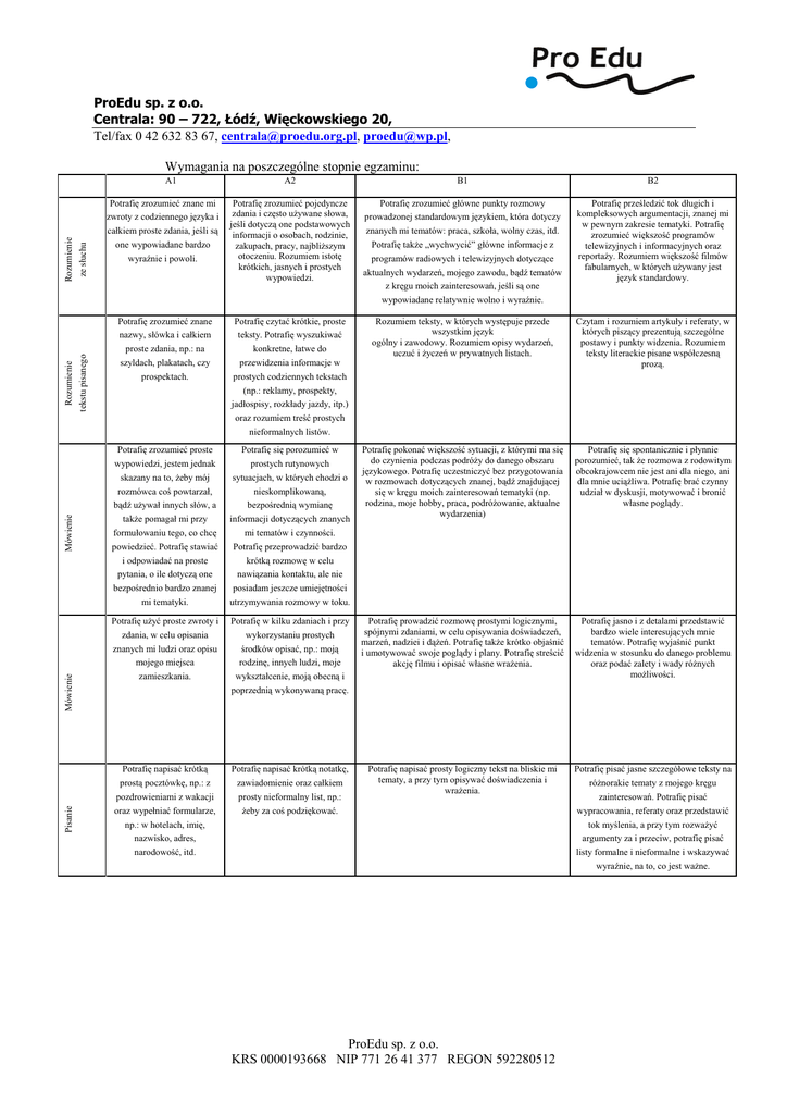 ProEdu sp. z o.o. Centrala: 90 – 722, Łódź, Więckowskiego 20, Tel/fax 0 42 632 83 67, [email protected], [email protected], Wymagania na poszczególne stopnie egzaminu: Rozumienie Mówienie Mówienie Pisanie ze słuchu tekstu pisanego Rozumienie A1 A2 B1 B2 Potrafię zrozumieć znane mi zwroty z codziennego języka i całkiem proste zdania, jeśli są one wypowiadane bardzo wyraźnie i powoli. Potrafię zrozumieć pojedyncze zdania i często używane słowa, jeśli dotyczą one podstawowych informacji o osobach, rodzinie, zakupach, pracy, najbliższym otoczeniu. Rozumiem istotę krótkich, jasnych i prostych wypowiedzi. Potrafię zrozumieć główne punkty rozmowy prowadzonej standardowym językiem, która dotyczy znanych mi tematów: praca, szkoła, wolny czas, itd. Potrafię także „wychwycić” główne informacje z programów radiowych i telewizyjnych dotyczące aktualnych wydarzeń, mojego zawodu, bądź tematów z kręgu moich zainteresowań, jeśli są one wypowiadane relatywnie wolno i wyraźnie. Potrafię prześledzić tok długich i kompleksowych argumentacji, znanej mi w pewnym zakresie tematyki. Potrafię zrozumieć większość programów telewizyjnych i informacyjnych oraz reportaży. Rozumiem większość filmów fabularnych, w których używany jest język standardowy. Potrafię zrozumieć znane nazwy, słówka i całkiem proste zdania, np.: na szyldach, plakatach, czy prospektach. Potrafię czytać krótkie, proste teksty. Potrafię wyszukiwać konkretne, łatwe do przewidzenia informacje w prostych codziennych tekstach (np.: reklamy, prospekty, jadłospisy, rozkłady jazdy, itp.) oraz rozumiem treść prostych nieformalnych listów. Rozumiem teksty, w których występuje przede wszystkim język ogólny i zawodowy. Rozumiem opisy wydarzeń, uczuć i życzeń w prywatnych listach. Czytam i rozumiem artykuły i referaty, w których piszący prezentują szczególne postawy i punkty widzenia. Rozumiem teksty literackie pisane współczesną prozą. Potrafię zrozumieć proste wypowiedzi, jestem jednak skazany na to, żeby mój rozmówca coś powtarzał, bądź używał innych słów, a także pomagał mi przy formułowaniu tego, co chcę powiedzieć. Potrafię stawiać i odpowiadać na proste pytania, o ile dotyczą one bezpośrednio bardzo znanej mi tematyki. Potrafię się porozumieć w prostych rutynowych sytuacjach, w których chodzi o nieskomplikowaną, bezpośrednią wymianę informacji dotyczących znanych mi tematów i czynności. Potrafię przeprowadzić bardzo krótką rozmowę w celu nawiązania kontaktu, ale nie posiadam jeszcze umiejętności utrzymywania rozmowy w toku. Potrafię pokonać większość sytuacji, z którymi ma się do czynienia podczas podróży do danego obszaru językowego. Potrafię uczestniczyć bez przygotowania w rozmowach dotyczących znanej, bądź znajdującej się w kręgu moich zainteresowań tematyki (np. rodzina, moje hobby, praca, podróżowanie, aktualne wydarzenia) Potrafię się spontanicznie i płynnie porozumieć, tak że rozmowa z rodowitym obcokrajowcem nie jest ani dla niego, ani dla mnie uciążliwa. Potrafię brać czynny udział w dyskusji, motywować i bronić własne poglądy. Potrafię użyć proste zwroty i zdania, w celu opisania znanych mi ludzi oraz opisu mojego miejsca zamieszkania. Potrafię w kilku zdaniach i przy wykorzystaniu prostych środków opisać, np.: moją rodzinę, innych ludzi, moje wykształcenie, moją obecną i poprzednią wykonywaną pracę. Potrafię prowadzić rozmowę prostymi logicznymi, spójnymi zdaniami, w celu opisywania doświadczeń, marzeń, nadziei i dążeń. Potrafię także krótko objaśnić i umotywować swoje poglądy i plany. Potrafię streścić akcję filmu i opisać własne wrażenia. Potrafię jasno i z detalami przedstawić bardzo wiele interesujących mnie tematów. Potrafię wyjaśnić punkt widzenia w stosunku do danego problemu oraz podać zalety i wady różnych możliwości. Potrafię napisać krótką prostą pocztówkę, np.: z pozdrowieniami z wakacji oraz wypełniać formularze, np.: w hotelach, imię, nazwisko, adres, narodowość, itd. Potrafię napisać krótką notatkę, zawiadomienie oraz całkiem prosty nieformalny list, np.: żeby za coś podziękować. Potrafię napisać prosty logiczny tekst na bliskie mi tematy, a przy tym opisywać doświadczenia i wrażenia. Potrafię pisać jasne szczegółowe teksty na różnorakie tematy z mojego kręgu zainteresowań. Potrafię pisać wypracowania, referaty oraz przedstawić tok myślenia, a przy tym rozważyć argumenty za i przeciw, potrafię pisać listy formalne i nieformalne i wskazywać wyraźnie, na to, co jest ważne. ProEdu sp. z o.o. KRS 0000193668 NIP 771 26 41 377 REGON 592280512